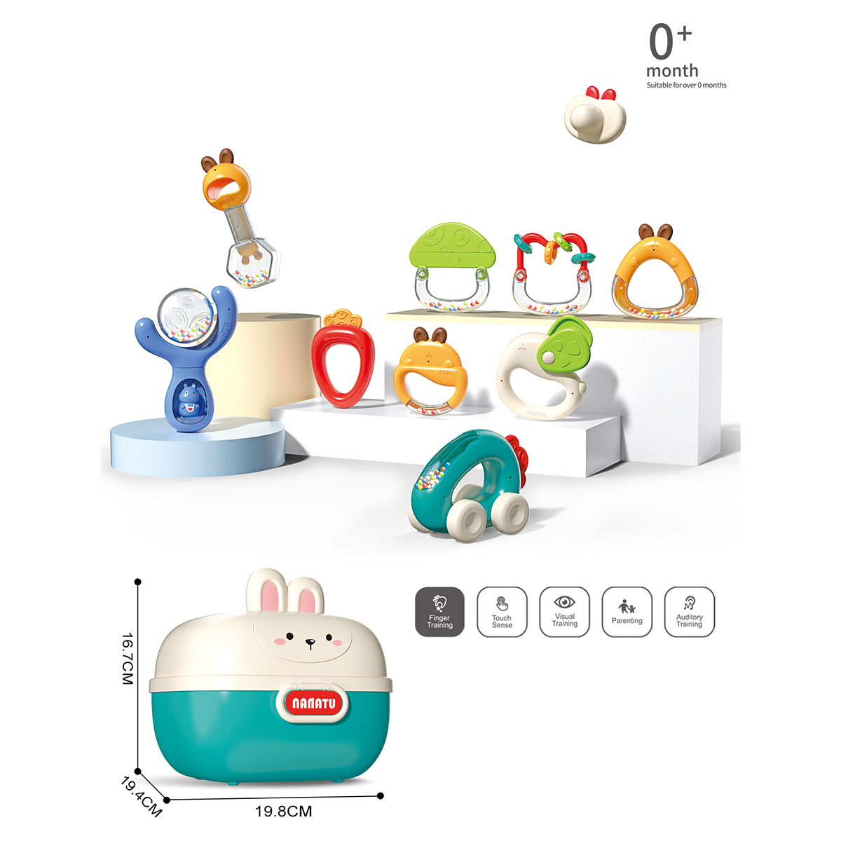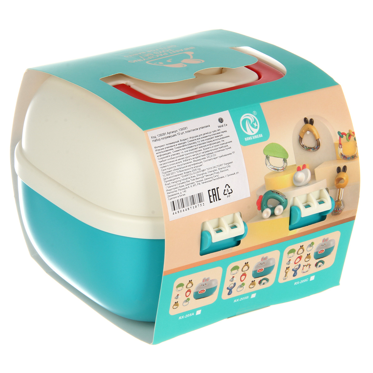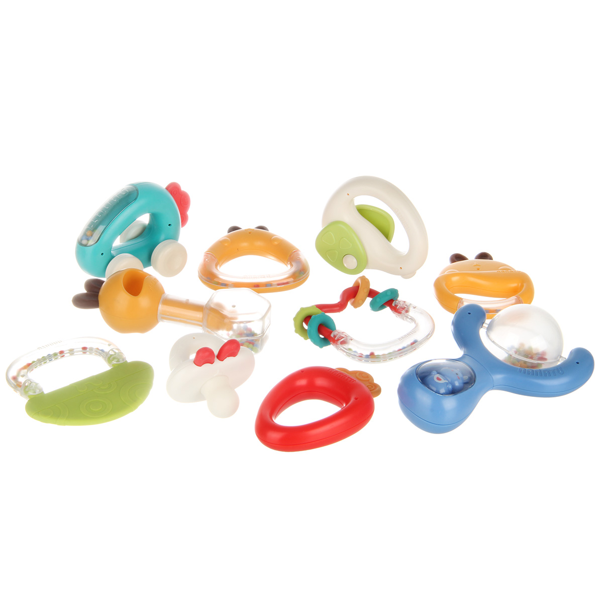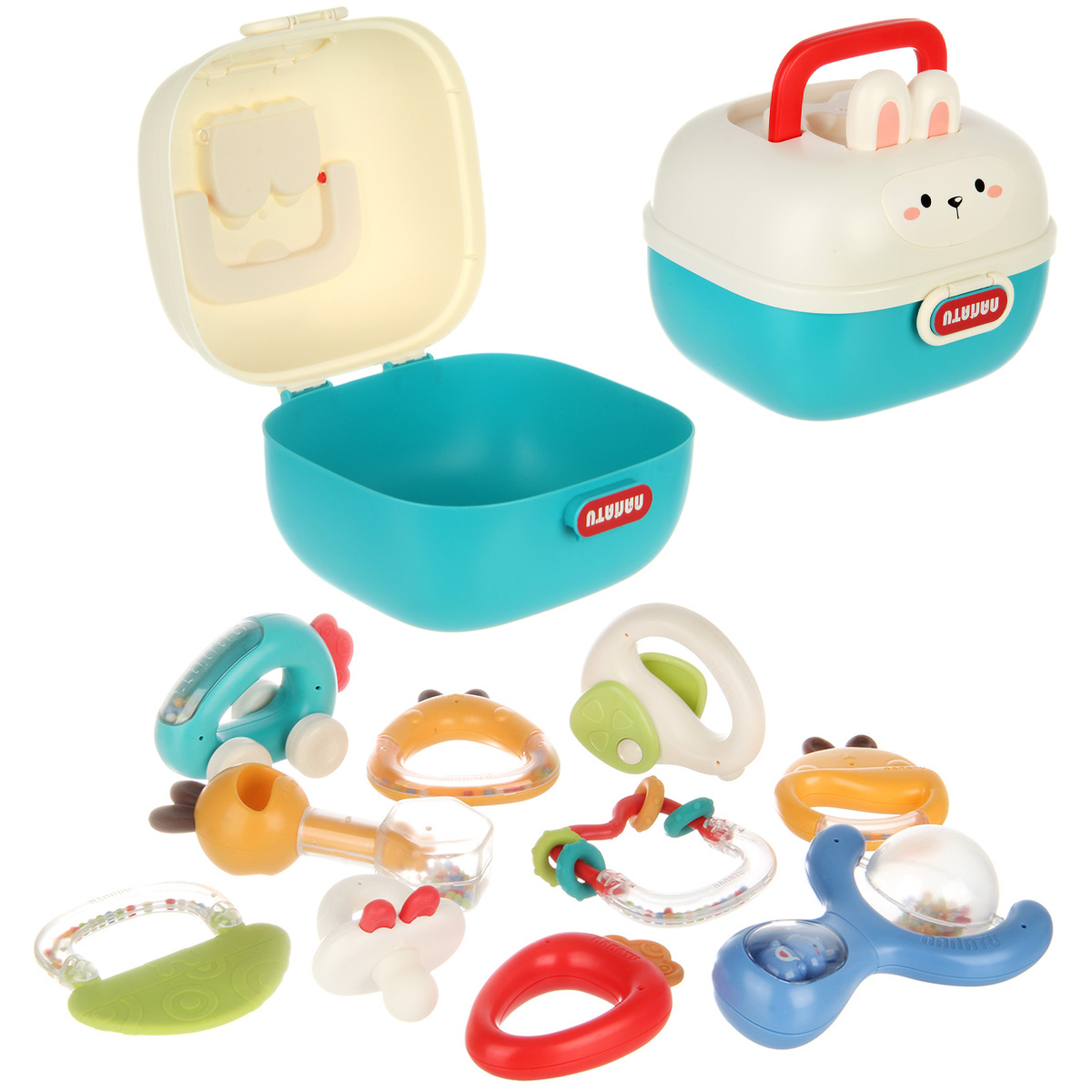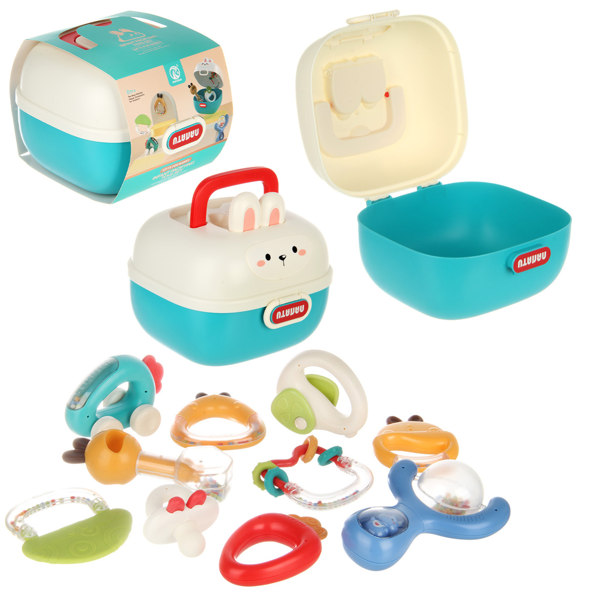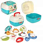 10 разноплановых погремушек для новорожденных в одном наборе. Игрушки для новорожденных имеют округлые формы, безопасно для ребёнка, удобные ручки, комфортно держать. Набор погремушек с прорезывателями для зубов для новорожденных изготовлен из качественных и долговечных материалов. Оформлен в яркой расцветке, привлекает внимание, хорошее качество исполнения. Все игрушки помещаются в миниатюрный чемоданчик с ручкой, закрывается на защелку. У чемоданчика поднимаются и опускаются ручки, удобно переносить. Развивающие игрушки станут замечательным подарком мальчику, девочке.
