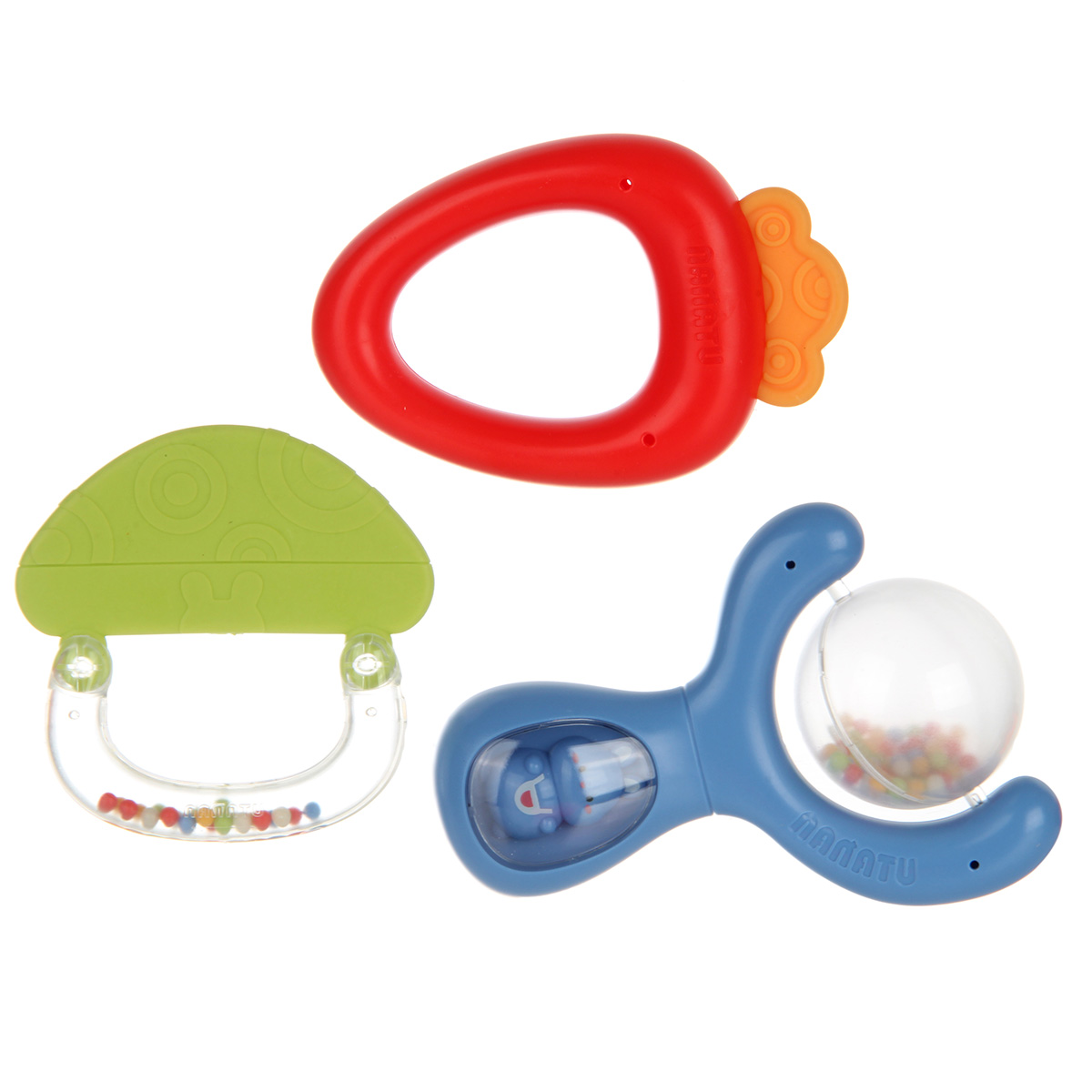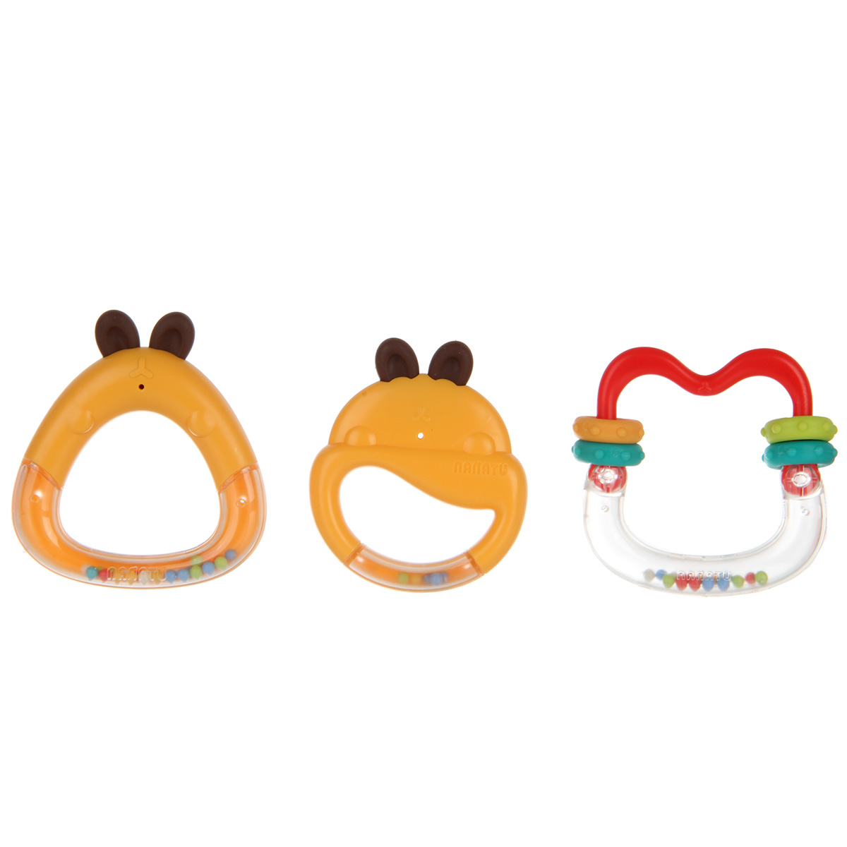 3 погремушки с ушками прорезывателями и разноцветными шариками внутри, шарики шумят, если игрушки потрясти.