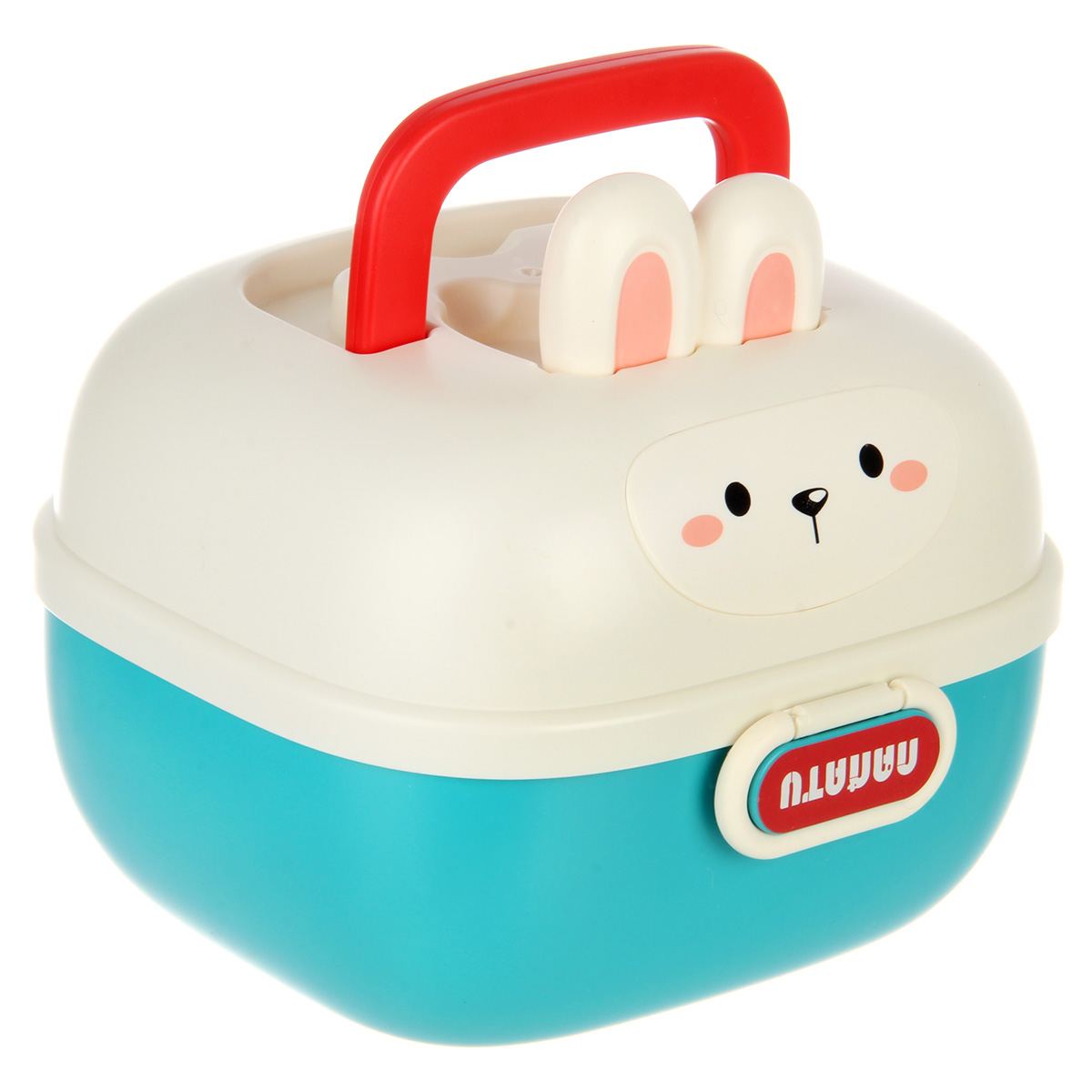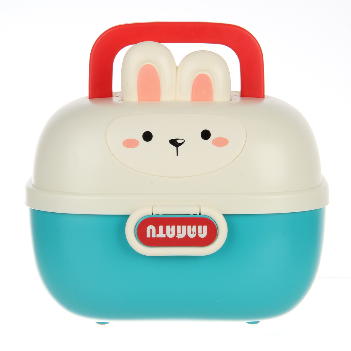 У синей игрушки с кроликом есть прозрачный шар, внутри которого разноцветные шарики. Шарики шумят, если их потрясти.