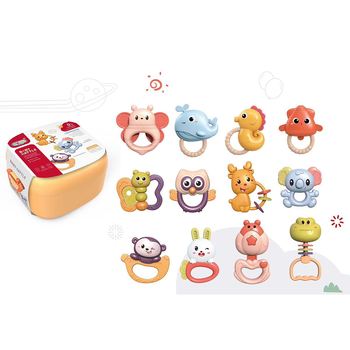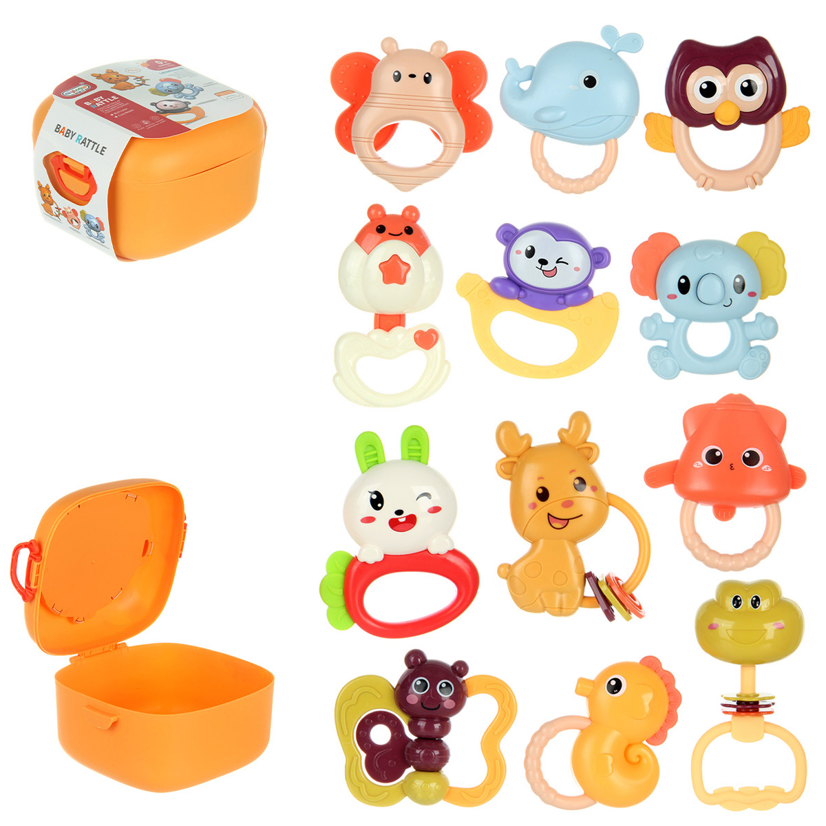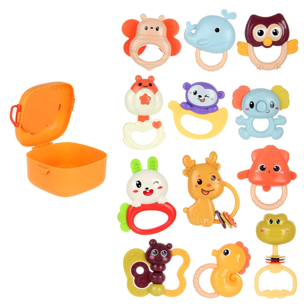 В наборе 12 погремушек и чемоданчик упаковка. Все погремушки шумят при встряхивании.