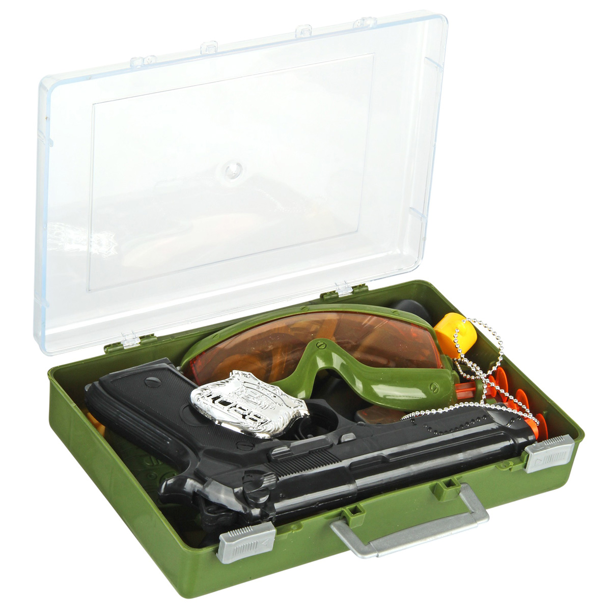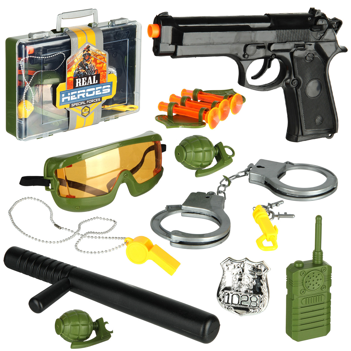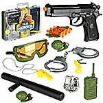 В комплект входят игрушечный пистолет, 3 патрона с присосками, кобура для патронов, дубинка, защитные очки, наручники, 2 ключика от них на креплении-карабине, свисток на цепочке, жетон, 2 муляжа гранаты и муляж рации, чемоданчик с ручкой, в который помещаются все предметы.