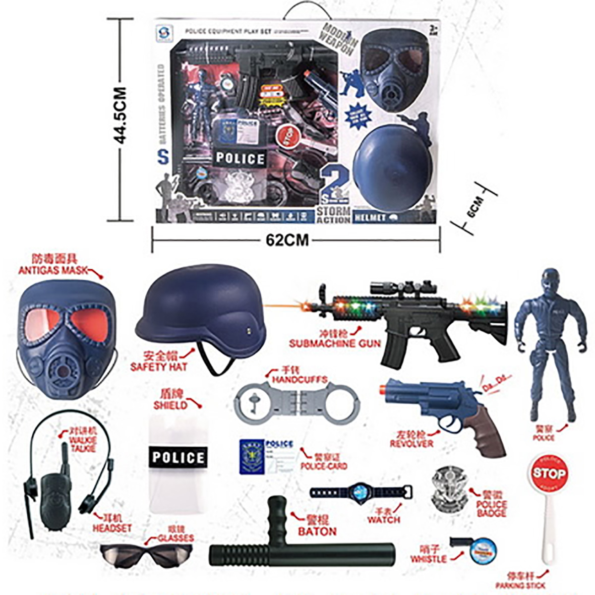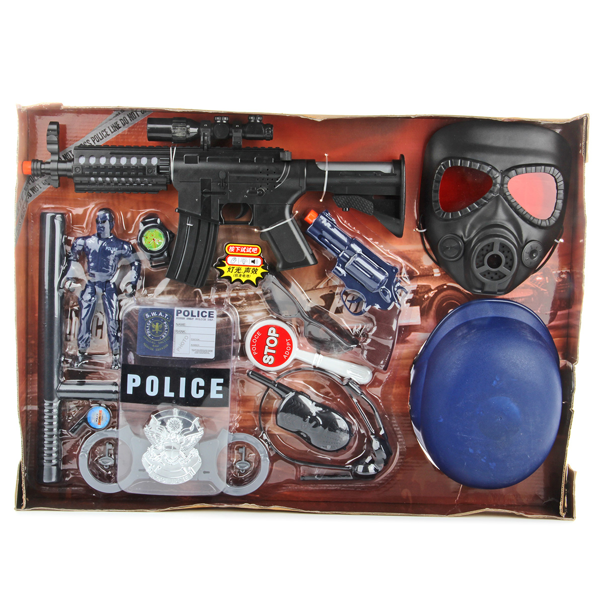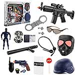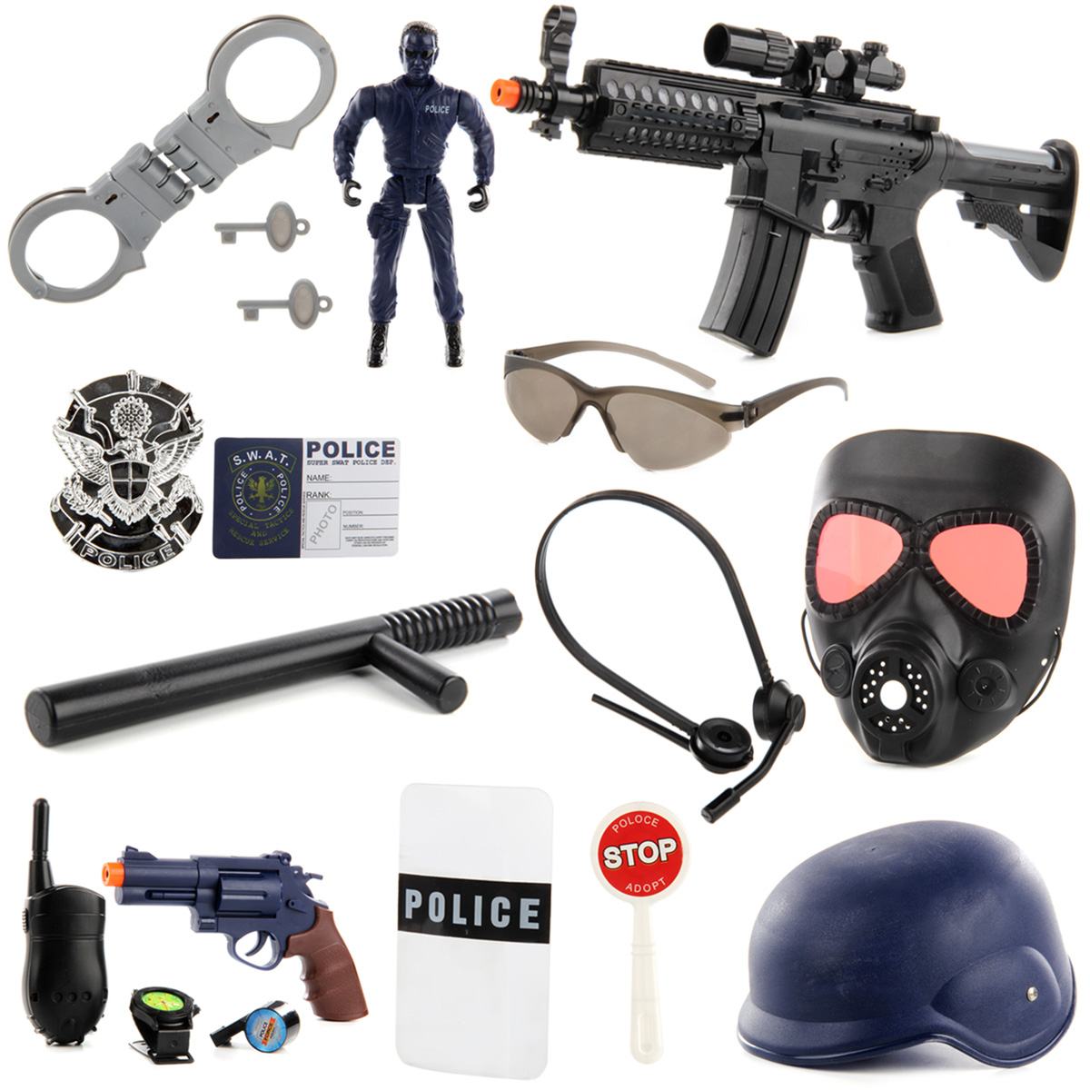 В комплект входят маска, жетон, картонная карточка полицейского, наручные часы, пистолет, щит полицейского, гарнитура, рация, свисток, знак стоп, фигурка полицейского, наручники, дубинка, шлем, очки (раскладываются), автомат.