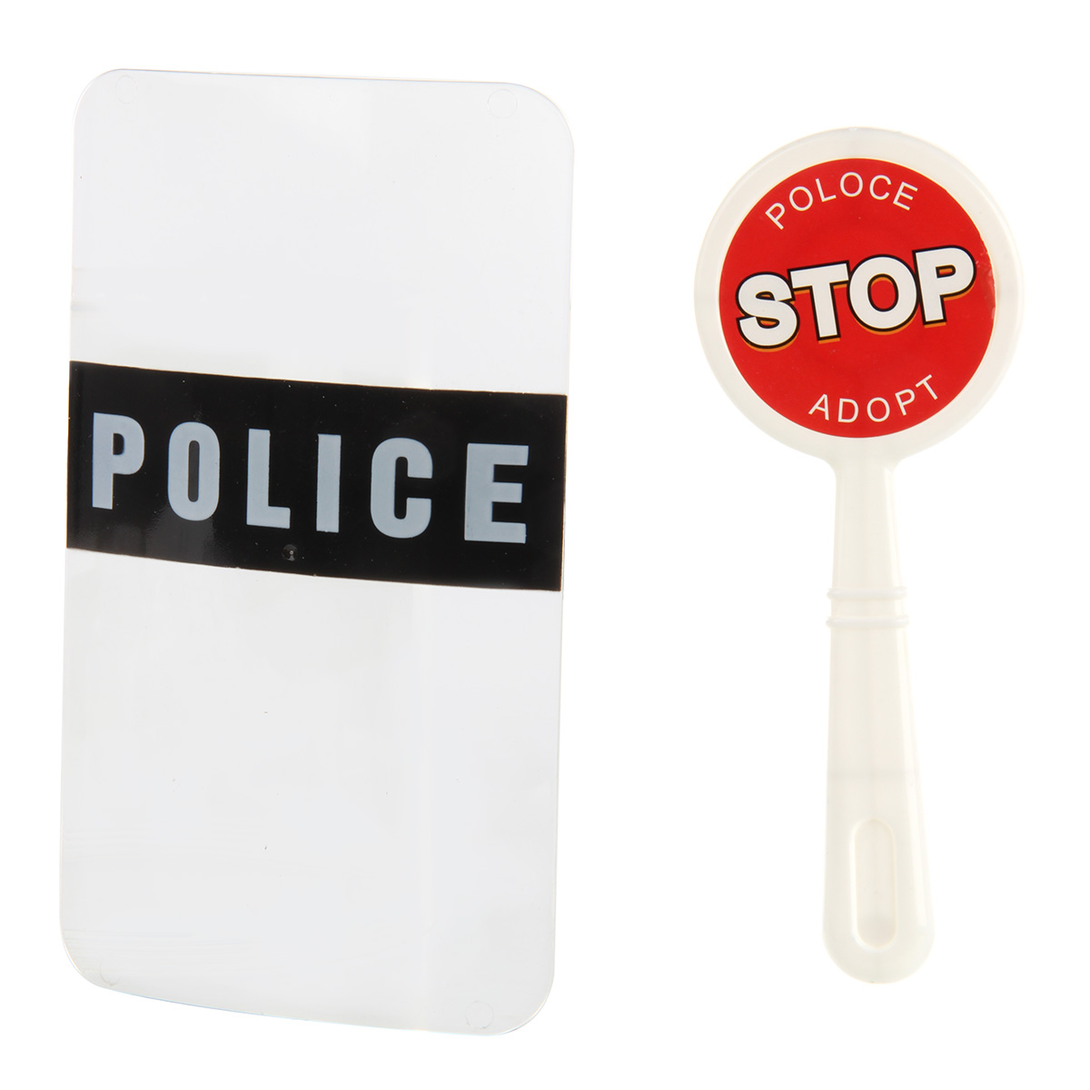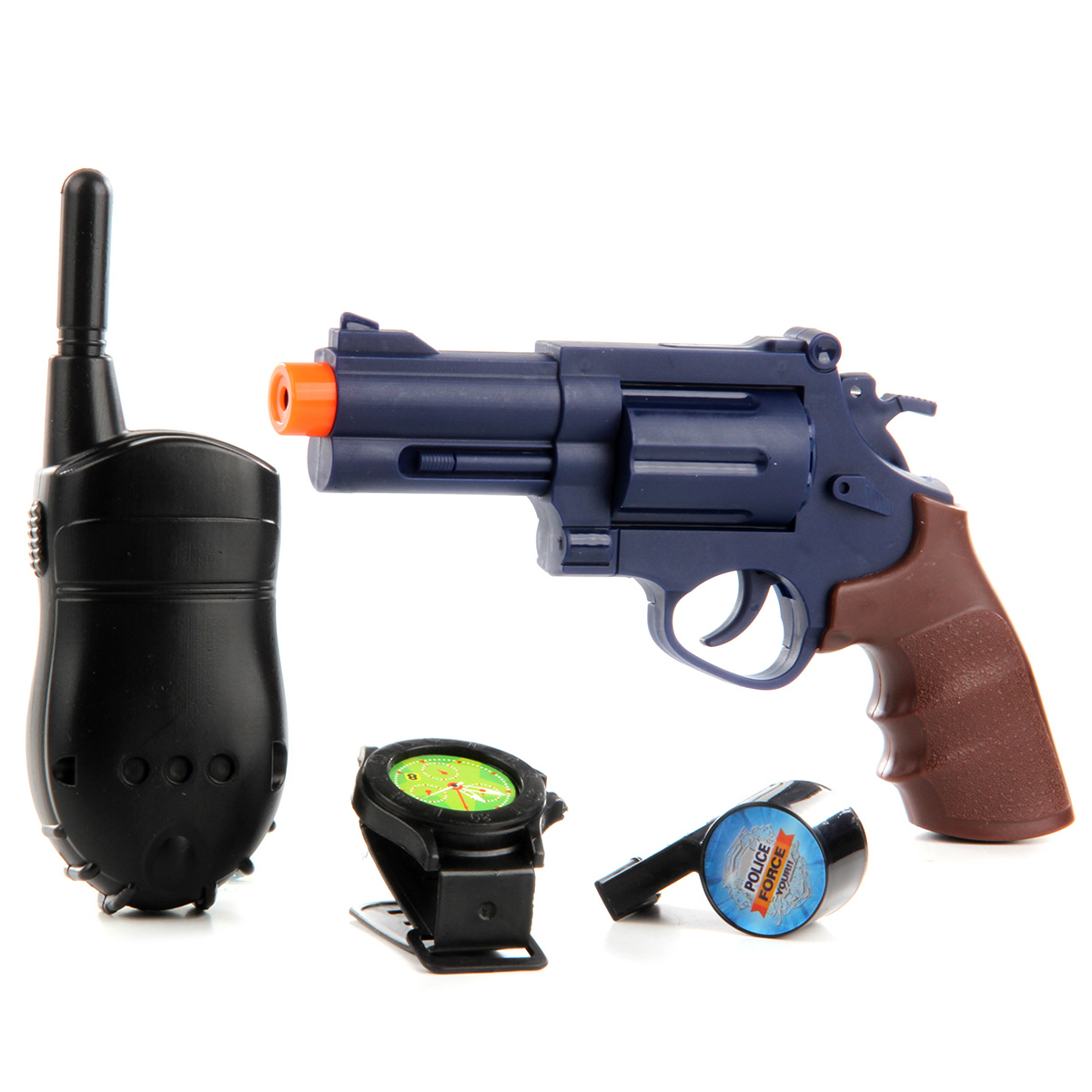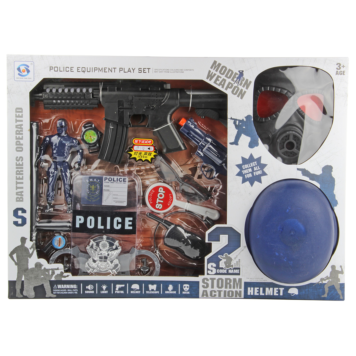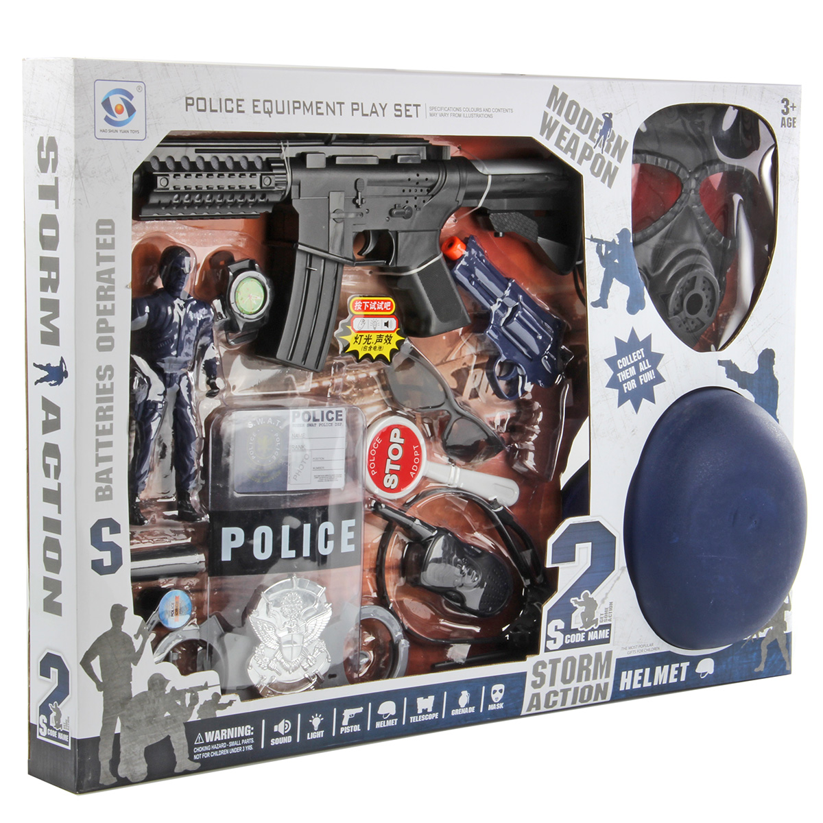 В комплект входят маска, жетон, картонная карточка полицейского, наручные часы, пистолет, щит полицейского, гарнитура, рация, свисток, знак стоп, фигурка полицейского, наручники, дубинка, шлем, очки (раскладываются), автомат.