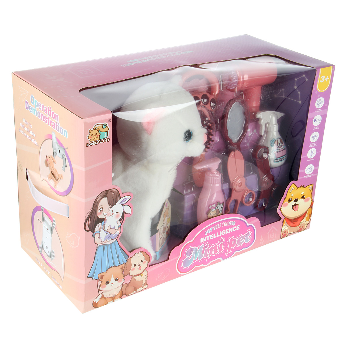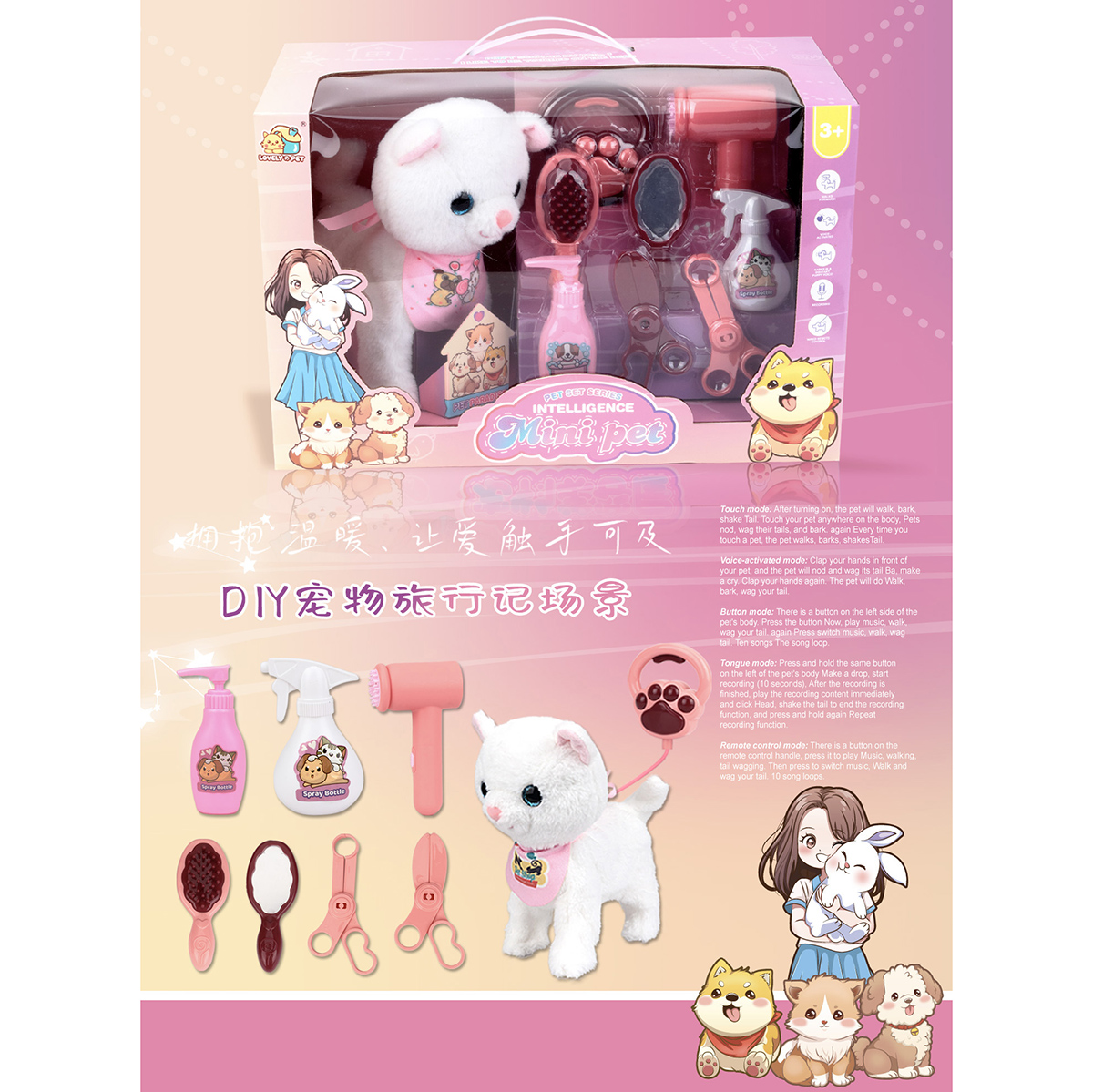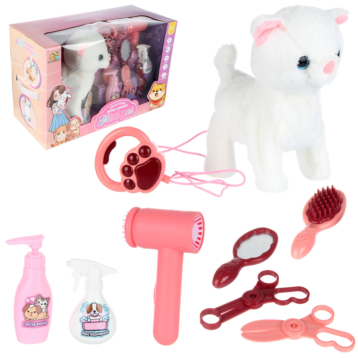В наборе питомец, пульт, расческа, зеркальце, фен, 2 бутылочки имитации моющих средств, 2 пары ножниц.