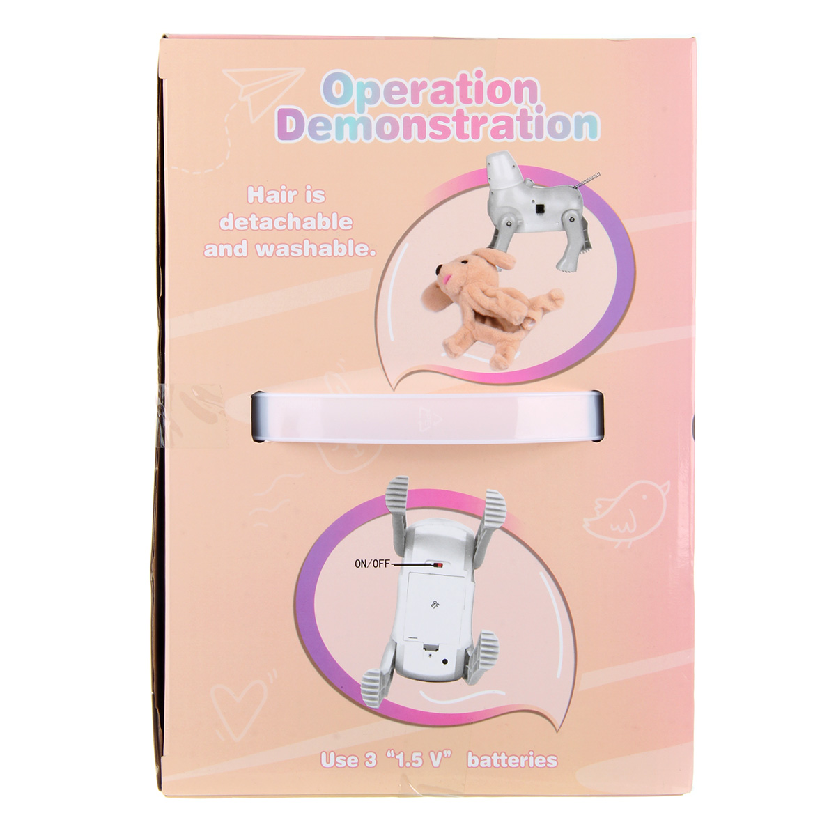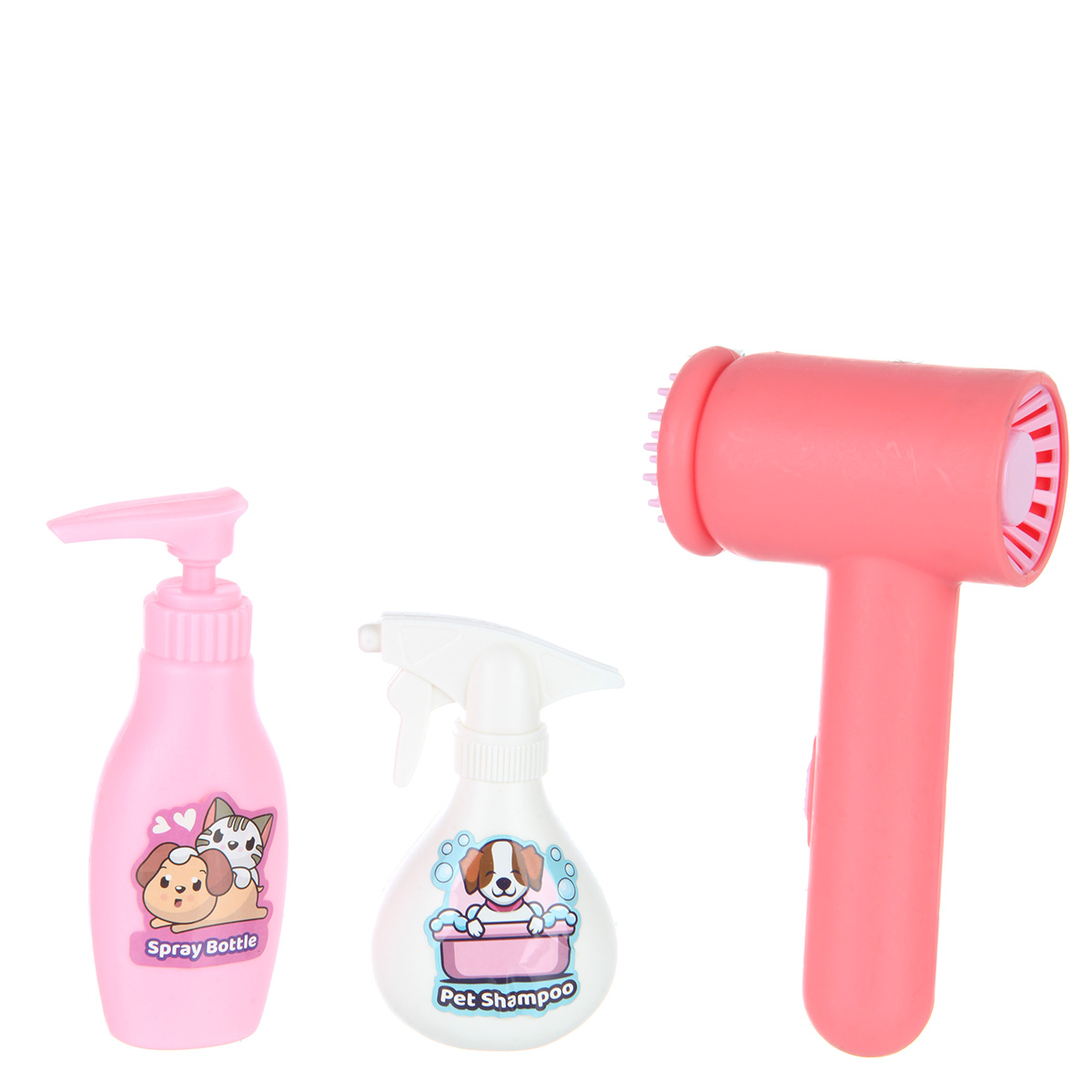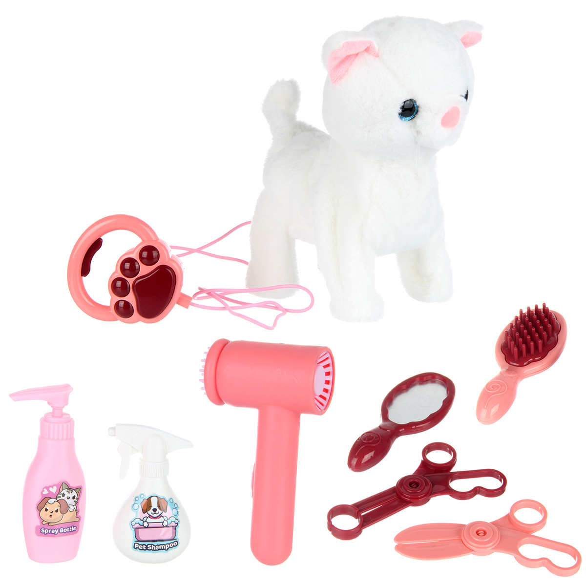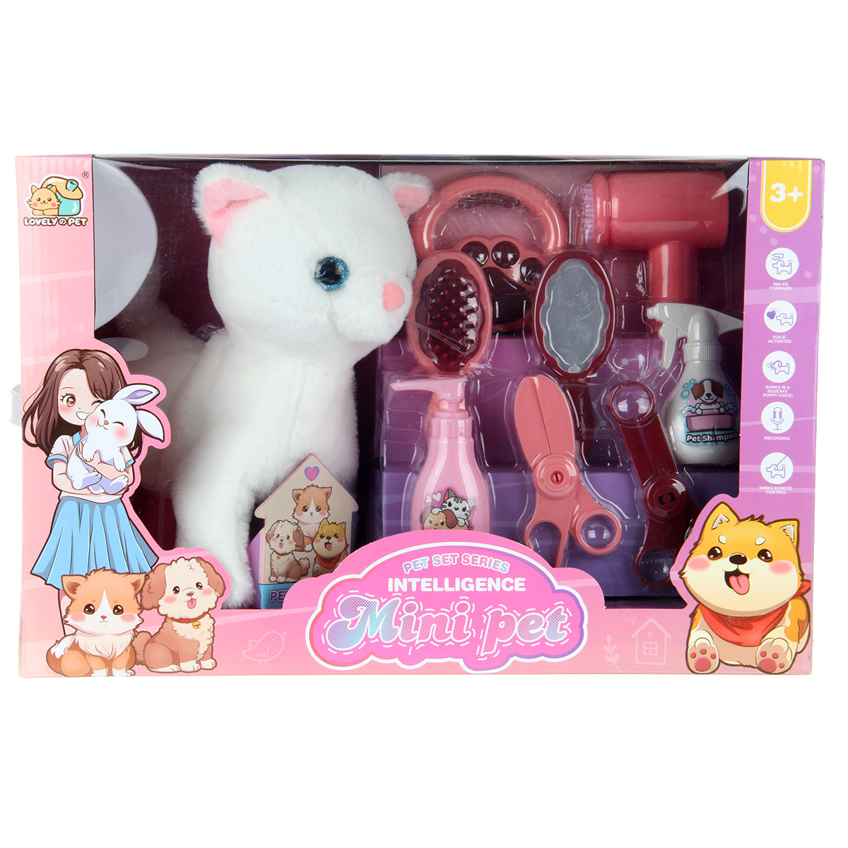 В наборе питомец, пульт, расческа, зеркальце, фен, 2 бутылочки имитации моющих средств, 2 пары ножниц.