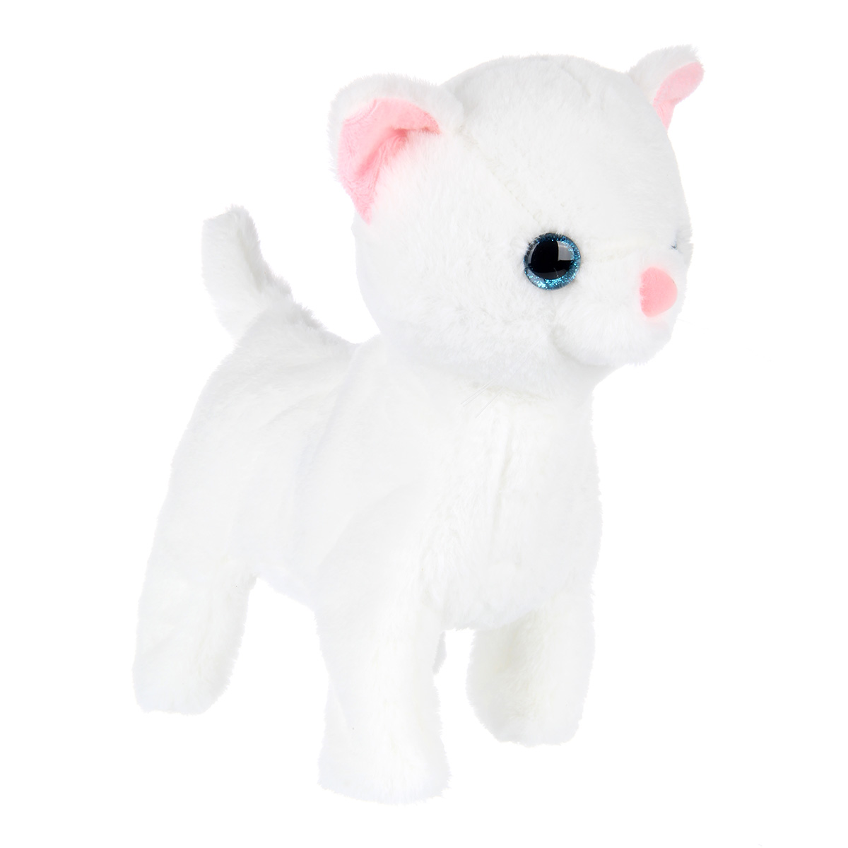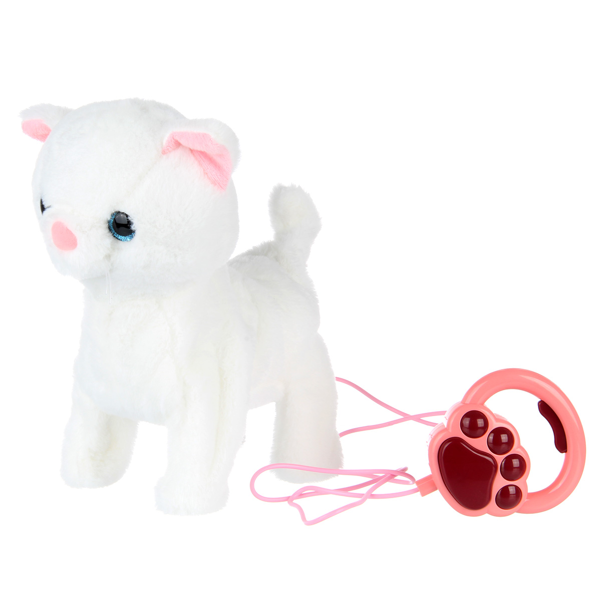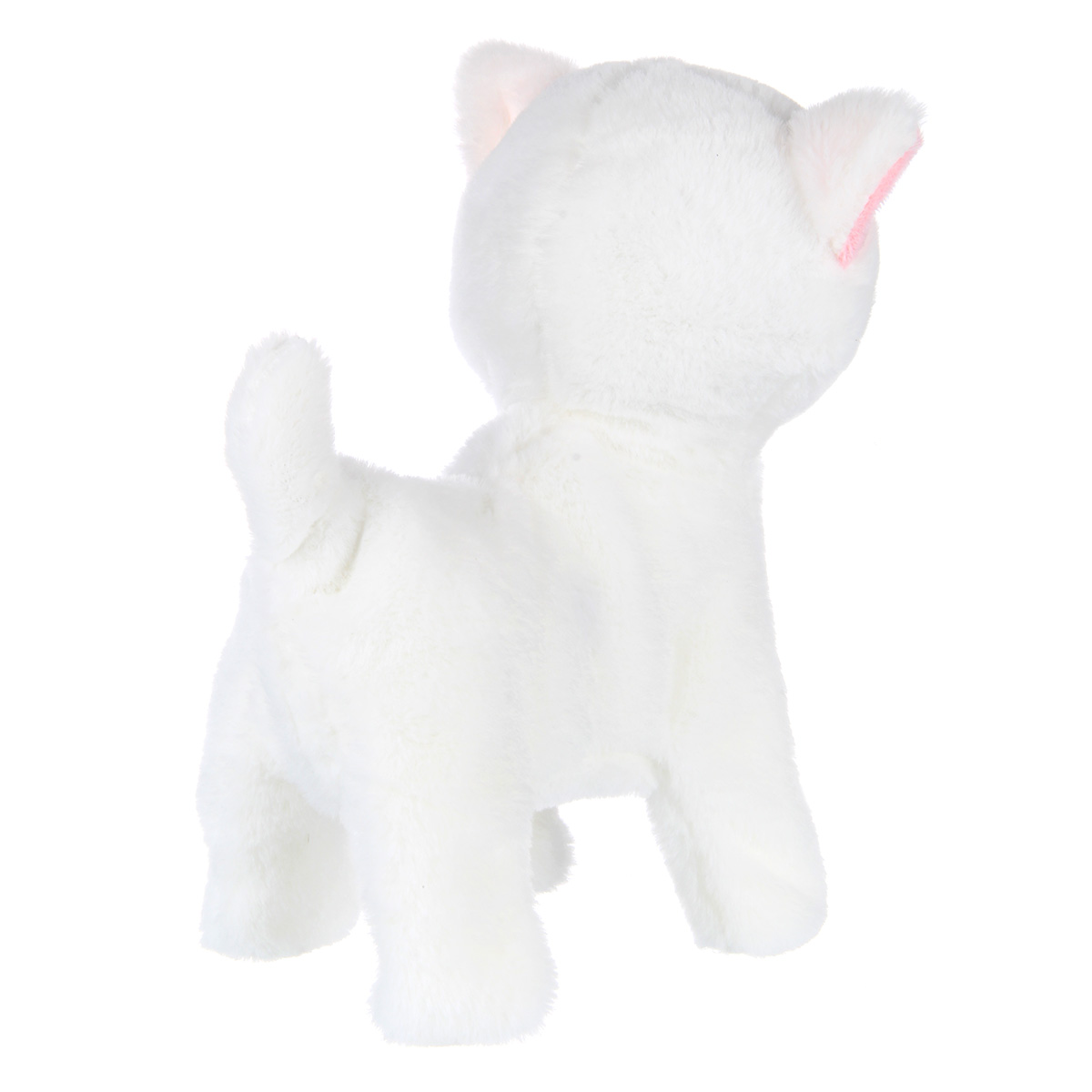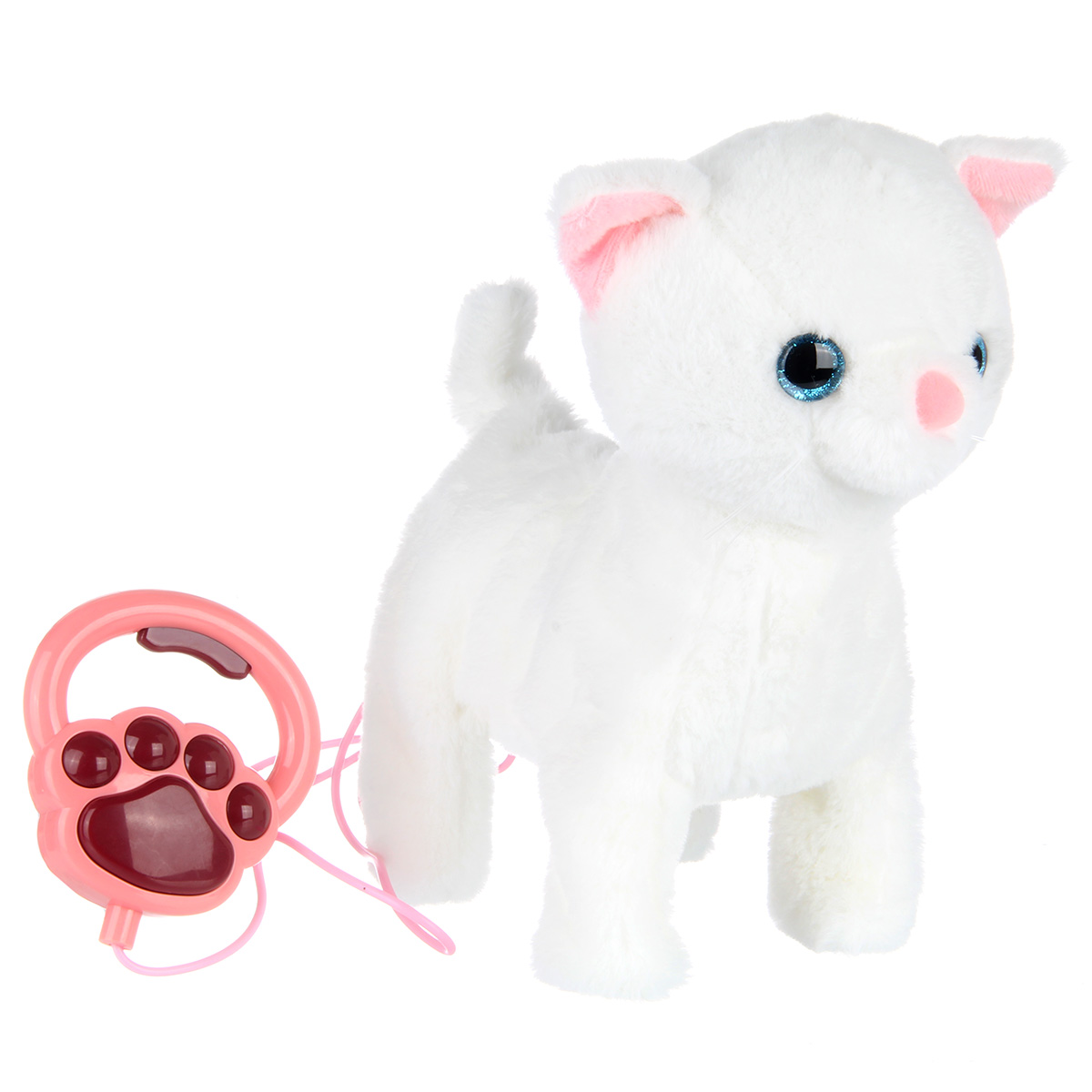 Робот питомец игрушка с функцией воспроизведения голоса, 1 фраза. Идет вперед или стоит, мяукает, шевелит хвостиком, телом и головой. Реагирует на прикосновения, поглаживание по голове, поглаживание спинки, кнопка на бочке проигрывает более 5 мелодий, реагирует на хлопанье в ладоши движением и звуком. Управление с помощью пульта, провод, имитация прогулки с котиком, можно снять мягкое покрытие в виде шерстки с животного и постирать. Мягкая, приятная на ощупь шерстка. Глазки бусинки, расческа вычесывать питомца.