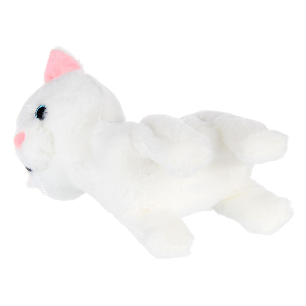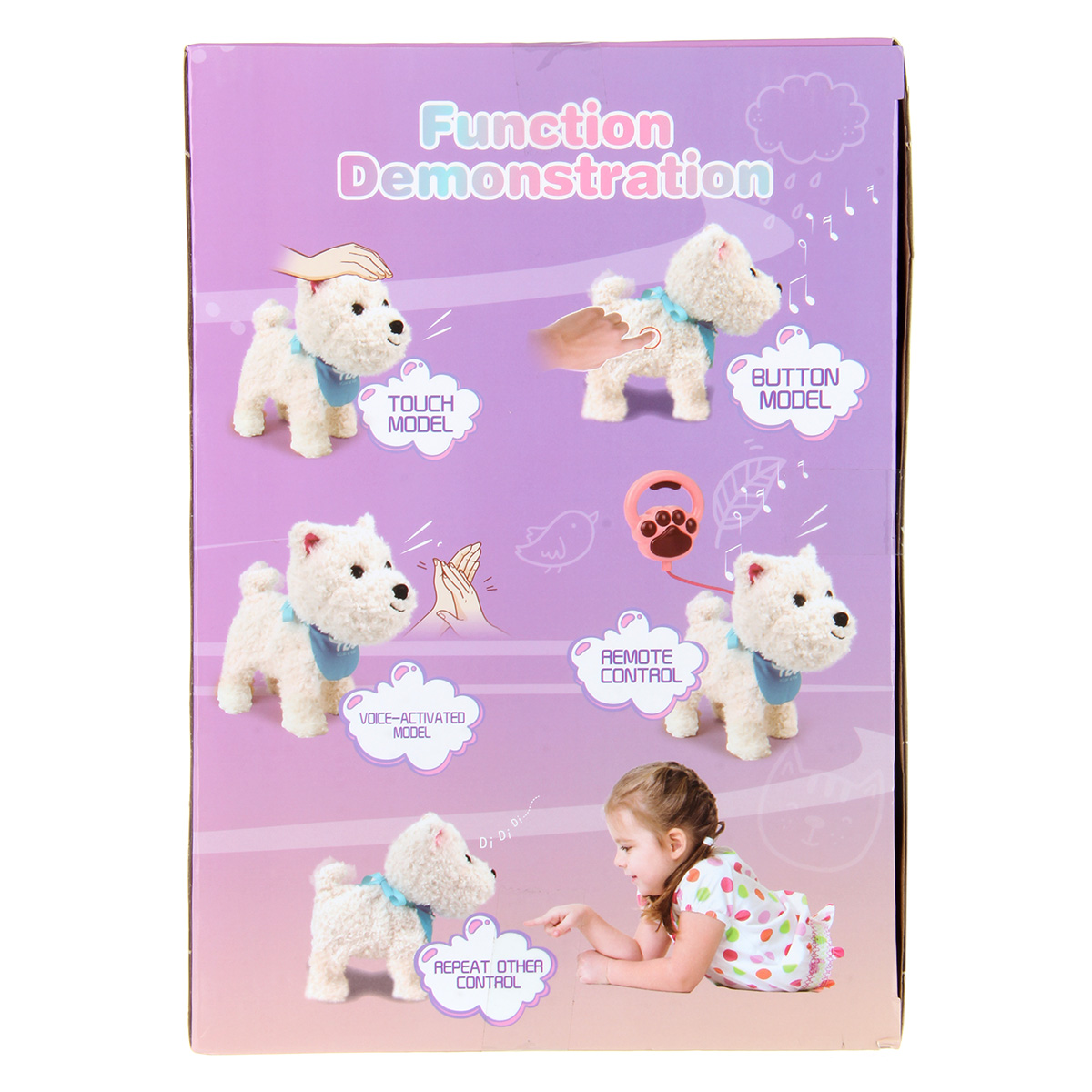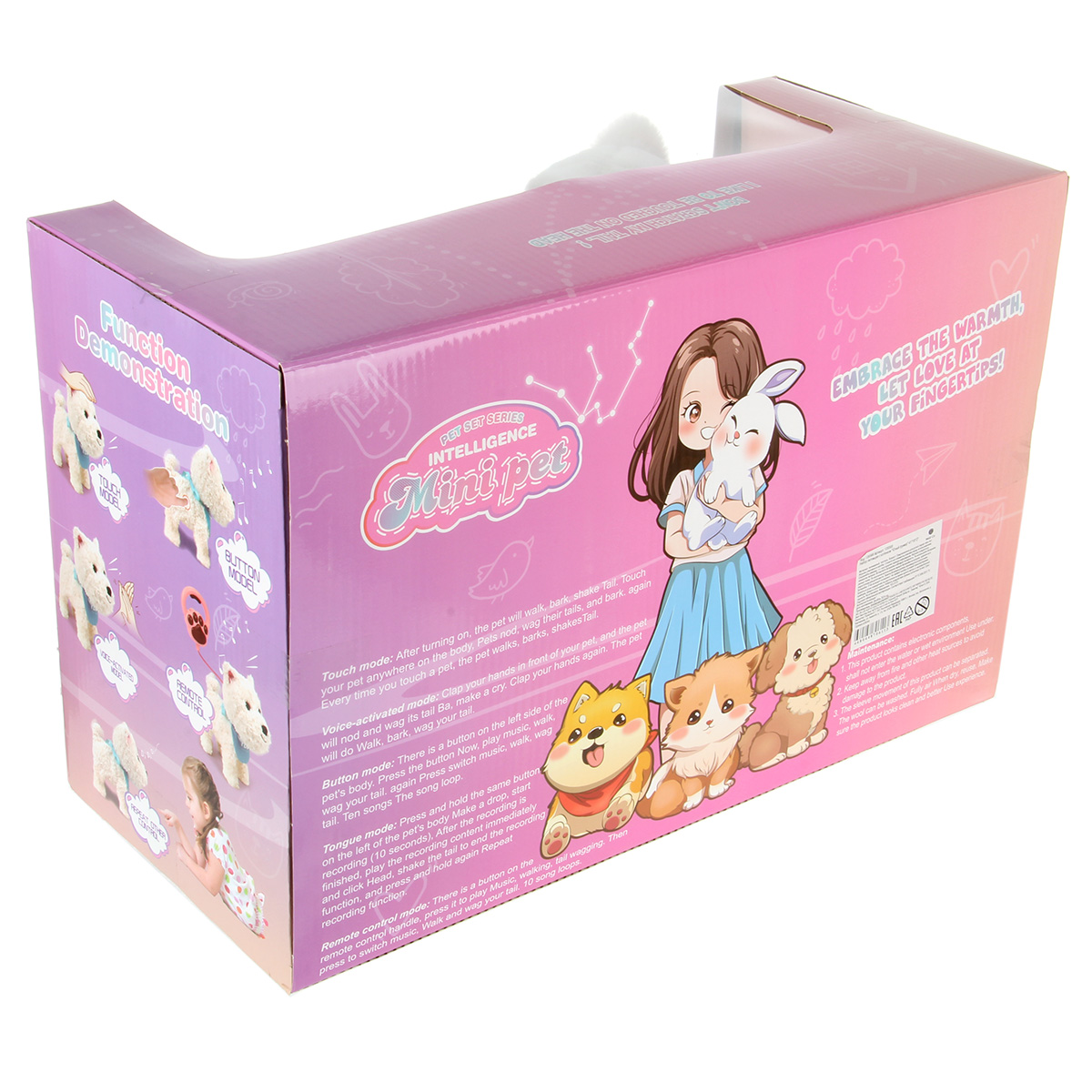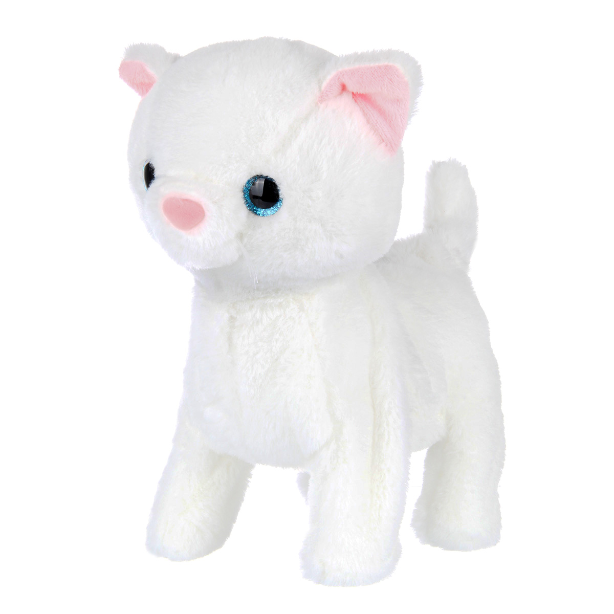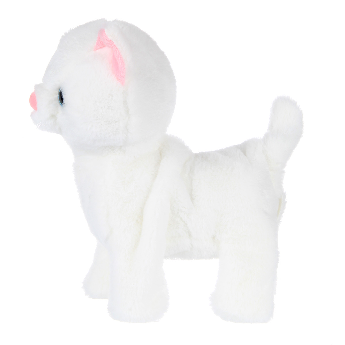 Робот питомец игрушка с функцией воспроизведения голоса, 1 фраза. Идет вперед или стоит, мяукает, шевелит хвостиком, телом и головой. Реагирует на прикосновения, поглаживание по голове, поглаживание спинки, кнопка на бочке проигрывает более 5 мелодий, реагирует на хлопанье в ладоши движением и звуком. Управление с помощью пульта, провод, имитация прогулки с котиком, можно снять мягкое покрытие в виде шерстки с животного и постирать. Мягкая, приятная на ощупь шерстка. Глазки бусинки, расческа вычесывать питомца.