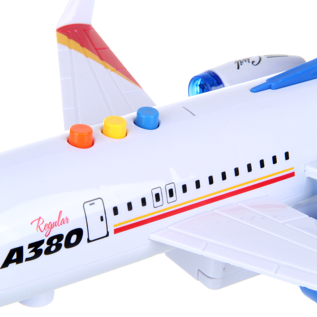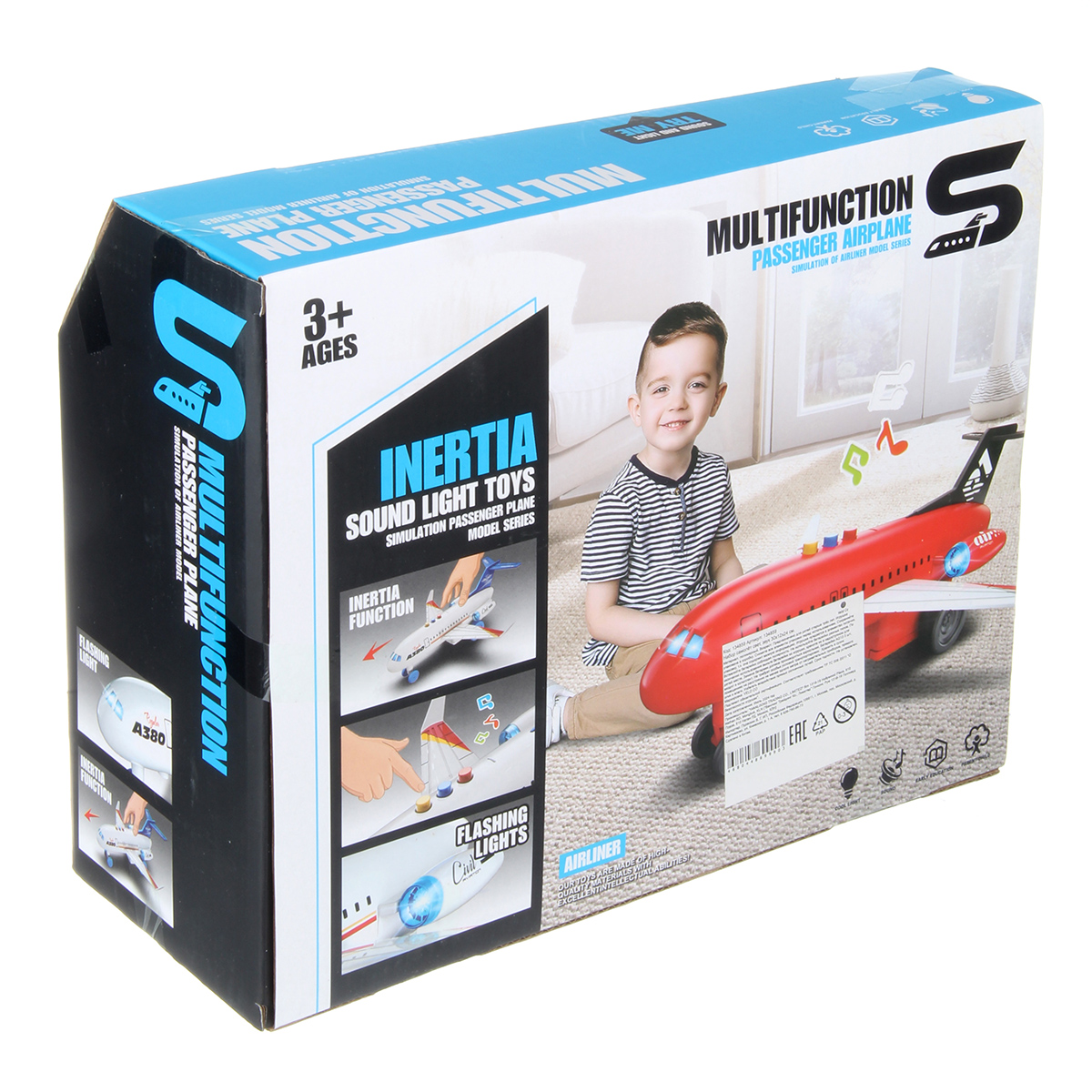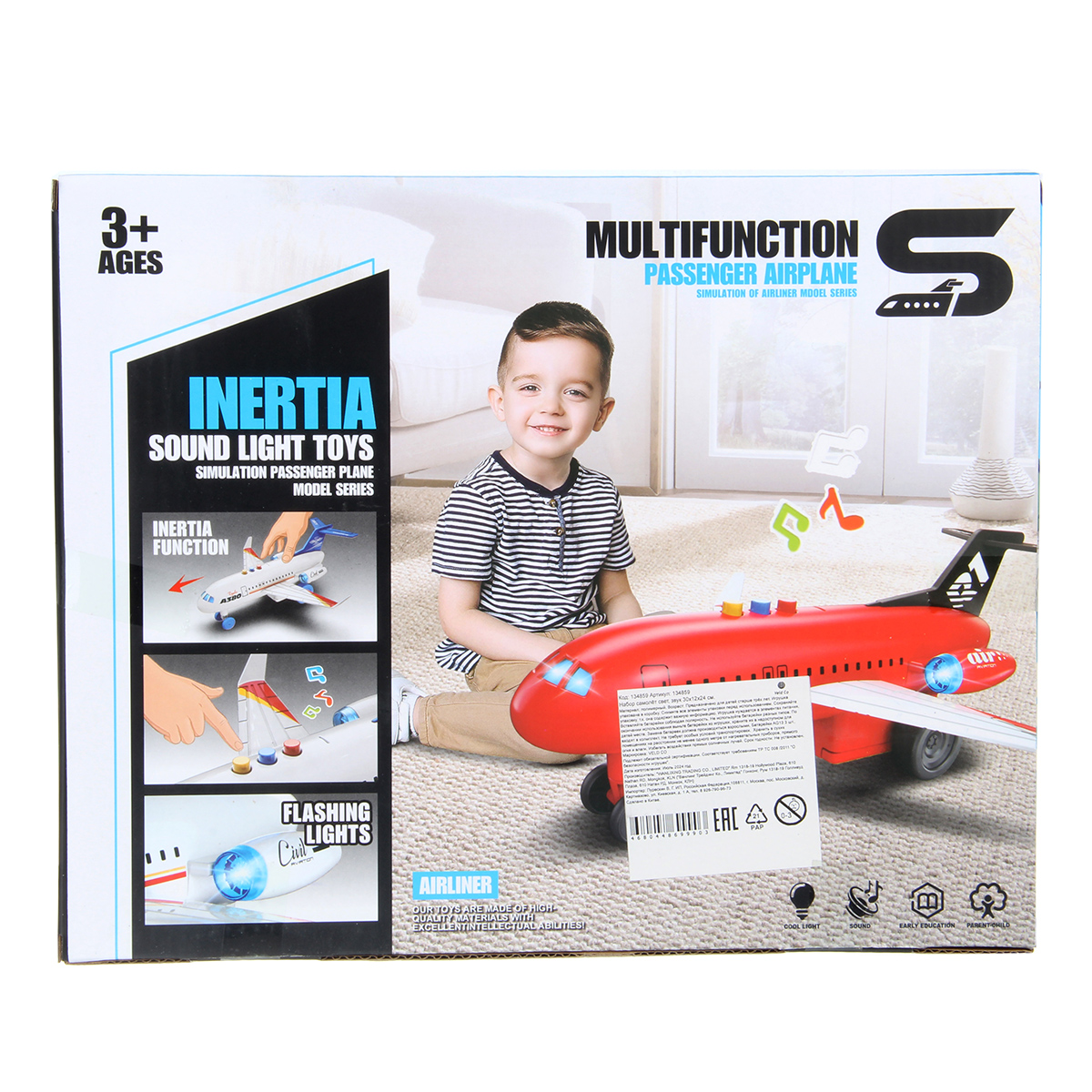 Функционал самолета. Катается вперед и назад, оснащен фрикционным механизмом, при нажатии кнопок издает звуки сирен, взлетающего самолета, звукового сигнала объявления, звучит объявление с просьбой занять посадочные места, подсветка кабины, бортовых огней.