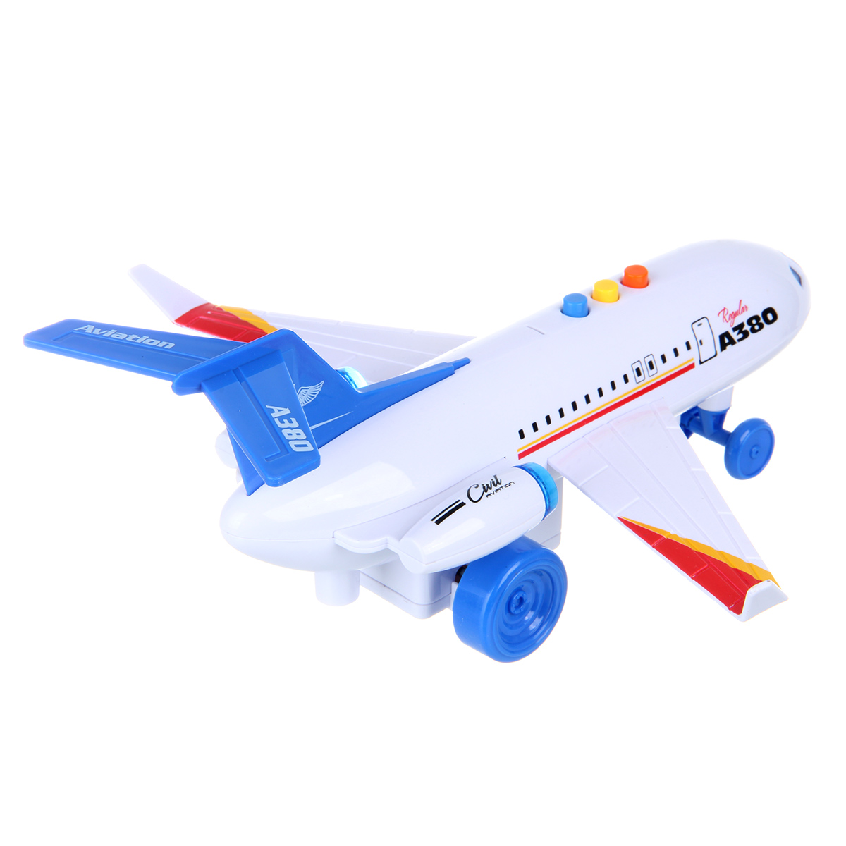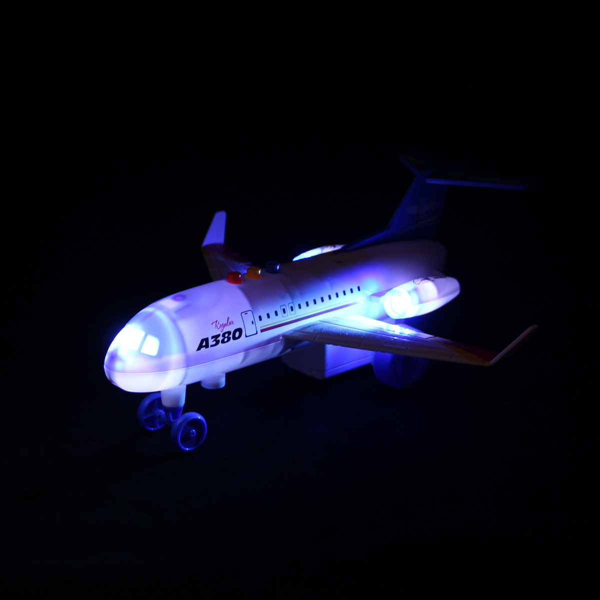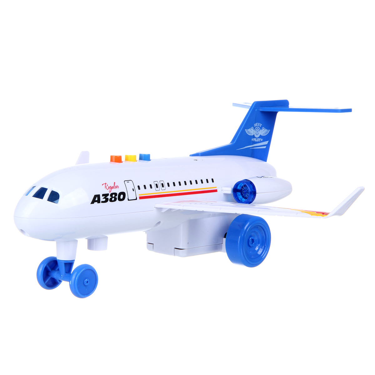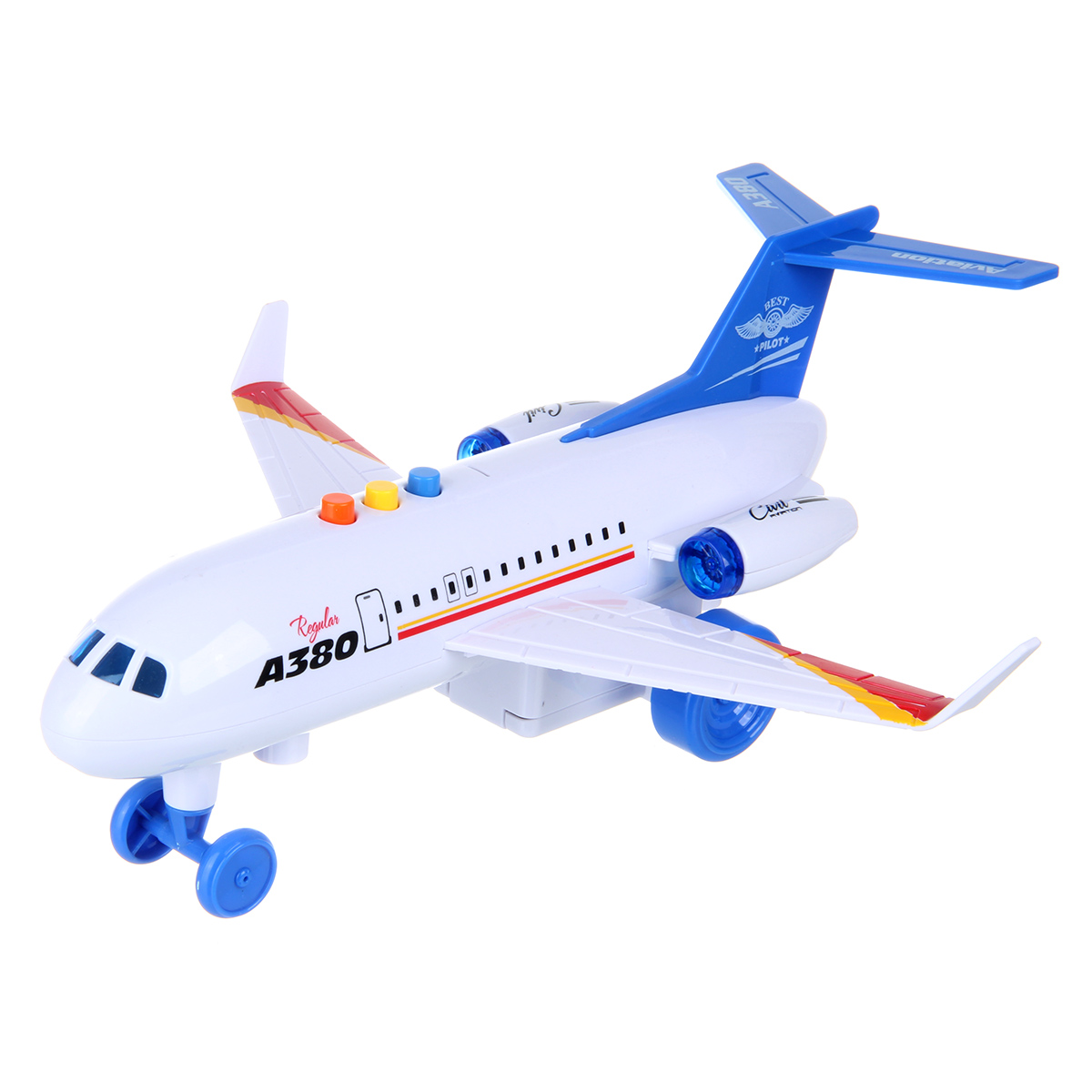 Функционал самолета. Катается вперед и назад, оснащен фрикционным механизмом, при нажатии кнопок издает звуки сирен, взлетающего самолета, звукового сигнала объявления, звучит объявление с просьбой занять посадочные места, подсветка кабины, бортовых огней.