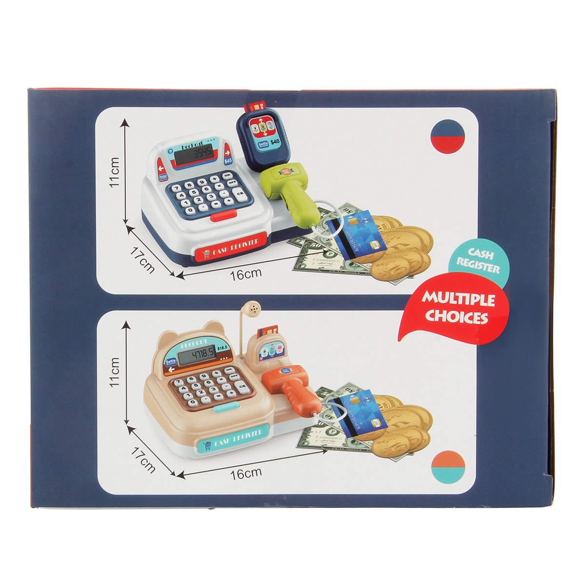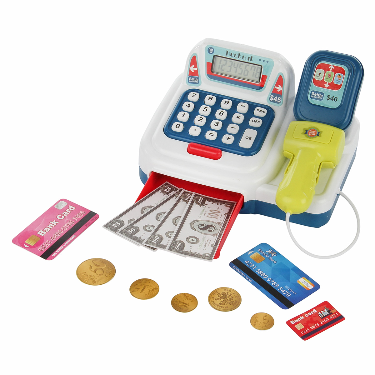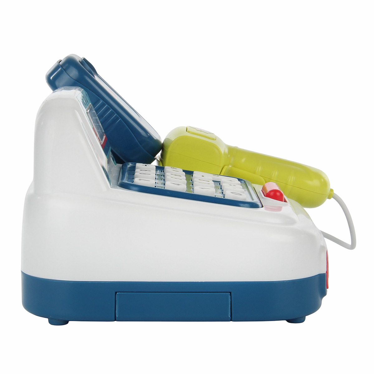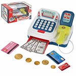 Детская игровая касса со сканером, световыми и звуковыми эффектами, калькулятором, выдвижным ящиком и множеством аксессуаров отлично подойдет для сюжетных игр в супермаркет. Изготовлена из прочных и безопасных материалов, прослужит много лет. Детский магазинчик оформлен в стилизованном дизайне и яркой расцветке. Обладает компактными размерами. В комплект игрового набора входят игрушка кассовый аппарат, банкноты и монеты различного номинала, 3 банковские карты. Кассовый аппарат работает по принципу калькулятора. Необходимо ввести цифры и арифметические действия на игрушечной клавиатуре. Они отобразятся на экране. Аппарат издаёт писк при нажатии кнопок. При нажатии на овальную красную кнопку выдвигается ящик для игрушечных денег. Сканер издаёт писк при нажатии на кнопку, при этом у него загорается подсветка лампочки. Такая игрушечная касса со звуком станет замечательным подарком детям, мальчику, девочке, на новый год, день рождения и на любой другой повод. С такой детской игрушкой ребёнок в игровой форме обучится основам финансовой грамотности. 13 предметов. Работает от 2 батареек АА, не входят в комплект. Детский супермаркет изготовлен из высококачественного полимера. Размер кассы с учетом сканера 19х16х10 см, размер без учета сканирующего устройства 17х11х10 см. Размер красной банковской карты 4х2 см. Размер синей банковской карты 6х4 см. Размер банкноты номиналом сто 9х4 см. Диаметр монеты, равной пяти 2 см. Диаметр монеты, равной пятидесяти 3 см. Размер упаковки 24х17х13 см.