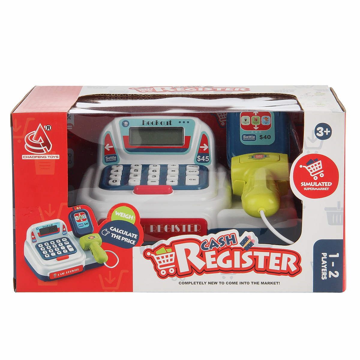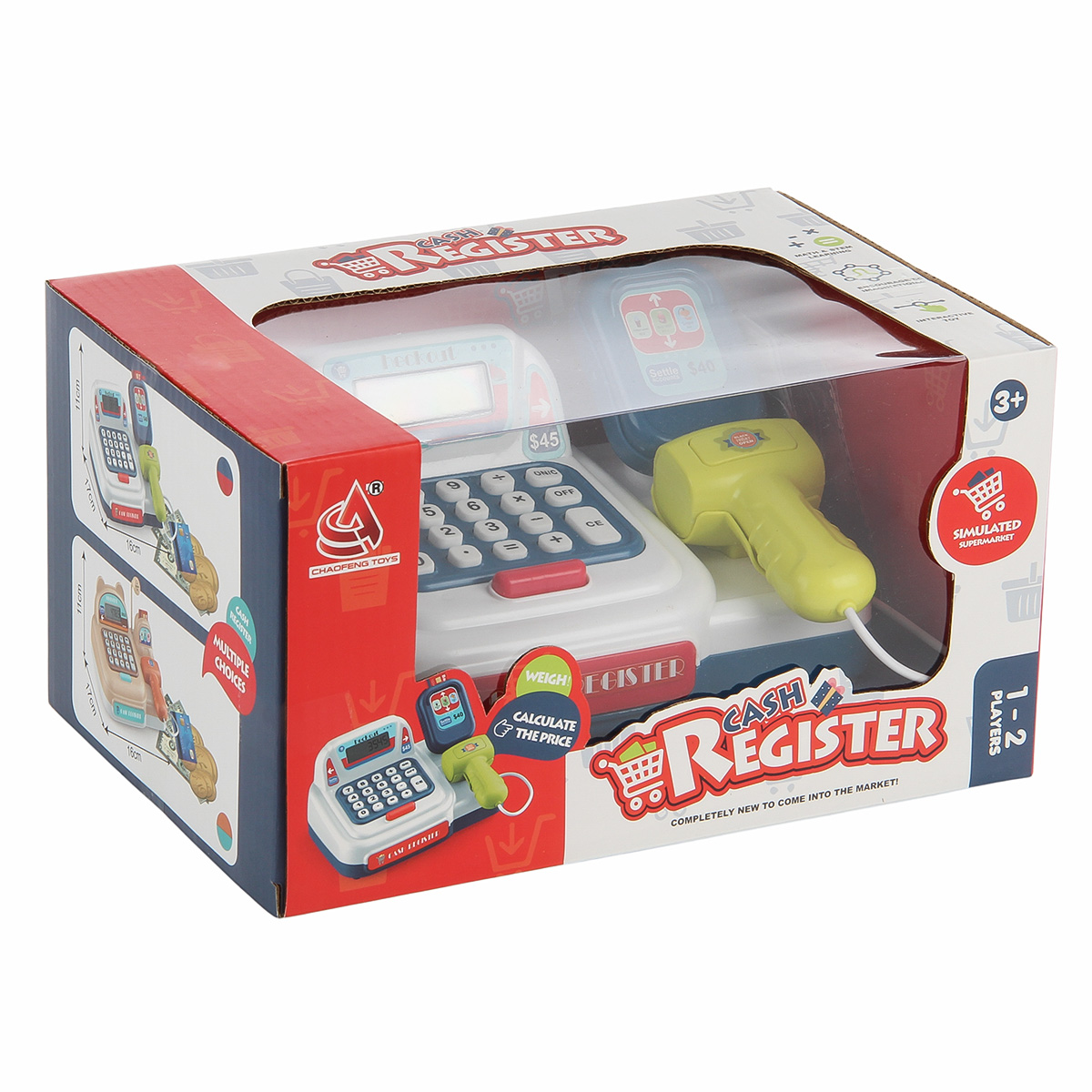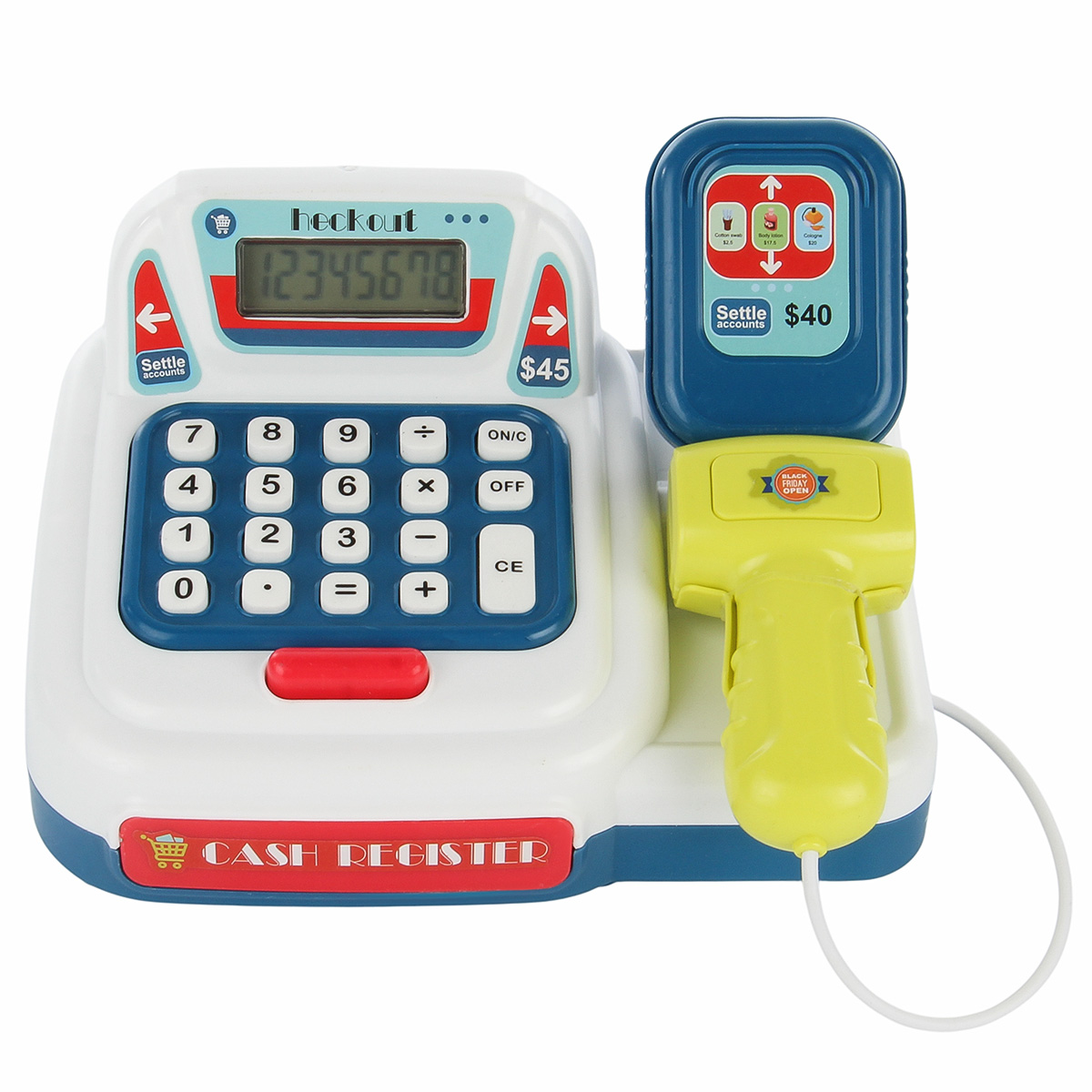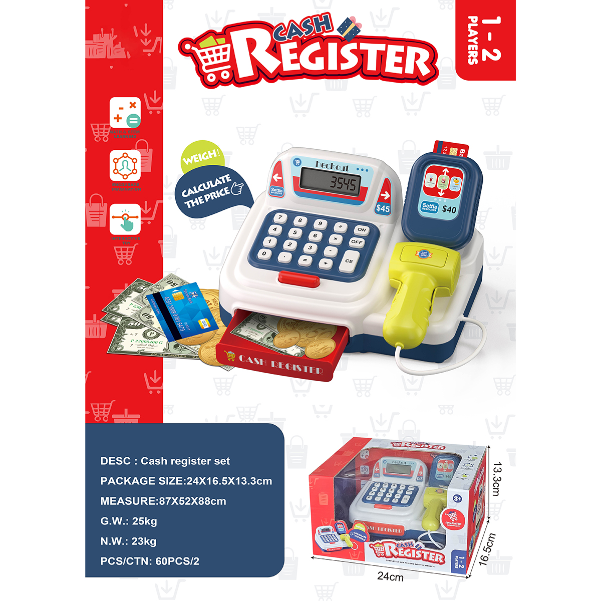 Детская игровая касса со сканером, световыми и звуковыми эффектами, калькулятором, выдвижным ящиком и множеством аксессуаров отлично подойдет для сюжетных игр в супермаркет. Изготовлена из прочных и безопасных материалов, прослужит много лет. Детский магазинчик оформлен в стилизованном дизайне и яркой расцветке. Обладает компактными размерами. В комплект игрового набора входят игрушка кассовый аппарат, банкноты и монеты различного номинала, 3 банковские карты. Кассовый аппарат работает по принципу калькулятора. Необходимо ввести цифры и арифметические действия на игрушечной клавиатуре. Они отобразятся на экране. Аппарат издаёт писк при нажатии кнопок. При нажатии на овальную красную кнопку выдвигается ящик для игрушечных денег. Сканер издаёт писк при нажатии на кнопку, при этом у него загорается подсветка лампочки. Такая игрушечная касса со звуком станет замечательным подарком детям, мальчику, девочке, на новый год, день рождения и на любой другой повод. С такой детской игрушкой ребёнок в игровой форме обучится основам финансовой грамотности. 13 предметов. Работает от 2 батареек АА, не входят в комплект. Детский супермаркет изготовлен из высококачественного полимера. Размер кассы с учетом сканера 19х16х10 см, размер без учета сканирующего устройства 17х11х10 см. Размер красной банковской карты 4х2 см. Размер синей банковской карты 6х4 см. Размер банкноты номиналом сто 9х4 см. Диаметр монеты, равной пяти 2 см. Диаметр монеты, равной пятидесяти 3 см. Размер упаковки 24х17х13 см.