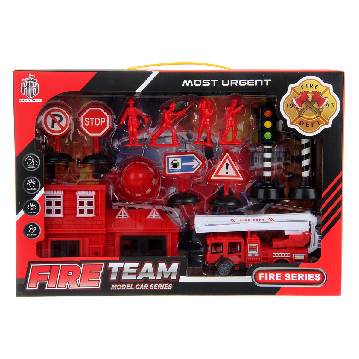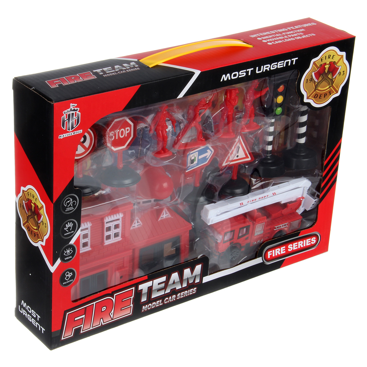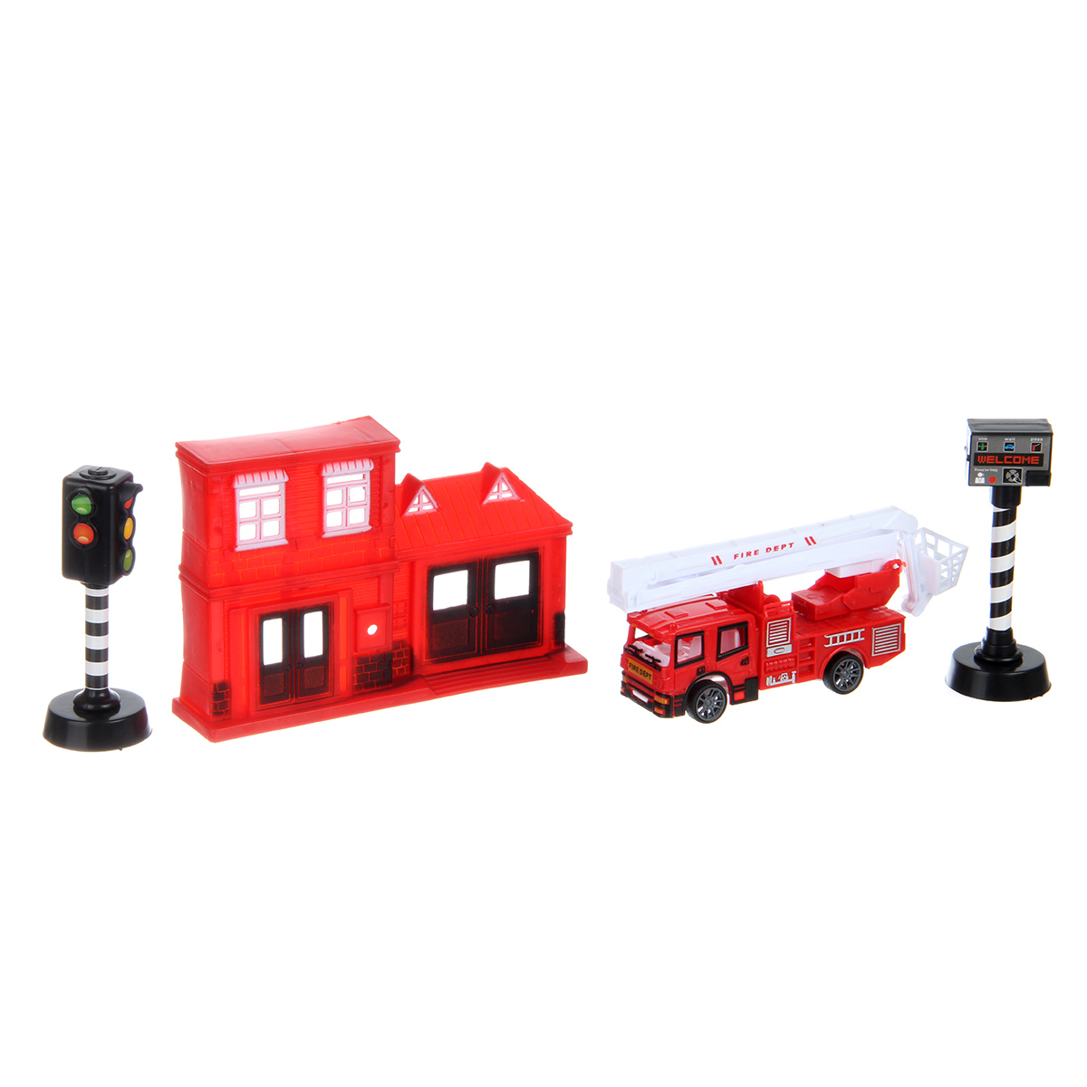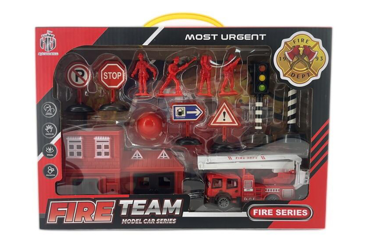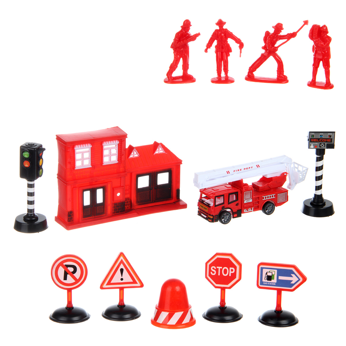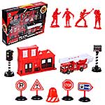 В наборе пожарная часть, пожарная машина, 4 фигурки пожарных, 2 светофора, конус, 4 дорожных знака.