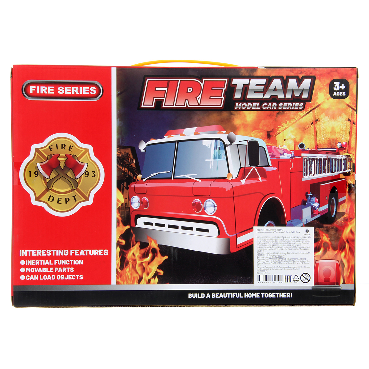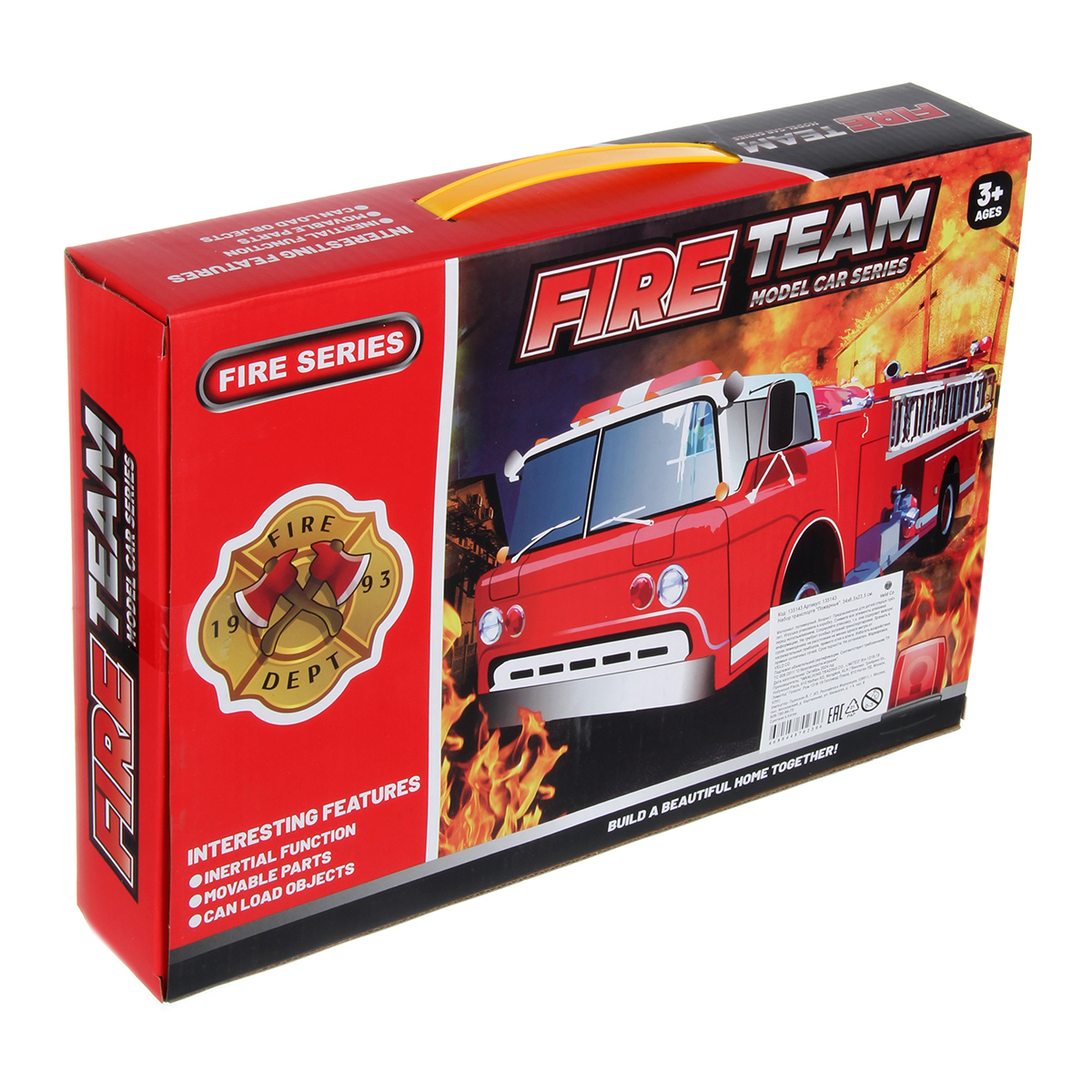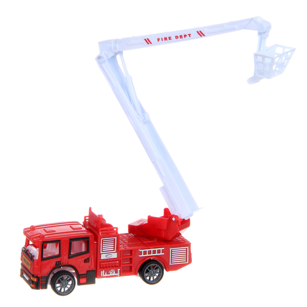Игрушечная машинка катается вперед и назад, оснащена инерционным механизмом, лестница поднимается, раскладывается, люлька двигается, механизм со стрелой крутится на 360 градусов.