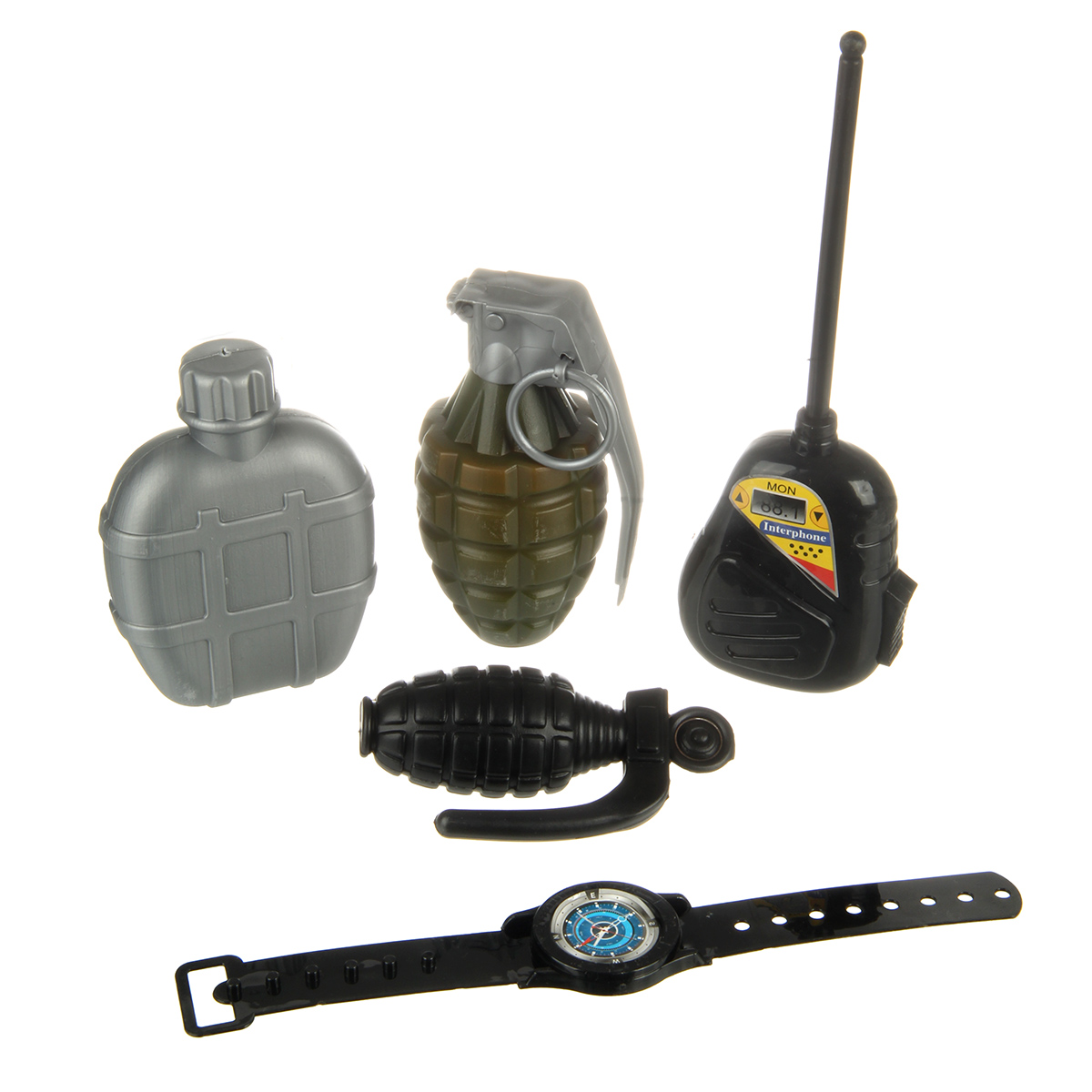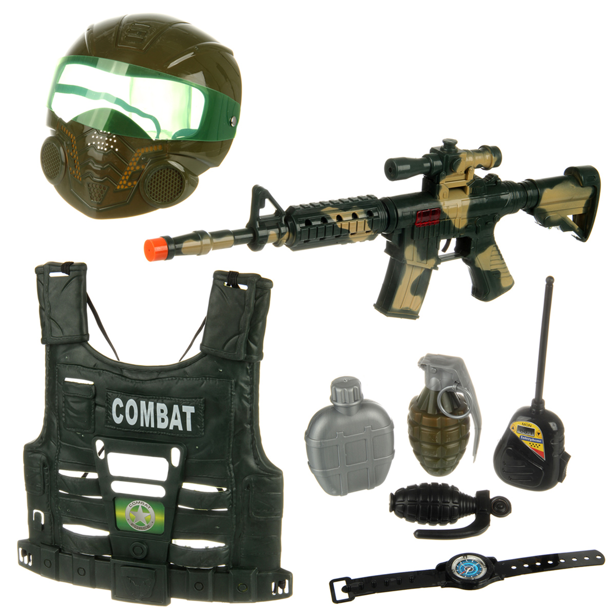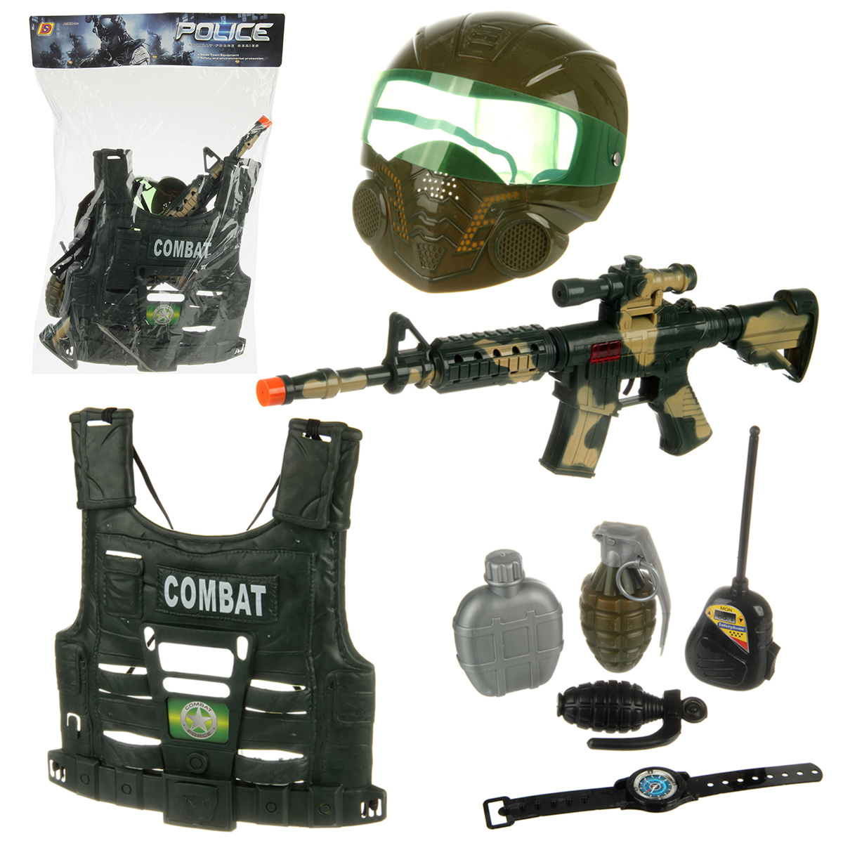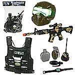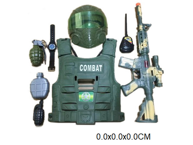 В наборе бронежилет, маска, автомат, рация, большая граната, маленькая граната, часы, фляга.