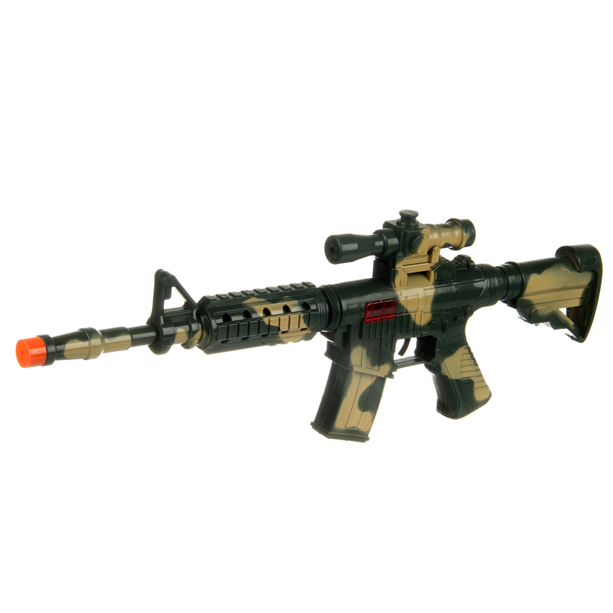 При нажатии на спусковой крючок автомат издаёт звук трещотки, ствол двигается.