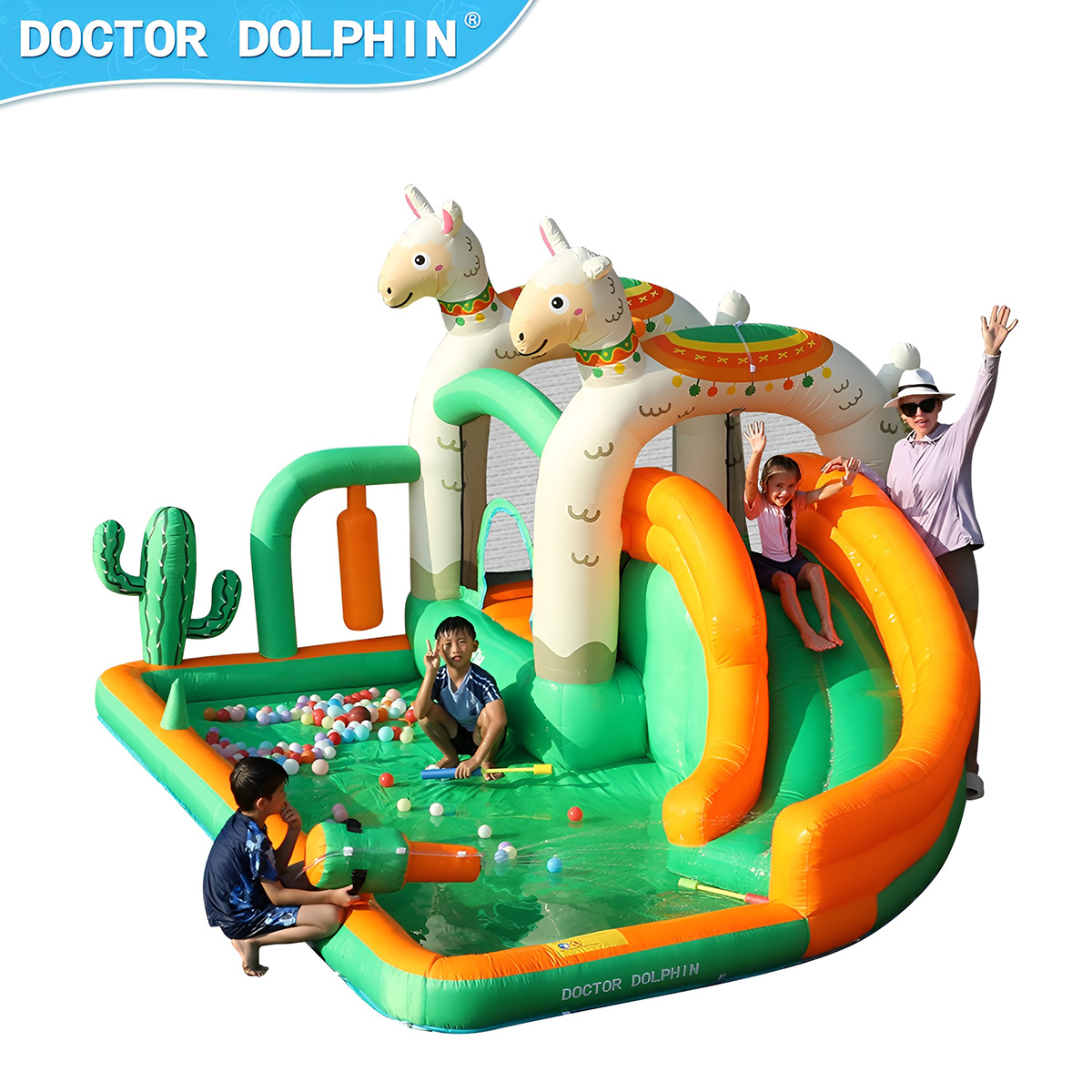 1 разбрызгиватель воды, баскетбольное кольцо, горка, бассейн, 1 груша для битья, скалолазная стенка, кольцеброс, зона для прыжков.