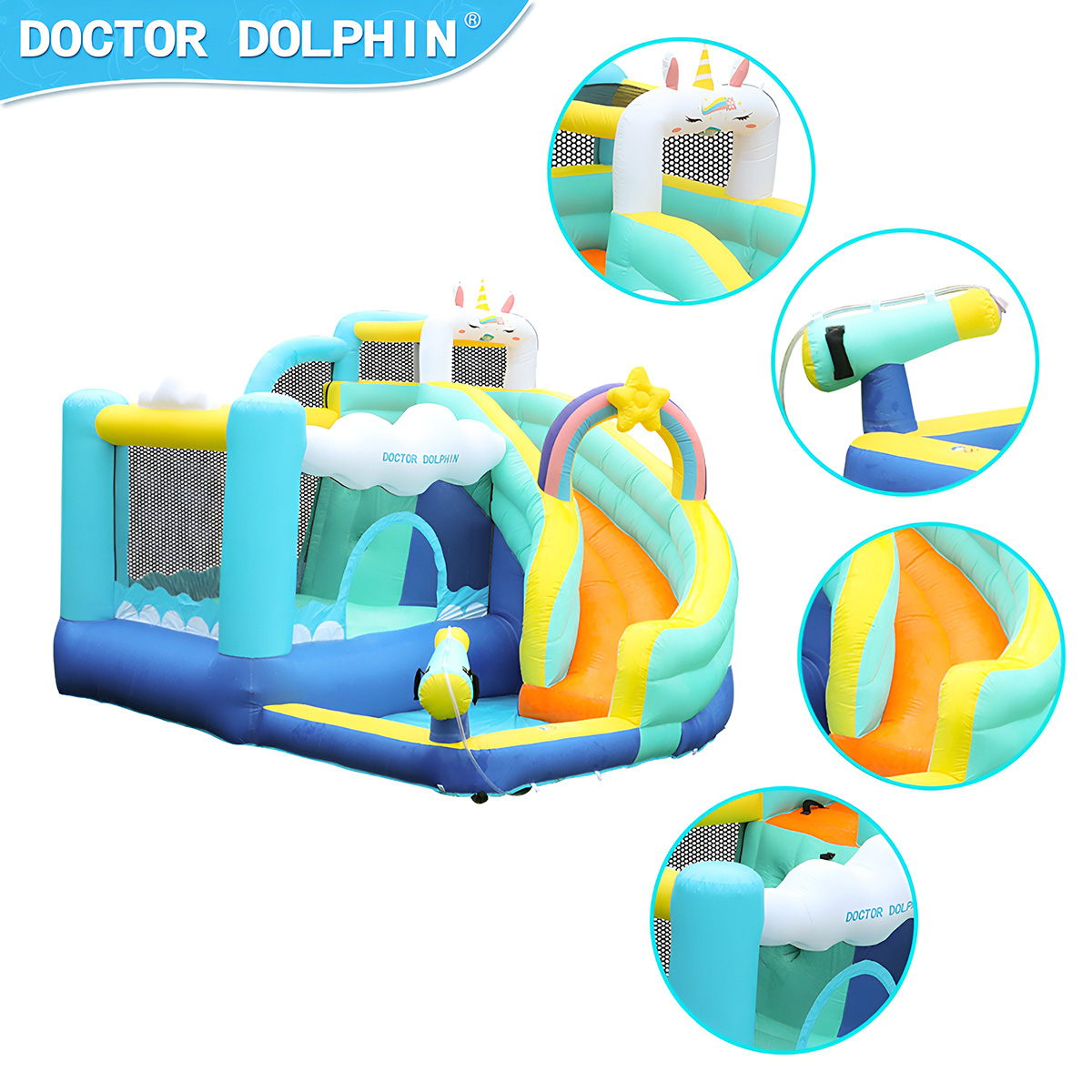 Большой батут и игровой комплекс в виде замка. Спортивный комплекс 6 в 1 со множеством игровых площадок, надувается за 1 минуту. Надувная пушка с разбрызгивателем воды, баскетбольное кольцо для мячика, скалодром, горка и бассейн, в бассейн можно насыпать шарики, получится сухой бассейн, зона для прыжков.