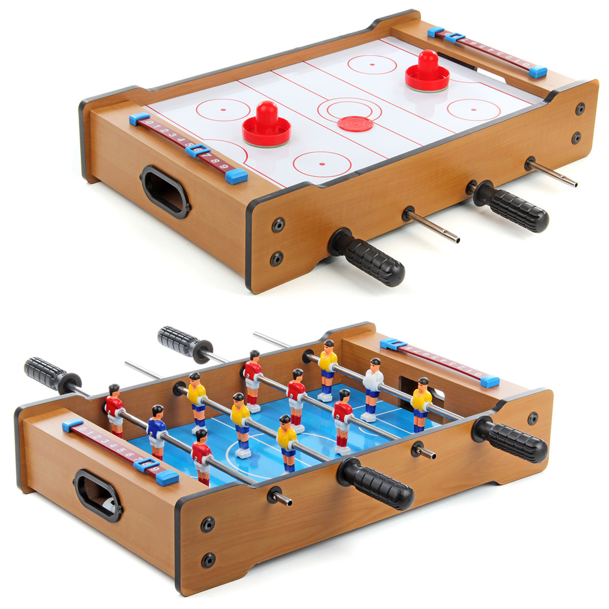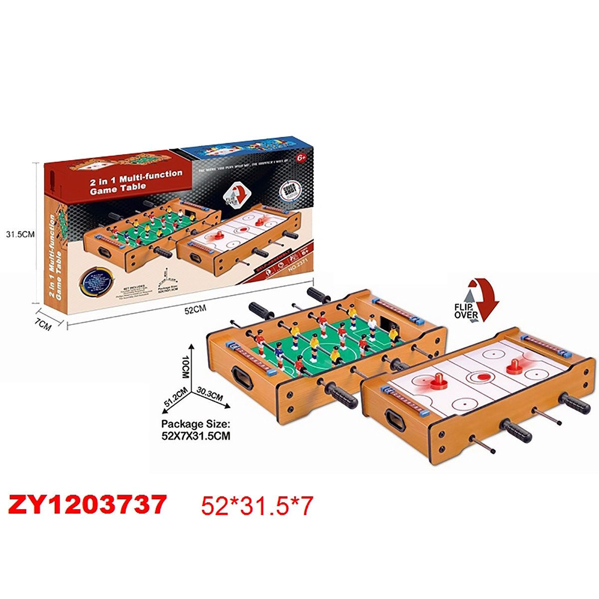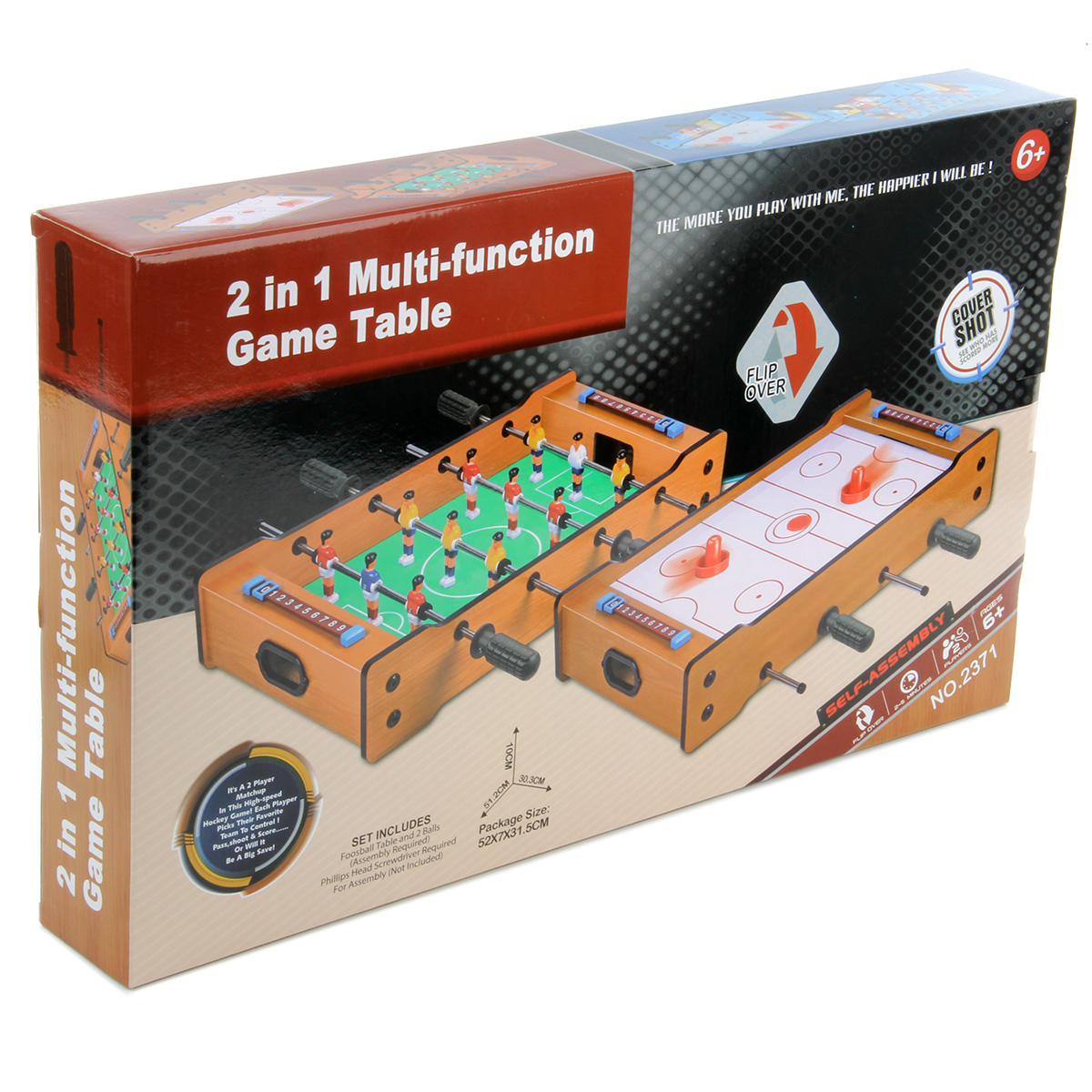 Набор 2 в 1 - настольный футбол и хоккей у вас дома! Такая увлекательнейшая игрушка соберет всю семью, вызвав нешуточные баталии за звание чемпиона. В комплект входят детали для сборки игрового поля, мягкие накладки, колпачки на ручки, диск, 2 мяча, 6-гранный ключ, 2 биты. Управляя фигурками игроков с помощью рукояток, нужно забить как можно больше голов в ворота соперника. Можно вести счет, передвигая бегунки на бортах игрового поля. Благодаря такой игрушке ребенок будет с удовольствием развивать мелкую и крупную моторику, скорость реакции, внимание, зрительное восприятие, глазомер. Набор станет прекрасным подарком для всех любителей активного досуга. Обязательно порадуйте ребенка этой потрясающей игрушкой. Игрушка изготовлена из дерева, металла и полимерного материала. Размеры собранной игровой площадки с учетом ручек: 52*49*11 см. Размеры фигурки игрока: 3*8 см. Диаметр мяча: 3 см. Диаметр диска: 4 см. Размеры биты: 5*4 см. Размеры коробки: 52*7*32 см.