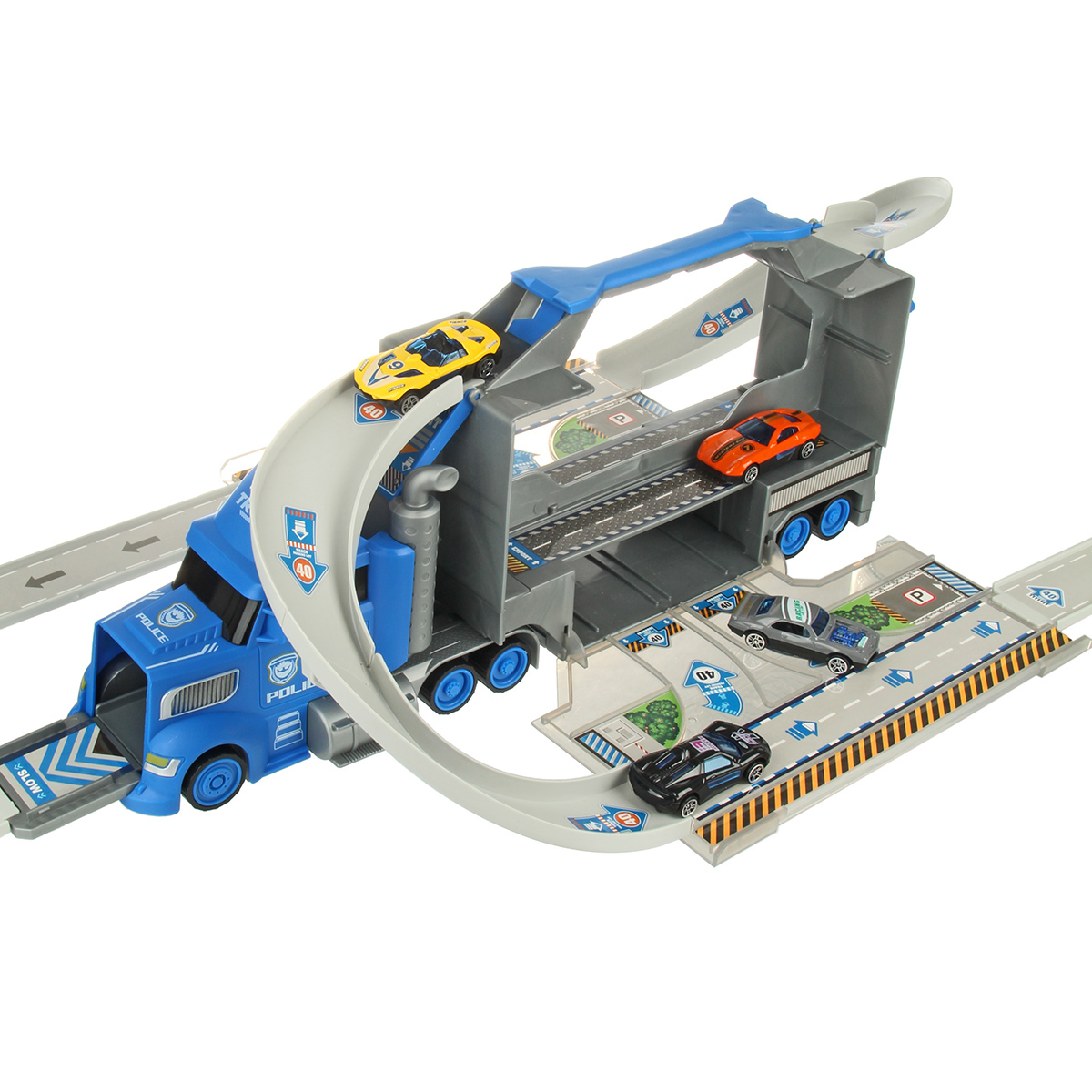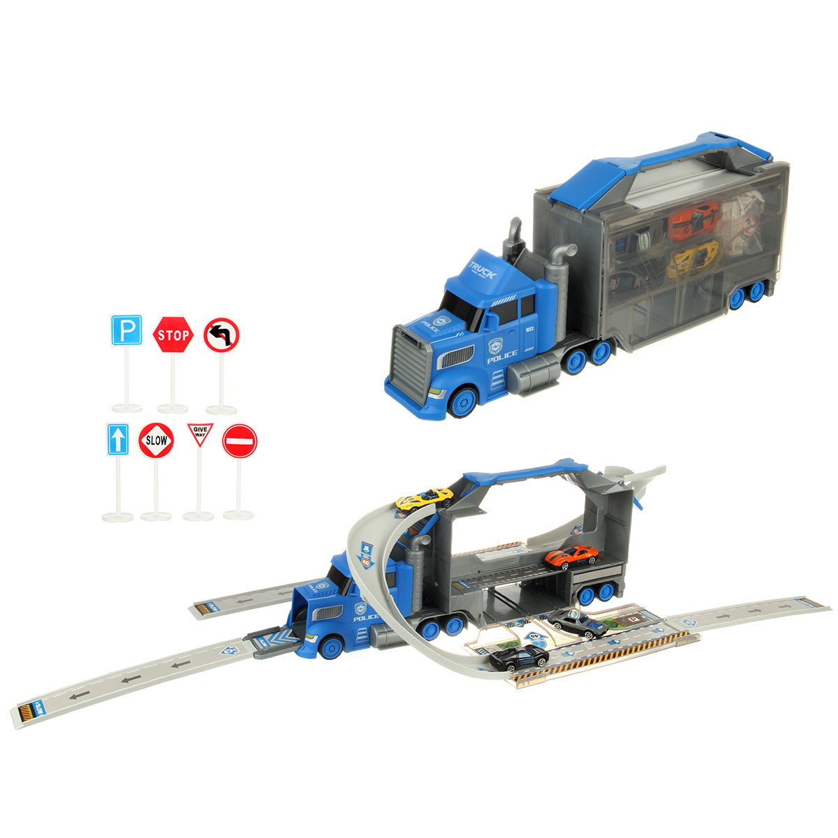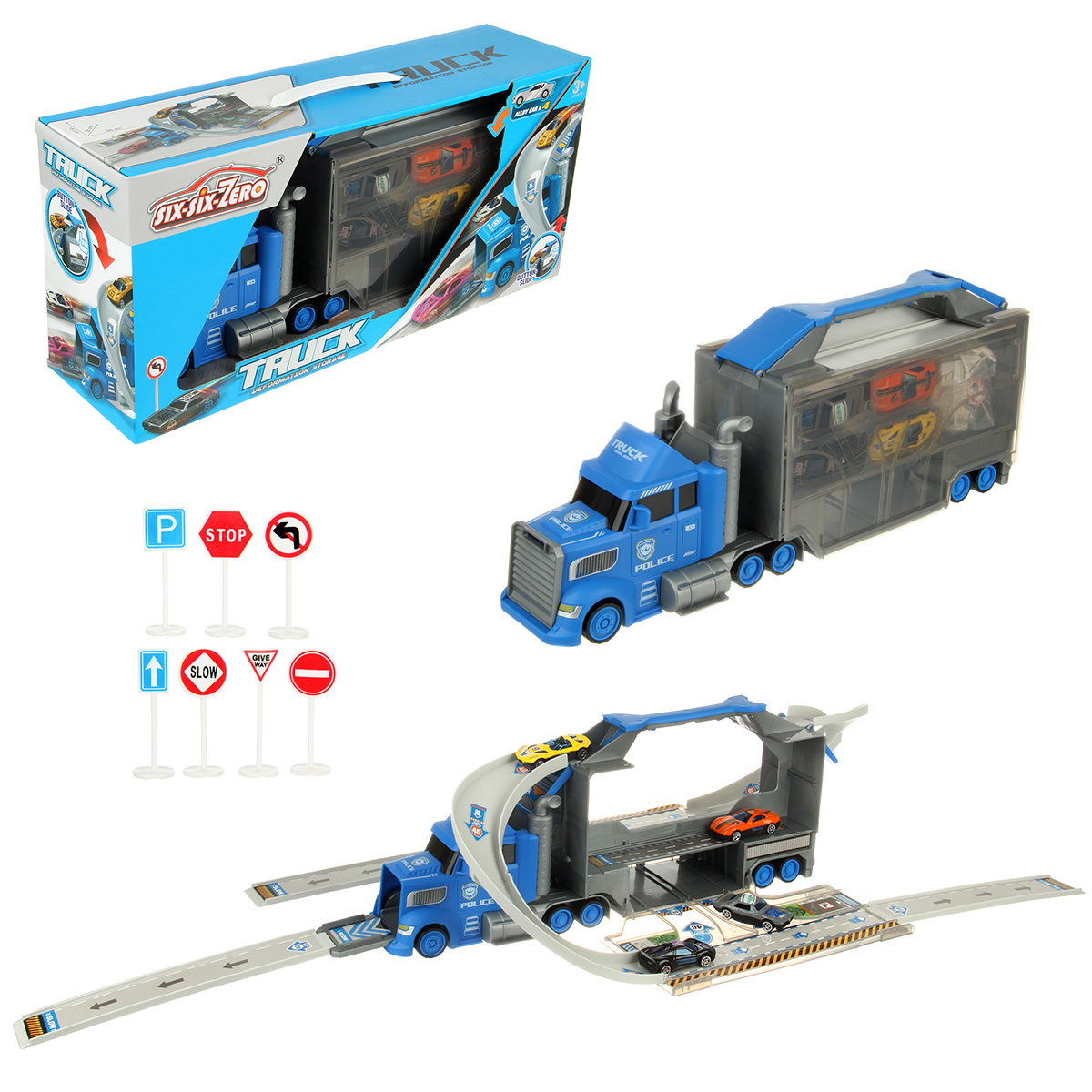 В наборе автовоз, детали для сборки горки 7 штук, 4 машинки, 7 дорожных знаков, инструкция по сборке на английском языке, набор наклеек.