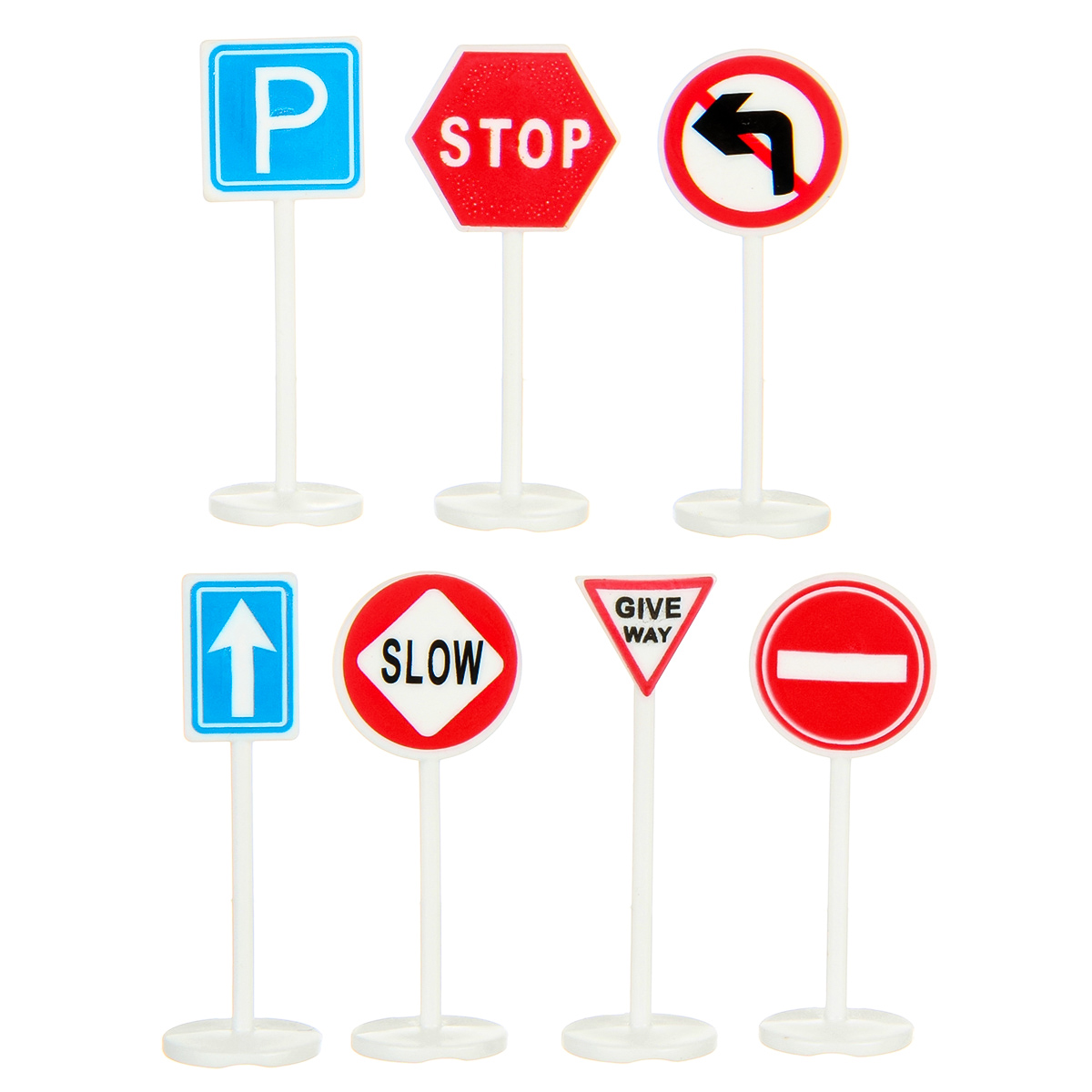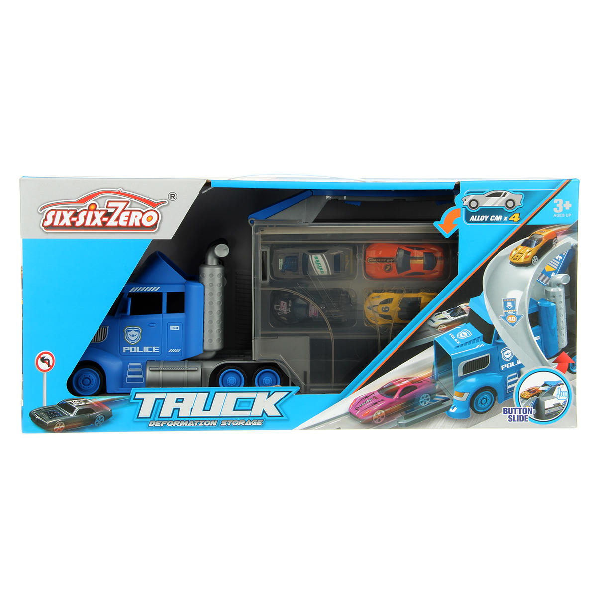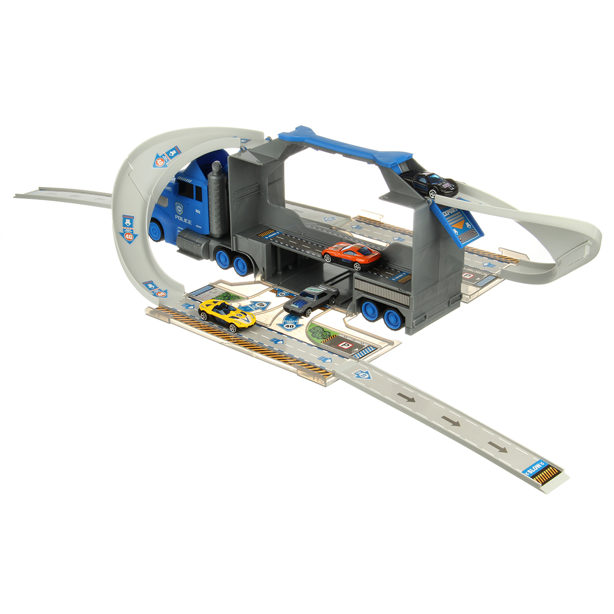 В наборе автовоз, детали для сборки горки 7 штук, 4 машинки, 7 дорожных знаков, инструкция по сборке на английском языке, набор наклеек.