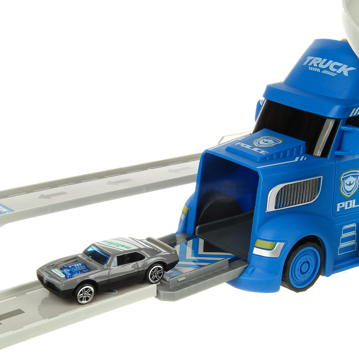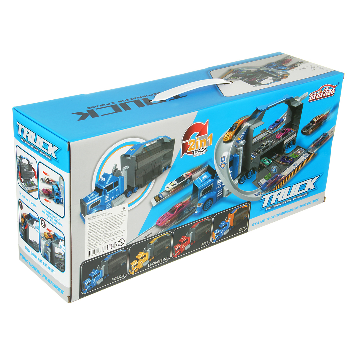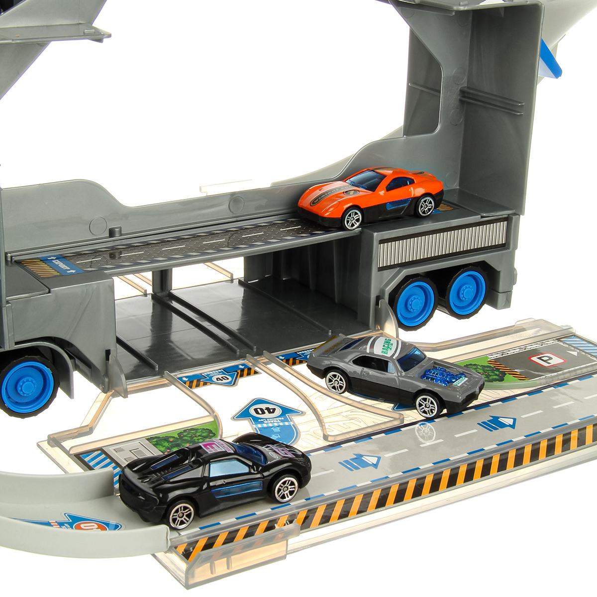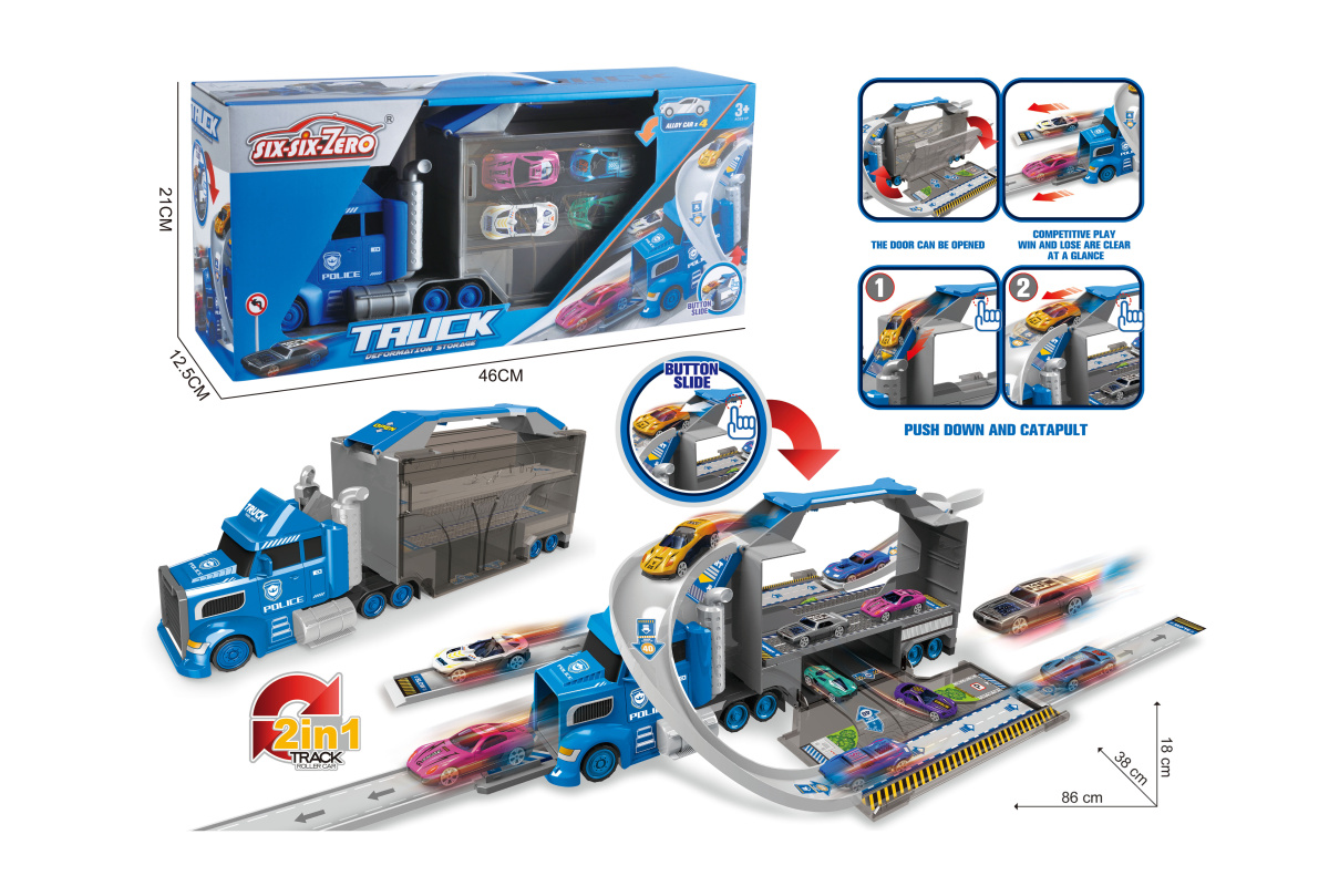1. У автовоза открываются боковые двери, раскладываются, представляют собой площадки для сборки. К автовозу присоединяем элементы трека. 2 катапульты на ручке, нажали на рычажок, площадка подтолкнула машинку, та поехала вперед.