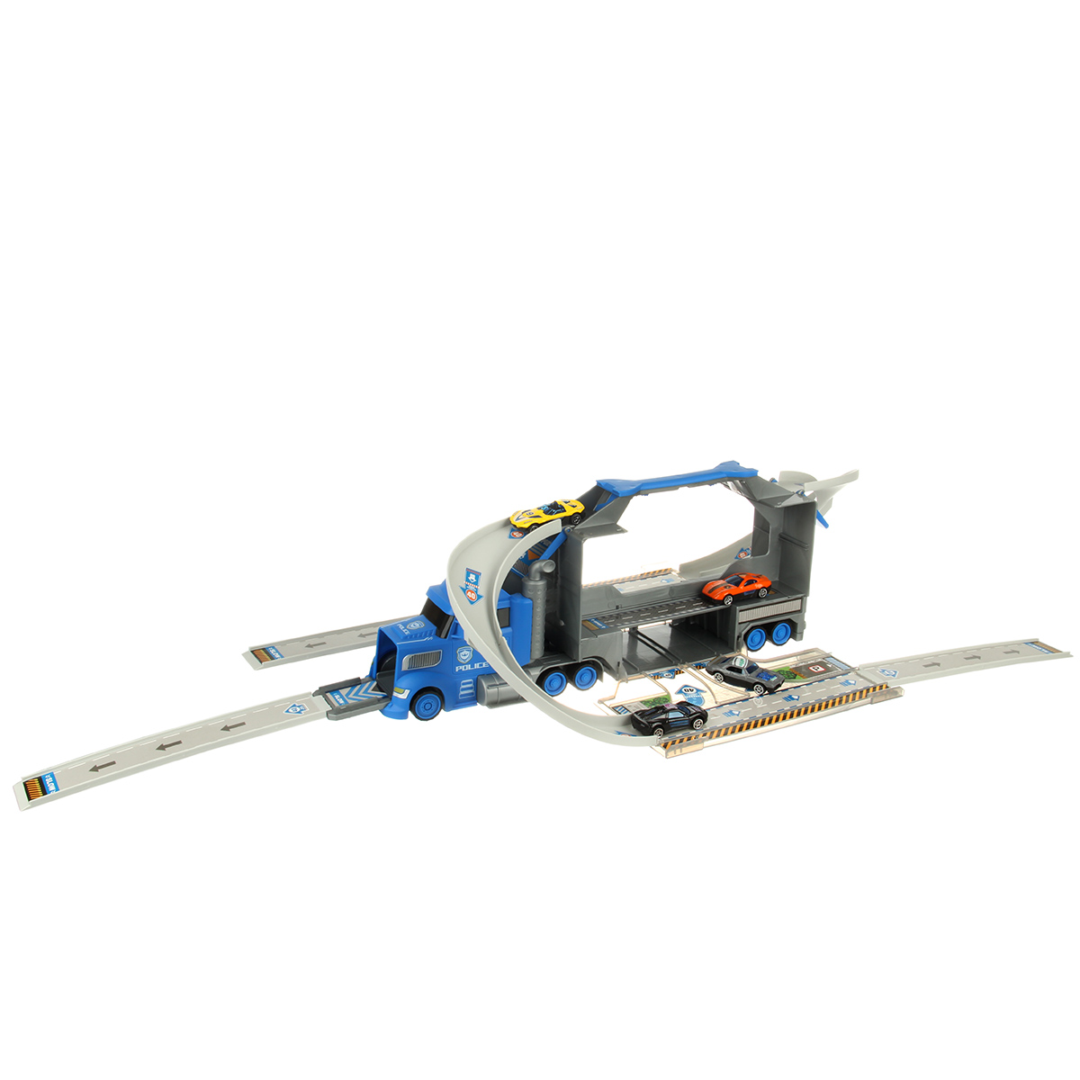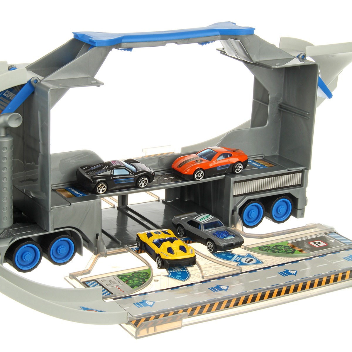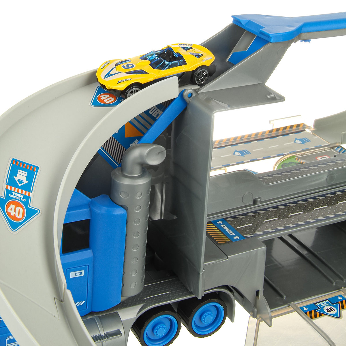 1. У автовоза открываются боковые двери, раскладываются, представляют собой площадки для сборки. К автовозу присоединяем элементы трека. 2 катапульты на ручке, нажали на рычажок, площадка подтолкнула машинку, та поехала вперед.