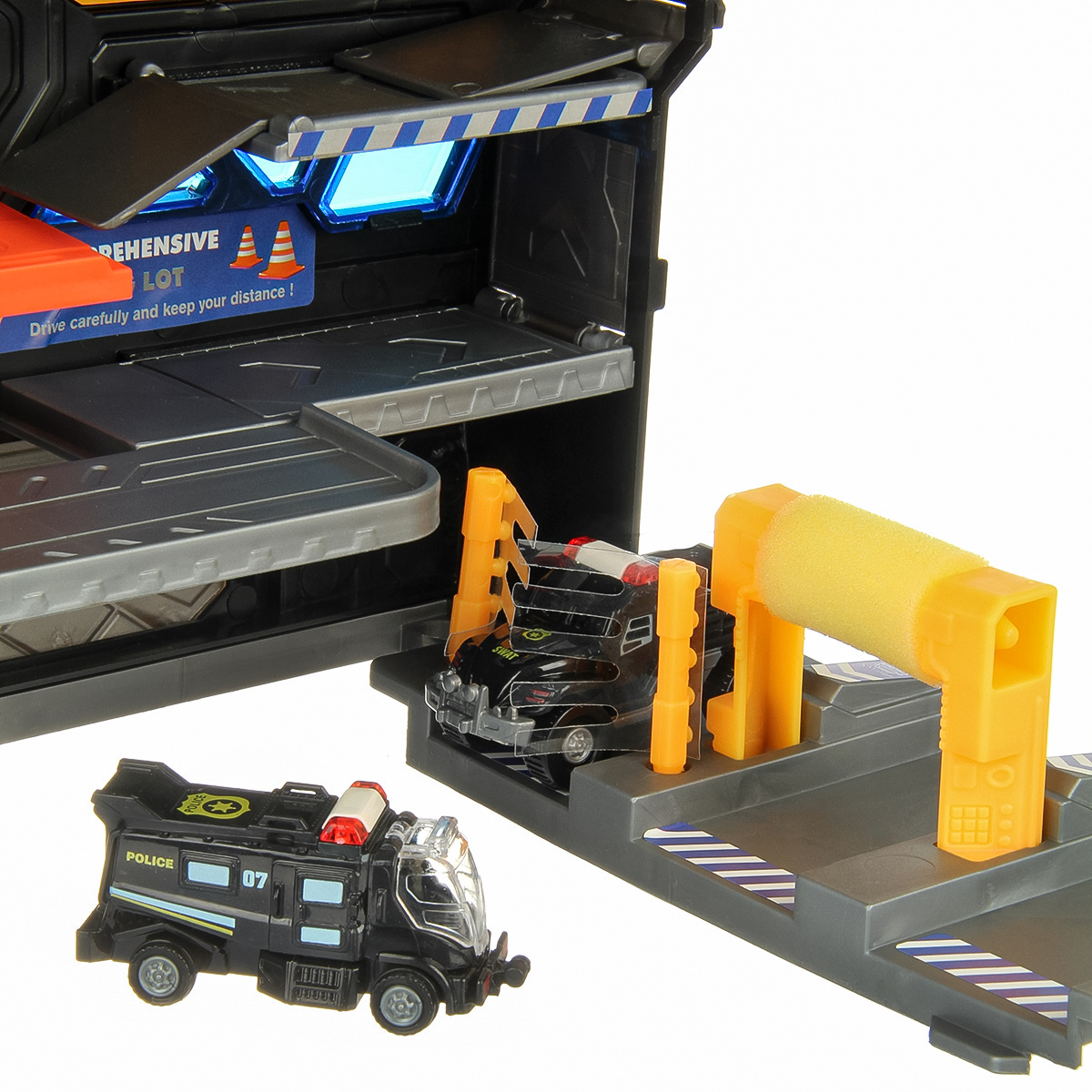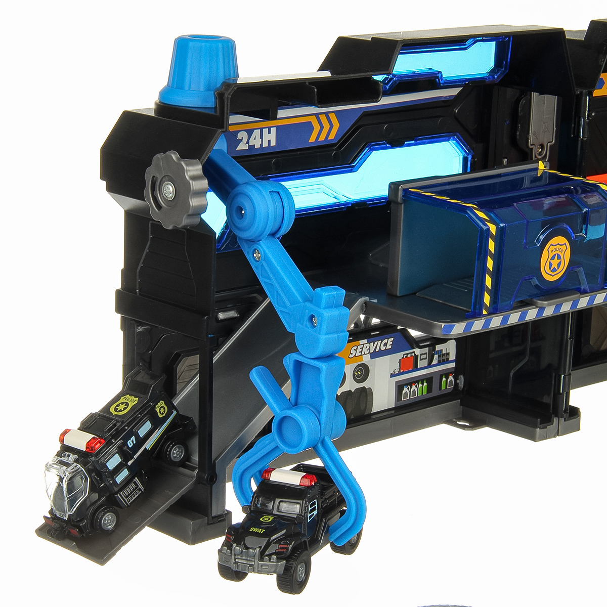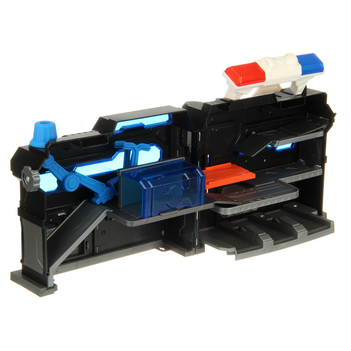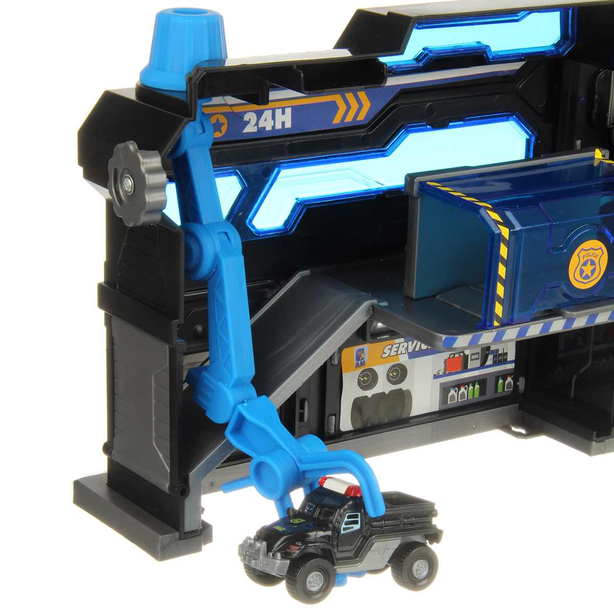 Можно опустить рычажок, опустится один из элементов парковки, можно сложить парковку чемоданчиком и нести его за ручку в виде полицейской мигалки.