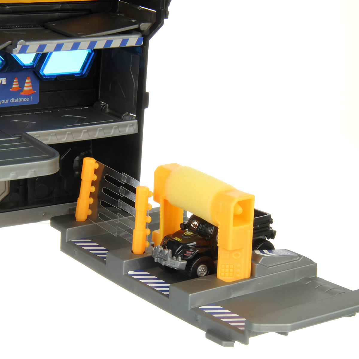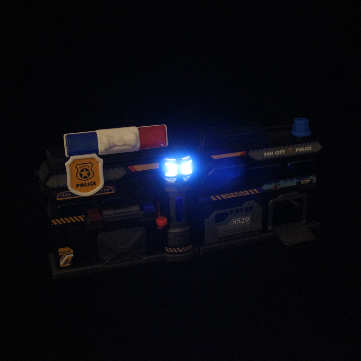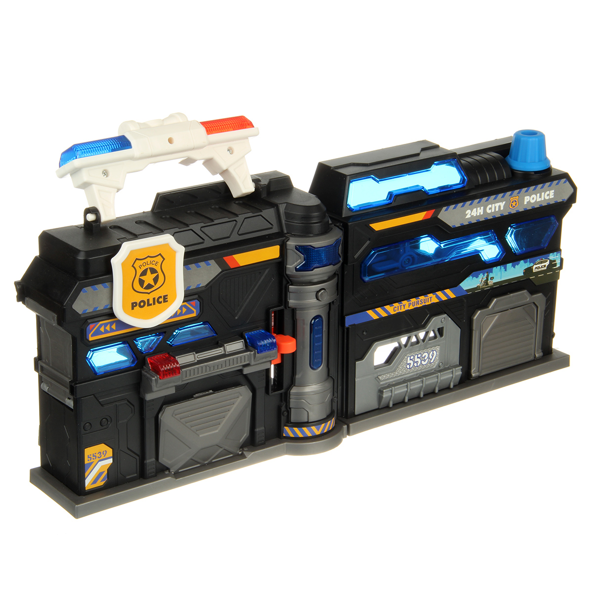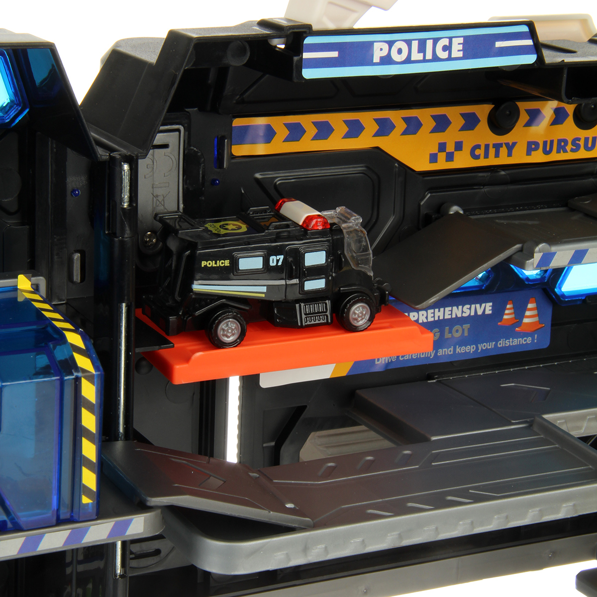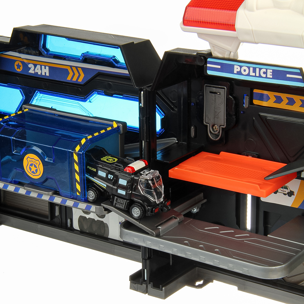 Можно опустить рычажок, опустится один из элементов парковки, можно сложить парковку чемоданчиком и нести его за ручку в виде полицейской мигалки.