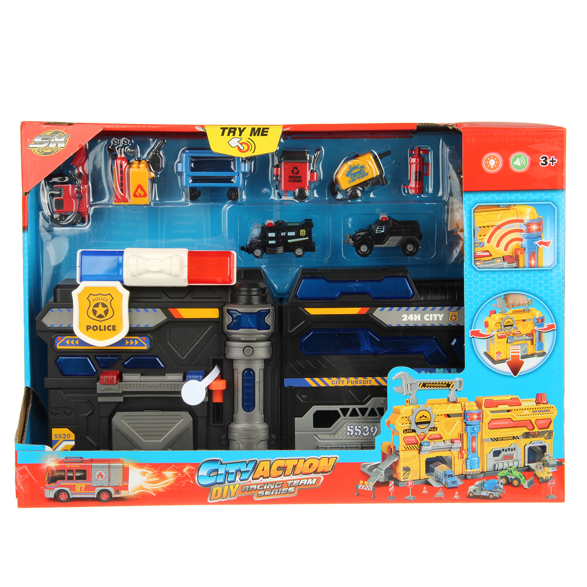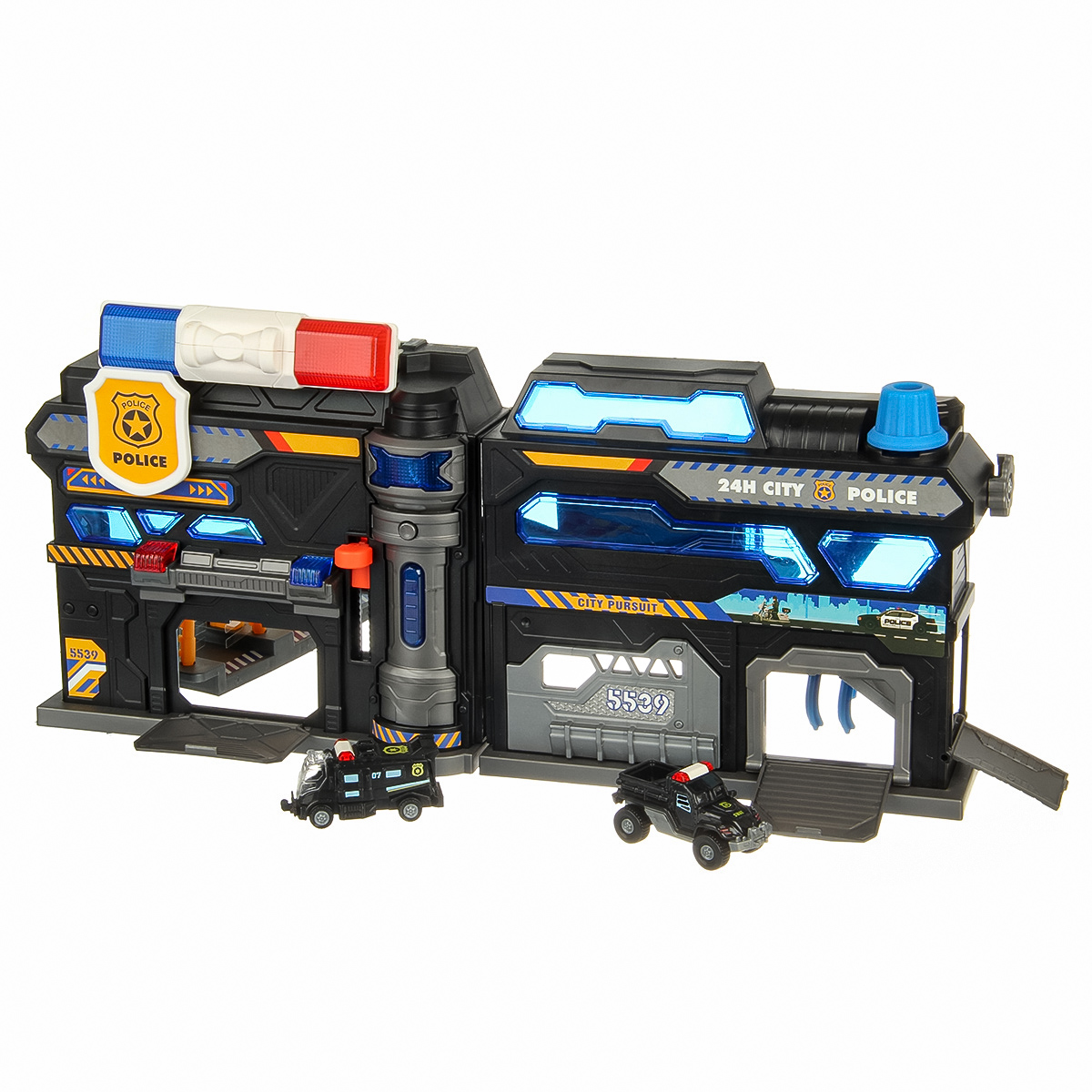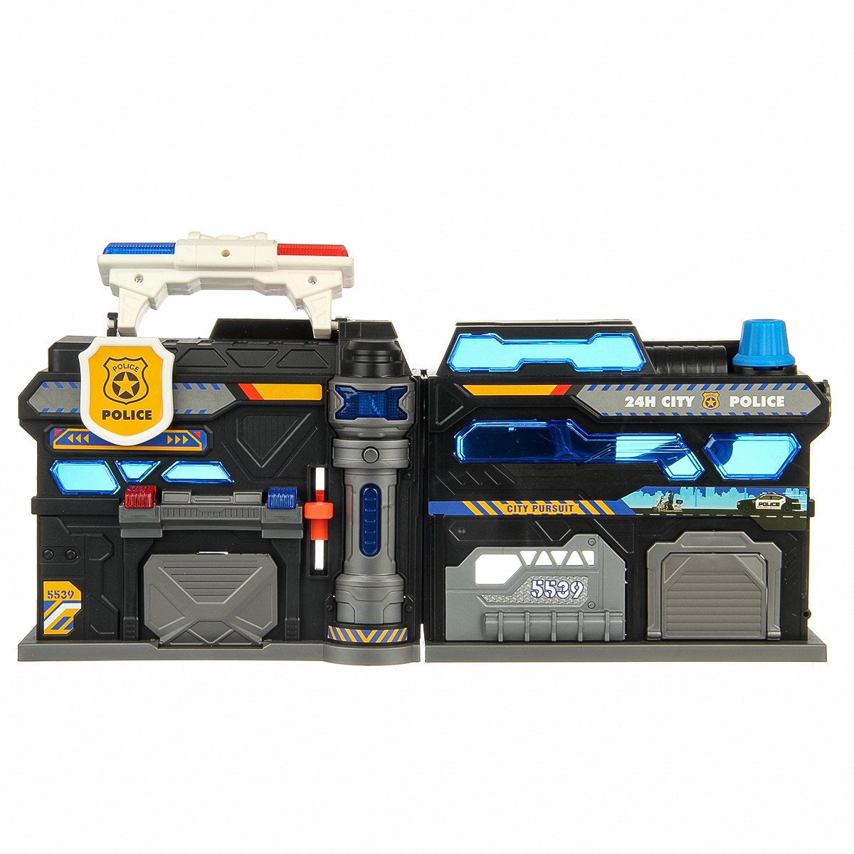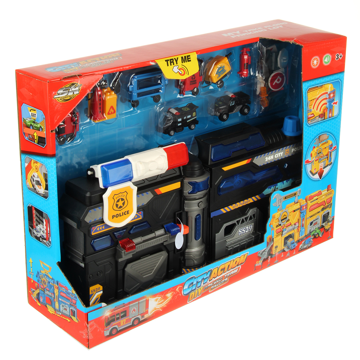 Можно опустить рычажок, опустится один из элементов парковки, можно сложить парковку чемоданчиком и нести его за ручку в виде полицейской мигалки.