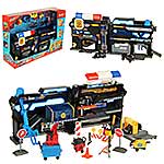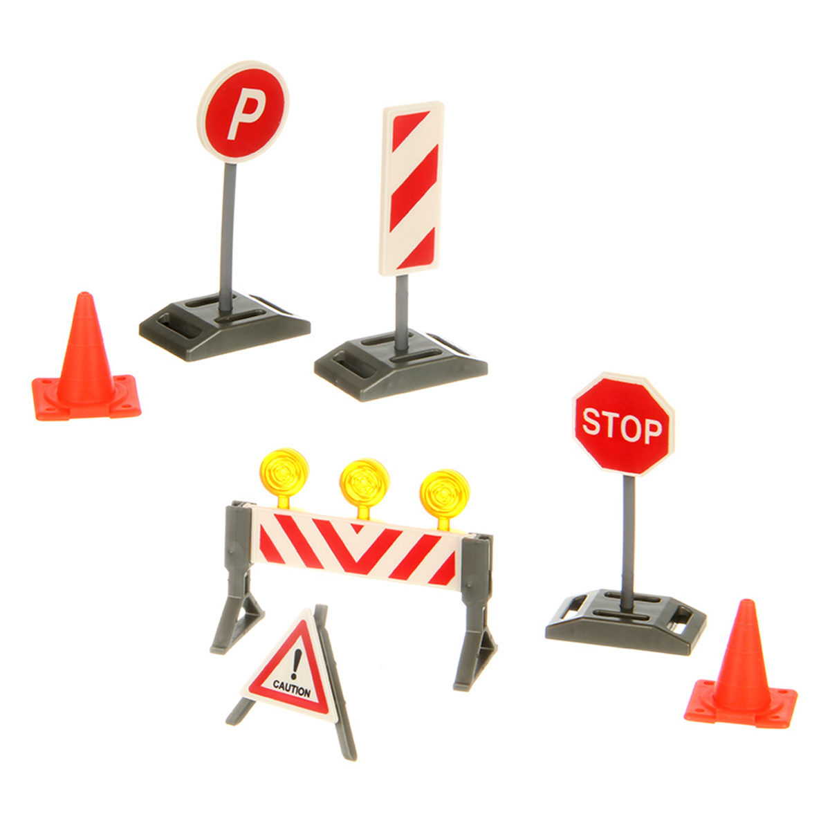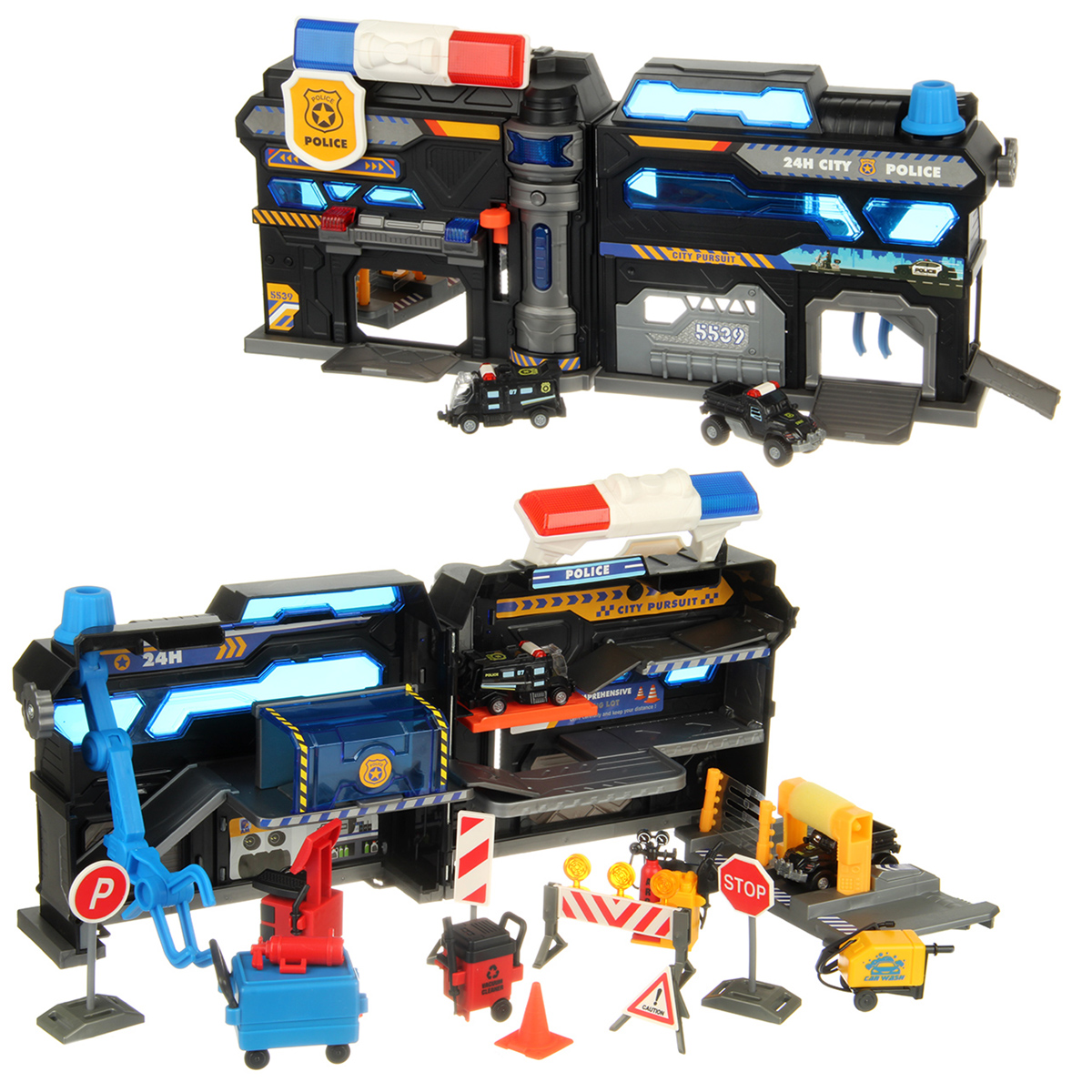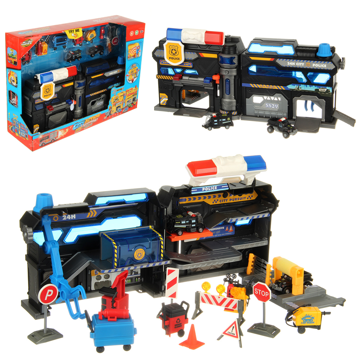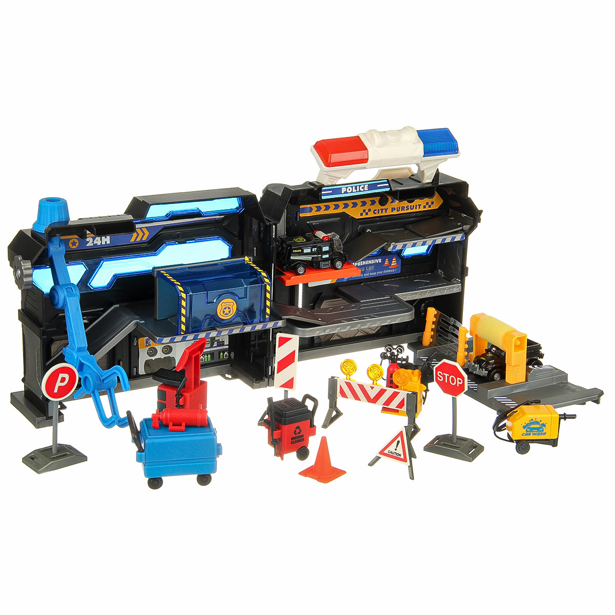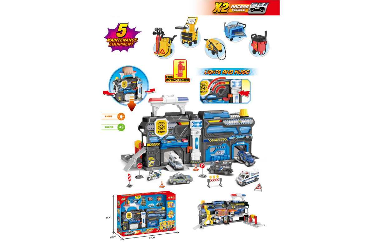 В наборе парковка, 2 машинки, 16 дорожных знаков, 4 оборудования для обслуживания машин