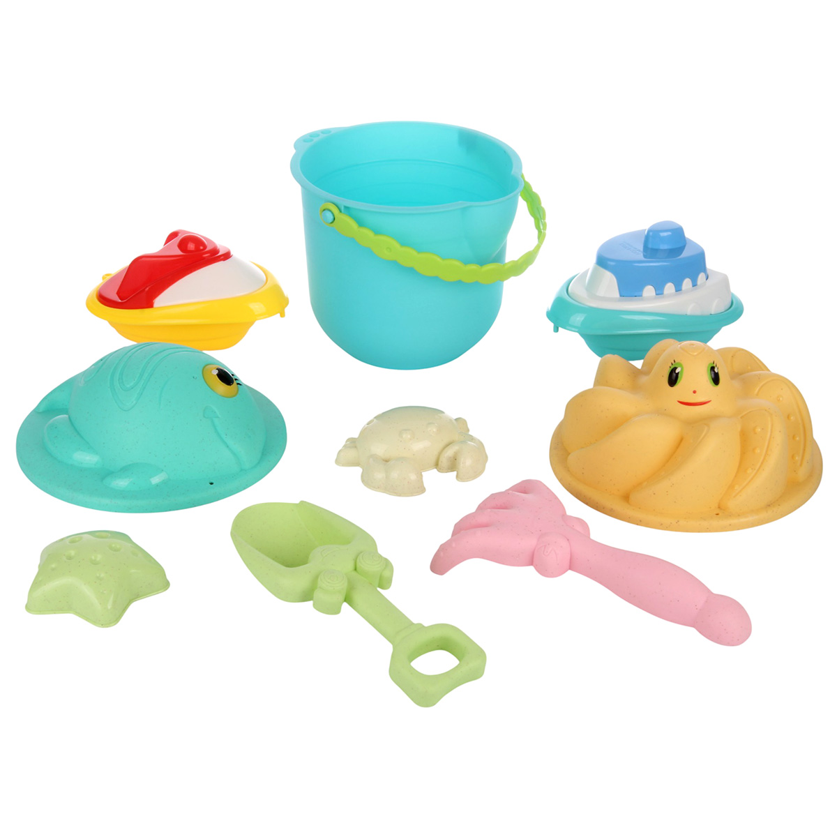 Детали для сборки песочницы для дома и улицы 8 шт, 3 маленькие формочки, 2 большие формочки, 2 кораблика, лопатка, грабли, ведерко.