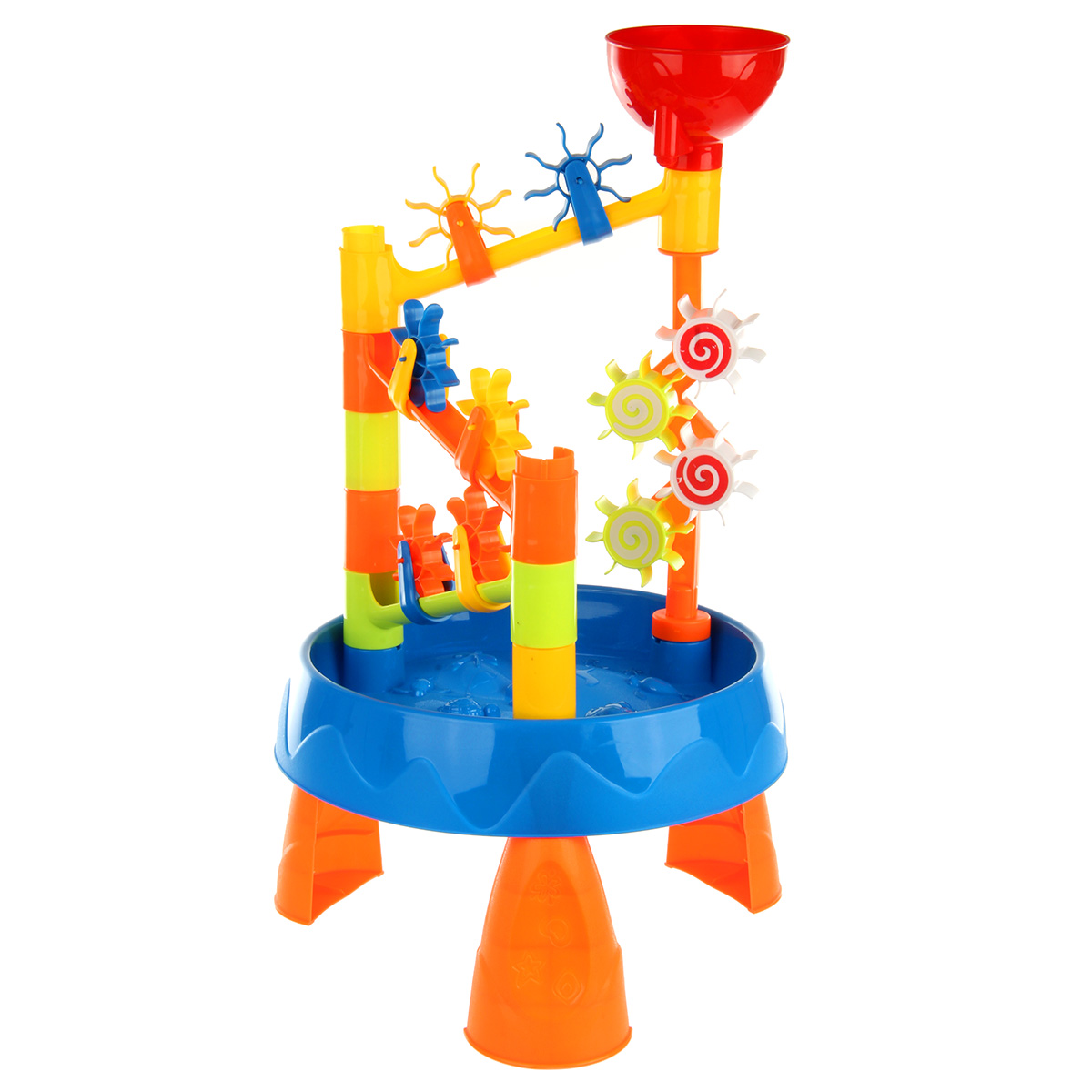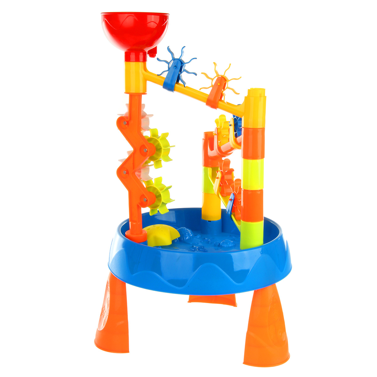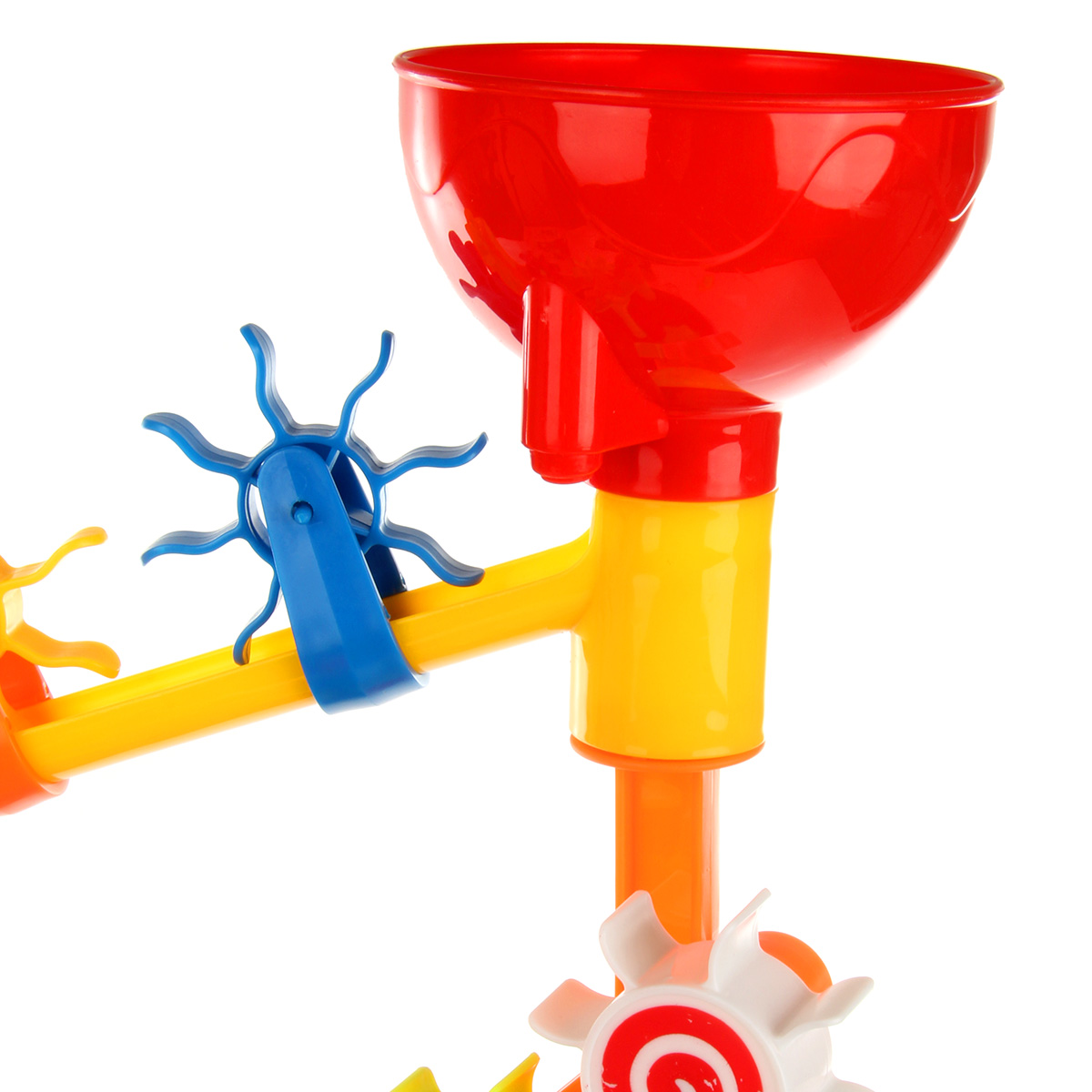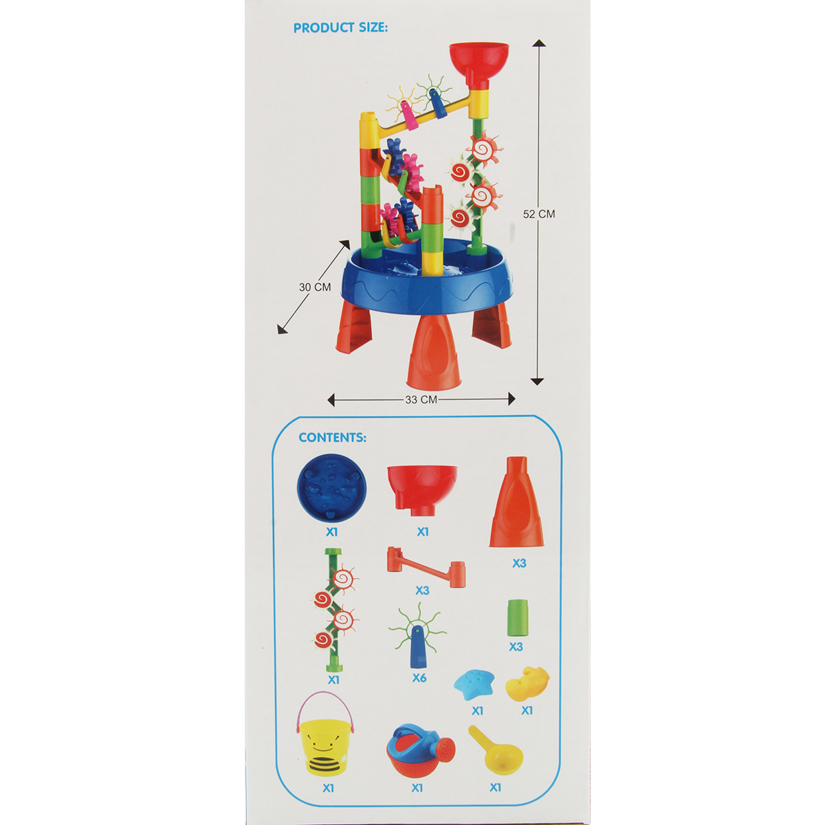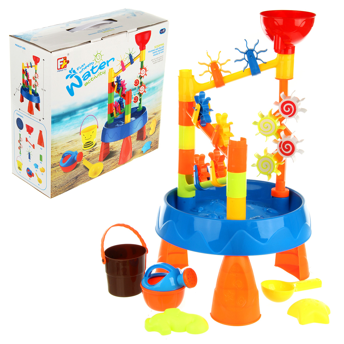 Интересный дизайн, яркая привлекательная расцветка, простая сборка игрового столика, лейка с формочками в наборе. Наливаем воду, смотрим, как крутятся шестеренки.