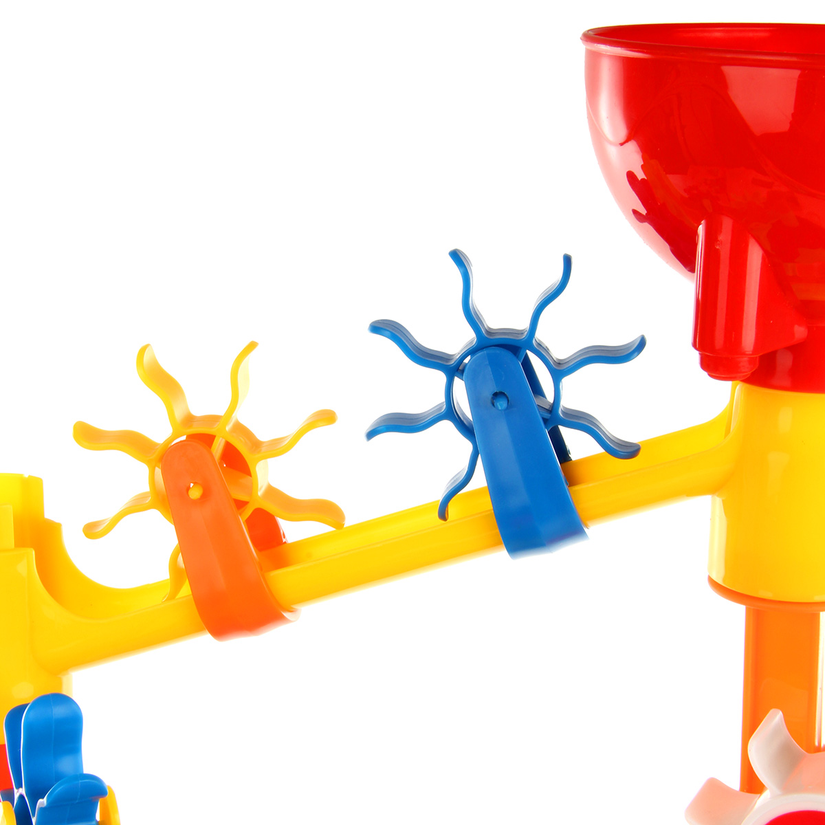 Наливаем воду в красную чашу, вода стекает по горкам вниз в поддон, шестеренки вращаются.