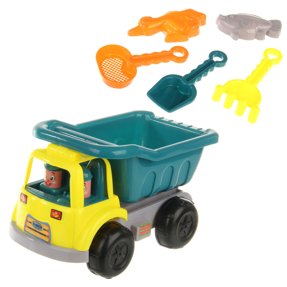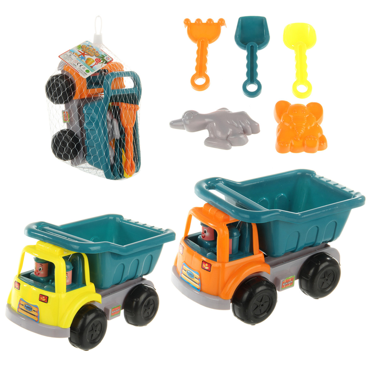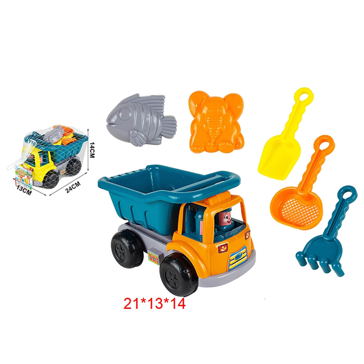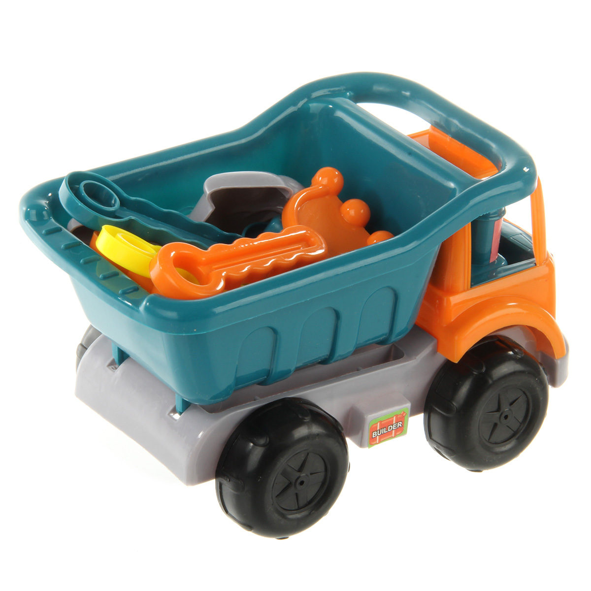 Замечательный песочный набор для увлекательных сюжетно-ролевых игр. Отличный развивающий подарок для вашего ребёнка. В комплект входит машинка, 2 лопатки, грабли, 2 формочки. Функционал игрушки: -кузов машинки поднимается и опускается; -машинка двигается вперёд и назад. Размеры упаковки: 23*14*14 см. Размеры машинки: 23*14*14 см. Размеры лопатки: 14*5*3 см. Размеры формочки: 10*5*3 см. Изготовлено из пластика.