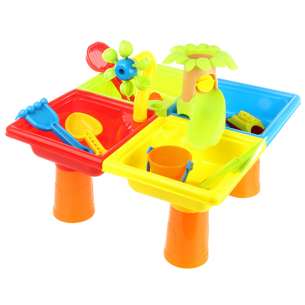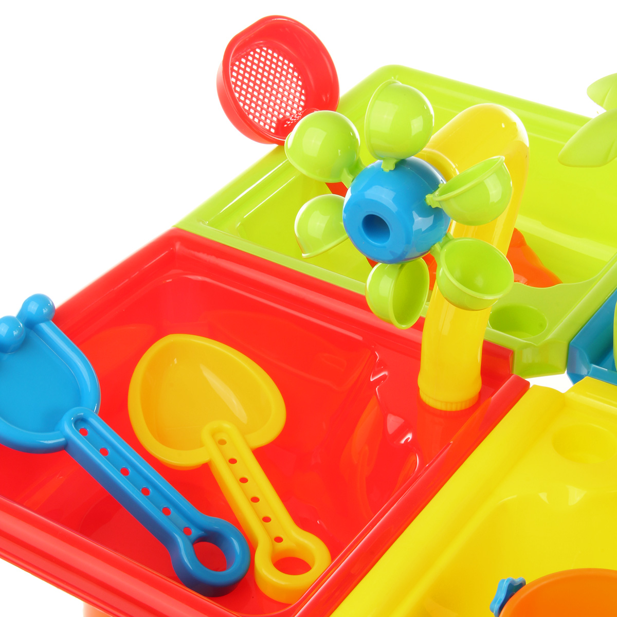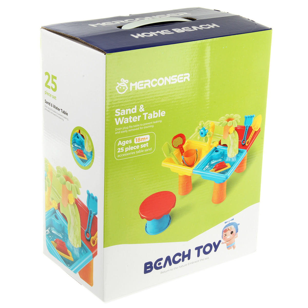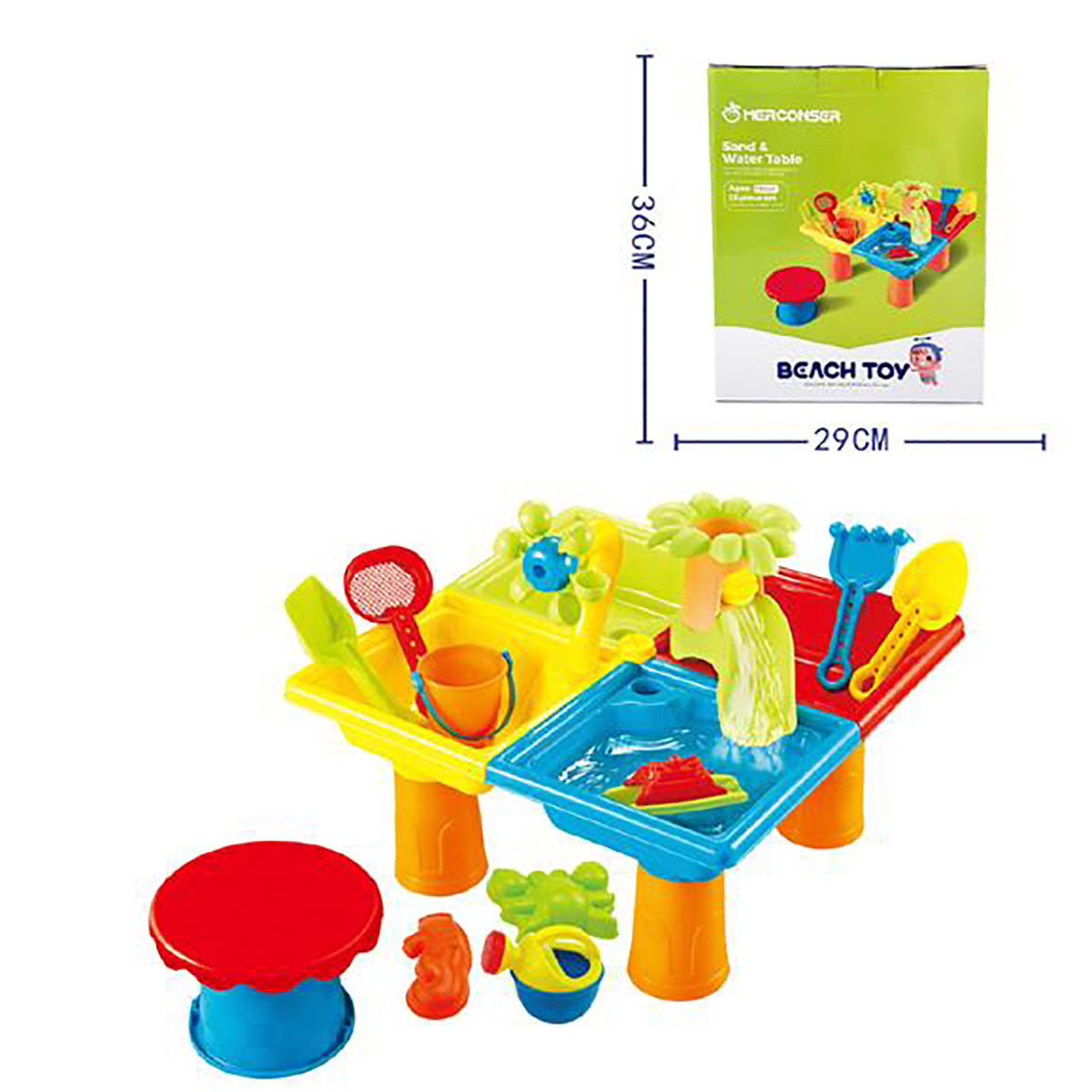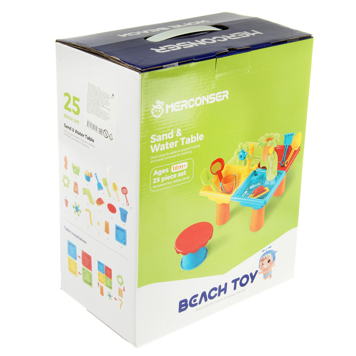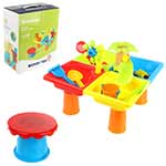 Песочный набор в виде столика. Внутри столика содержатся аксессуары для игр с песком и с водой. С таким набором можно весело играть с песком, стол разделён на несколько частей, не соединяющихся между собой, при попадании воды на мельницу она вращается. Набор выполнен в ярком дизайне и обязательно полюбится вашему ребёнку. В комплект входят детали для сборки столика, стул, 2 лопатки, 2 формочки, лейка, грабли, сито, кораблик, ведро. Функционал игрушки: -столик легко собирается и разбирается; -мельница при попадании воды начинает вращаться. Размеры упаковки: 29*17*36 см. Размеры столика: 45*45*32 см. Размеры стула: 18*18*12 см. Размеры лейки: 11*7*8 см. Размеры сита: 16*9*2 см. Размеры ведра: 8*9*7 см. Размеры грабель: 17*8*3 см. Размеры кораблика: 11*5*4 см. Изготовлено из безопасного пластика.