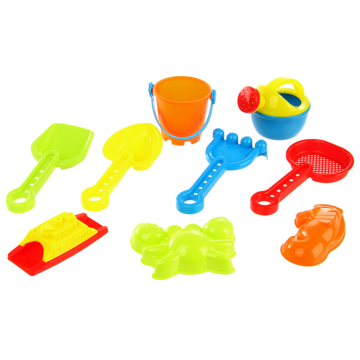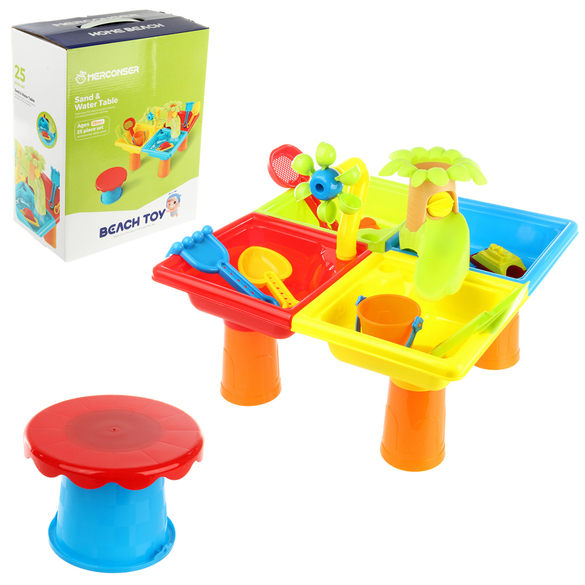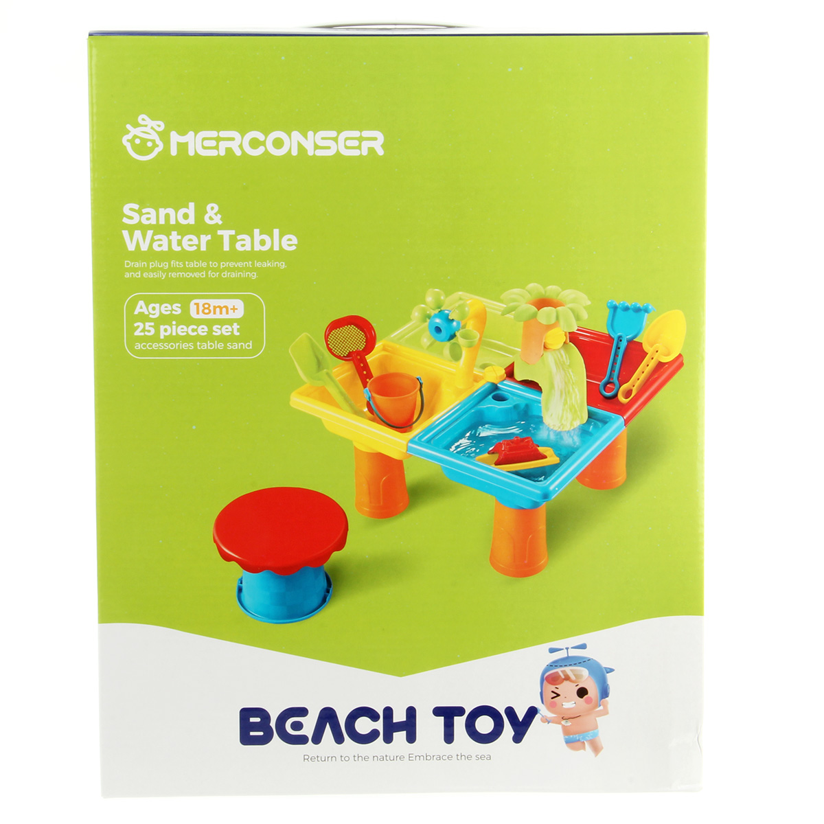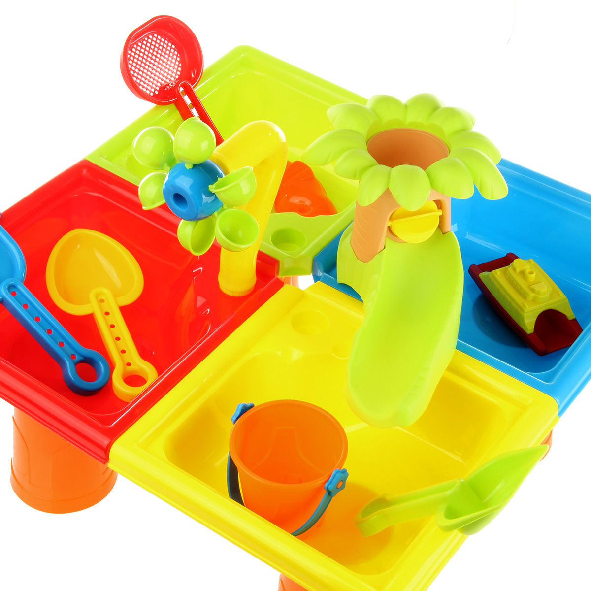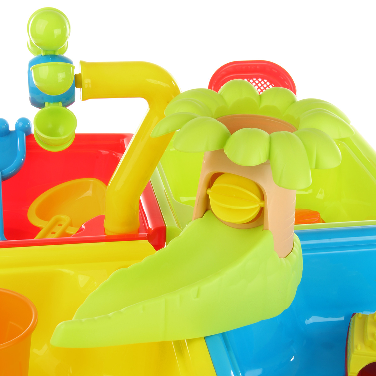 Песочный набор в виде столика. Внутри столика содержатся аксессуары для игр с песком и с водой. С таким набором можно весело играть с песком, стол разделён на несколько частей, не соединяющихся между собой, при попадании воды на мельницу она вращается. Набор выполнен в ярком дизайне и обязательно полюбится вашему ребёнку. В комплект входят детали для сборки столика, стул, 2 лопатки, 2 формочки, лейка, грабли, сито, кораблик, ведро. Функционал игрушки: -столик легко собирается и разбирается; -мельница при попадании воды начинает вращаться. Размеры упаковки: 29*17*36 см. Размеры столика: 45*45*32 см. Размеры стула: 18*18*12 см. Размеры лейки: 11*7*8 см. Размеры сита: 16*9*2 см. Размеры ведра: 8*9*7 см. Размеры грабель: 17*8*3 см. Размеры кораблика: 11*5*4 см. Изготовлено из безопасного пластика.