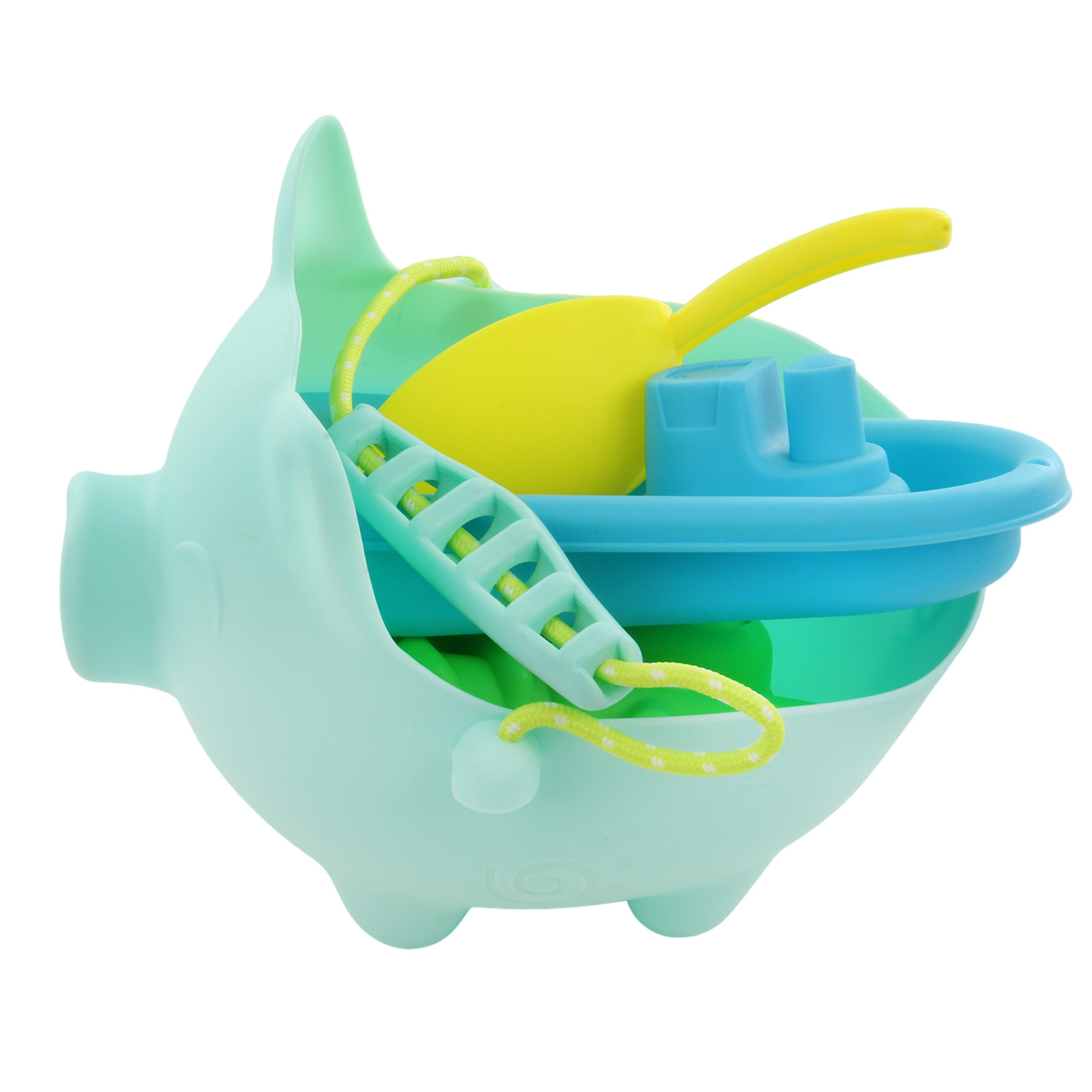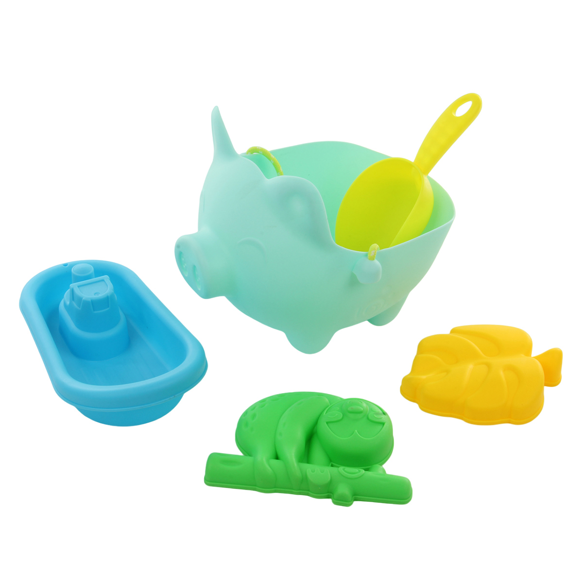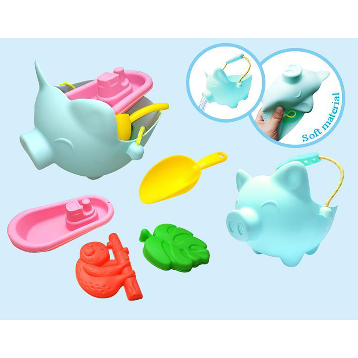Несколько предметов в одном наборе, лейка в виде свинки, удобный совочек и формочки для песка.