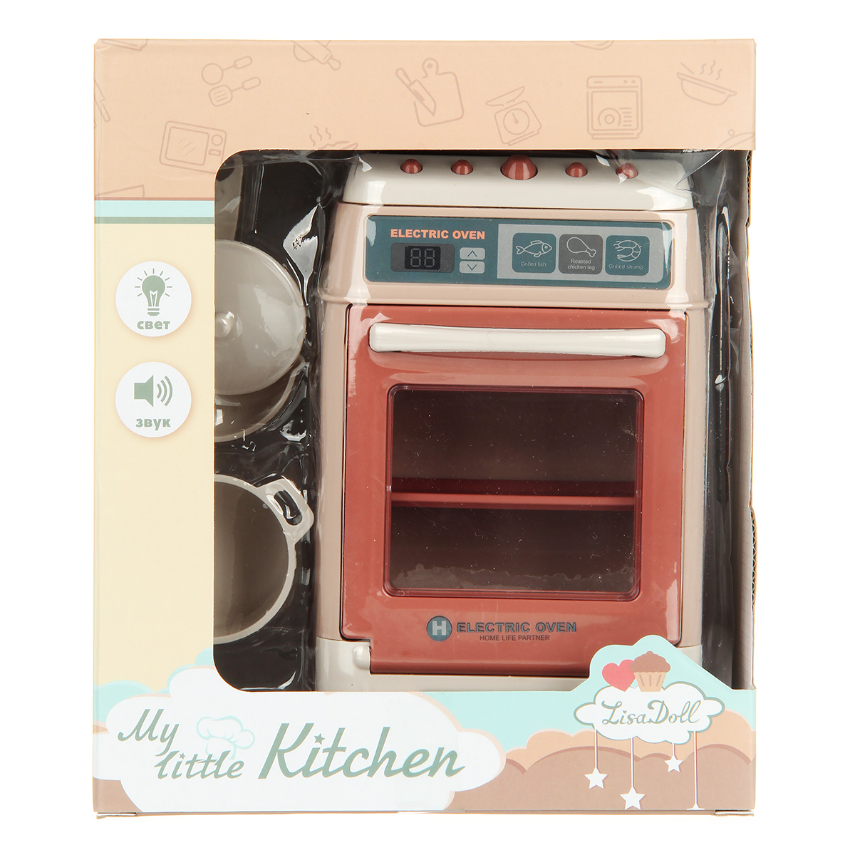 3. При нажатии кнопки на плите включается красная подсветка конфорок плиты, игрушка начинает издавать звуки готовки, бульканье. Маленькие кнопки муляжи, не нажимаются.