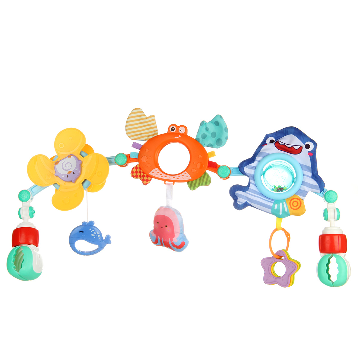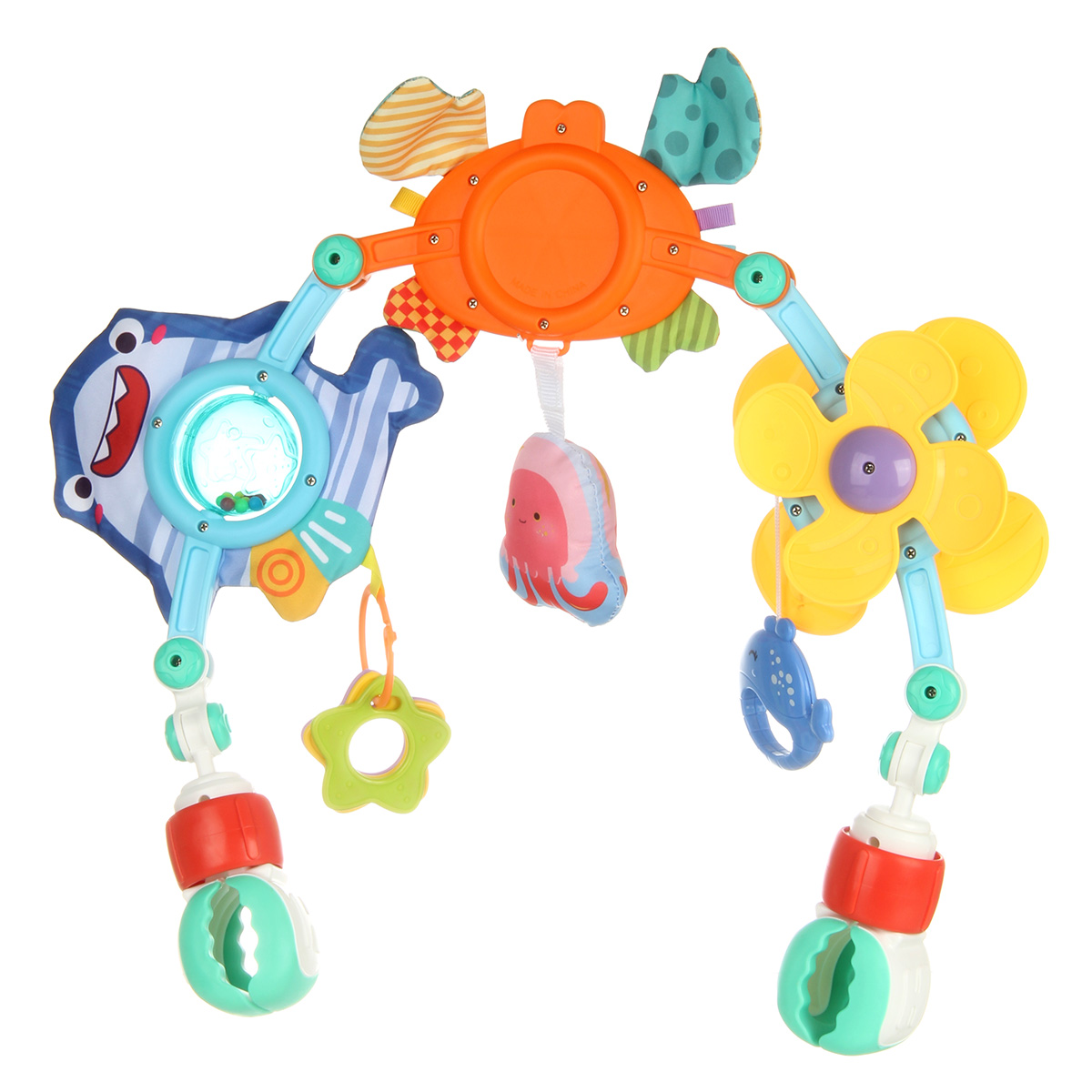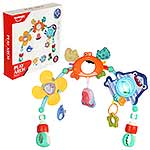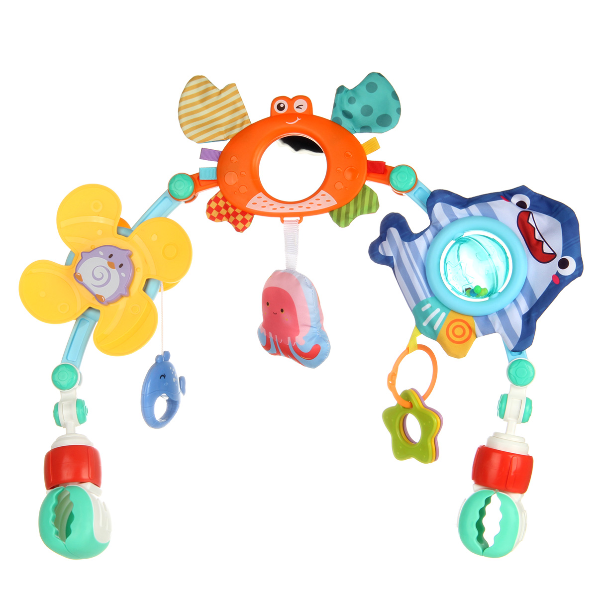 Дуга игровая для кроватки и коляски со множеством элементов. Удобство крепления, яркие, привлекающие внимание подвесные игрушки для новорожденных детей, здесь есть погремушка, пищалка, игрушка шуршалка, мягкая игрушка, прорезыватели.