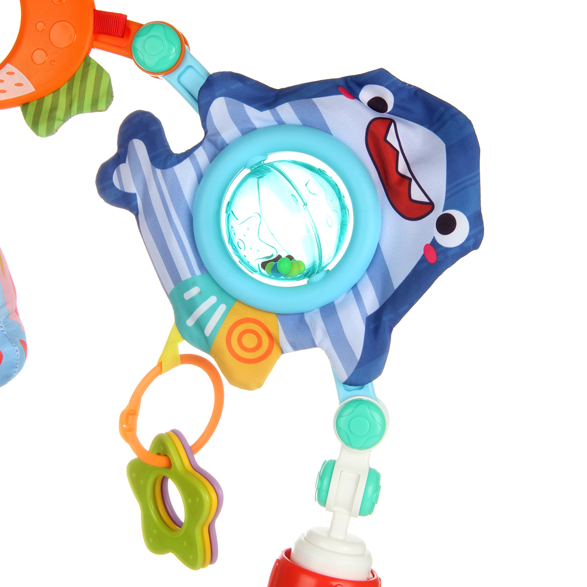 Акула. Акула изготовлена из шуршащей ткани. Сфера с шариками вращается, шарики шумят, вращаем сферу, развиваем тактильные навыки. Элементы колечки мягкие, можно использовать в качестве прорезывателей. Кольцо с прорезывателями можно снять.