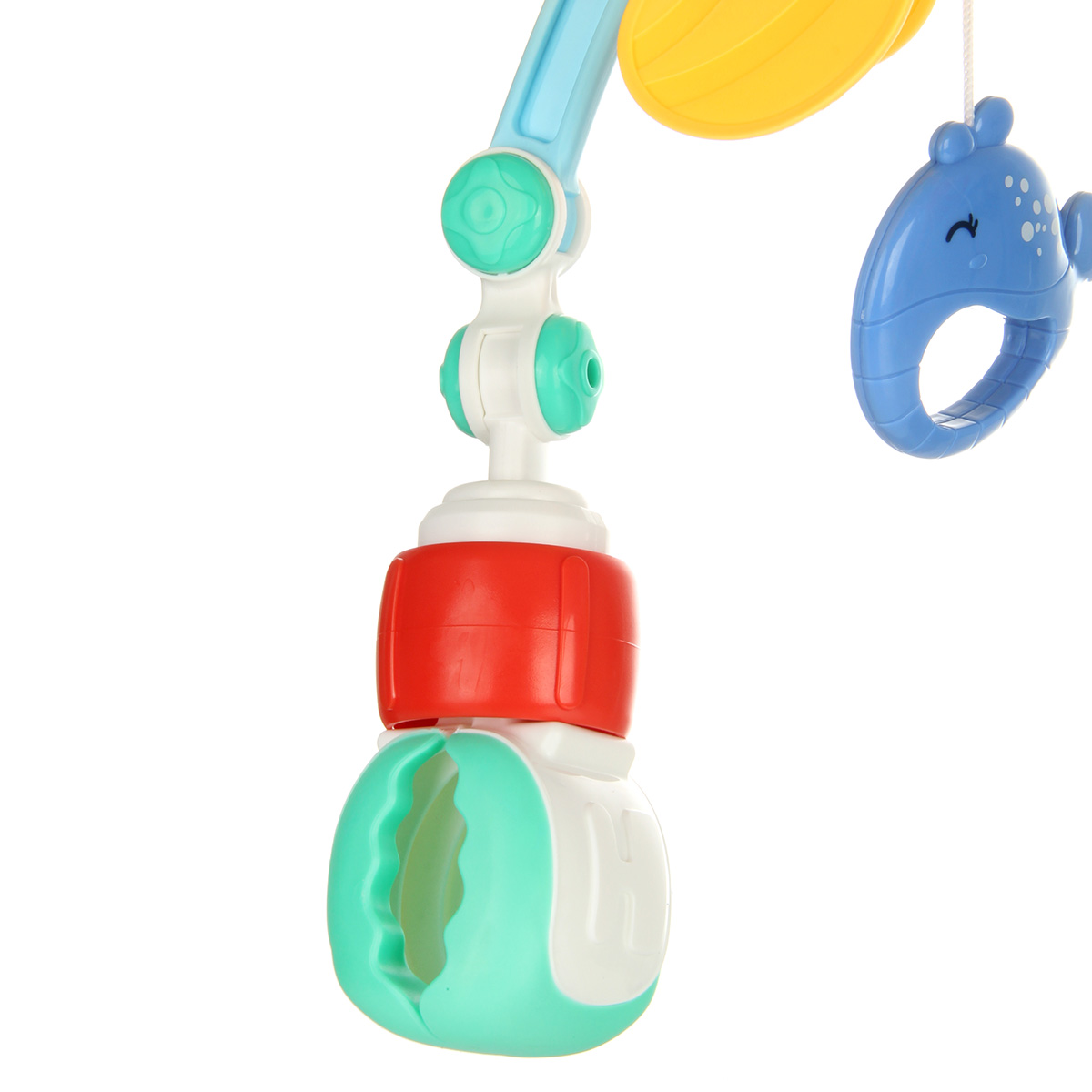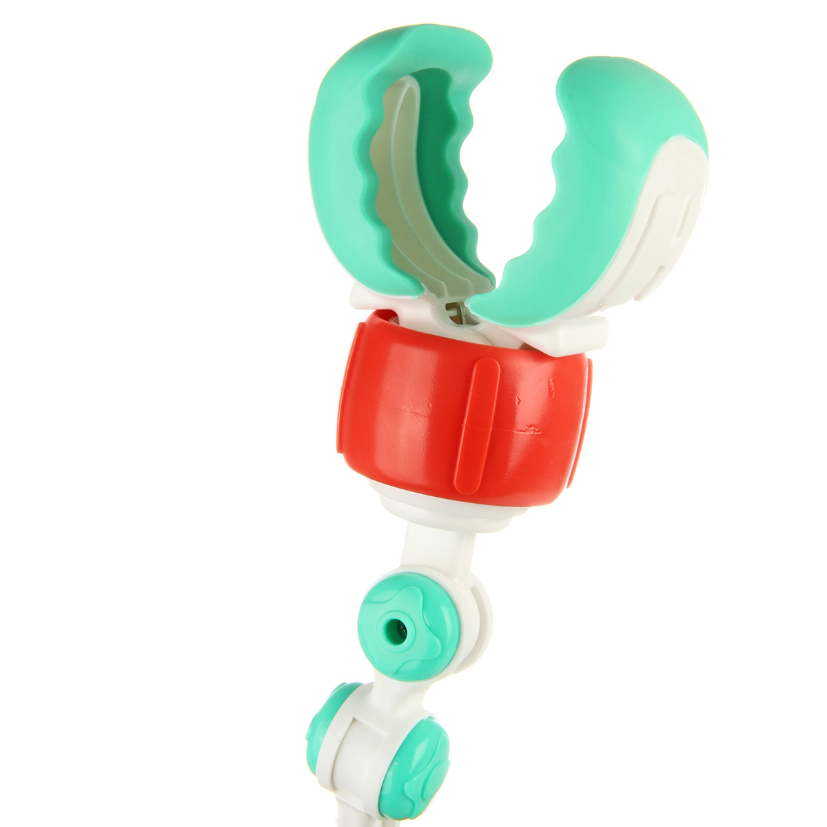 1. Захват на коляску или на бортик кроватки происходит за счет прокрутки красных колец на концах дуги, захваты клипсы раздвигаются, сдвигаются, универсальное крепление.