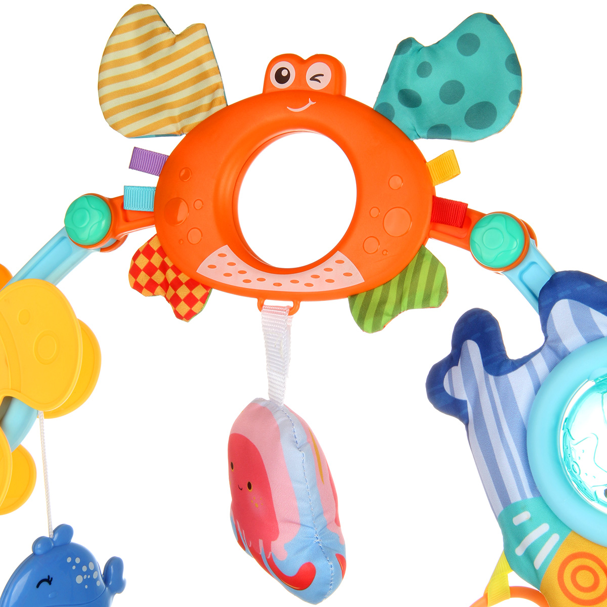 Зеркальце крабик. Клешни тканевые, сделаны из шуршащего материала, мнем клешни, развиваем слуховое восприятие. Зеркало отображает изображение, безопасное зеркальце. Текстильная игрушка медуза с мягким наполнителем, пискнет, если нажать на нее. Медуза подвеска снимается, можно играть отдельно.