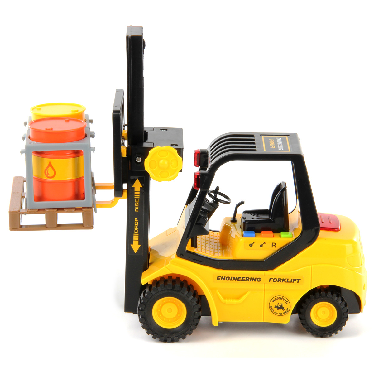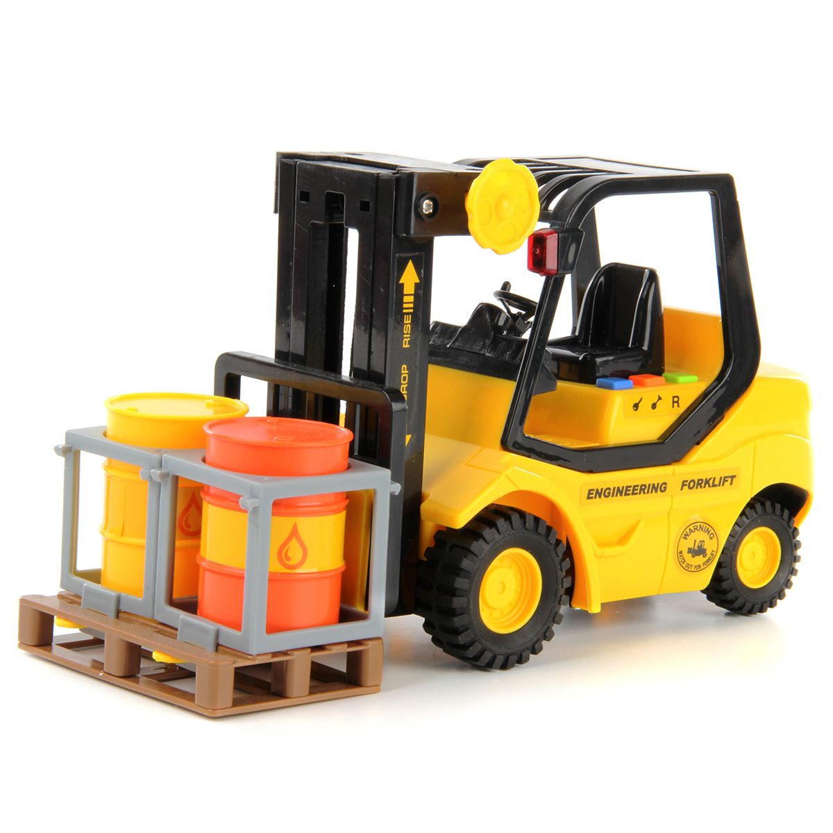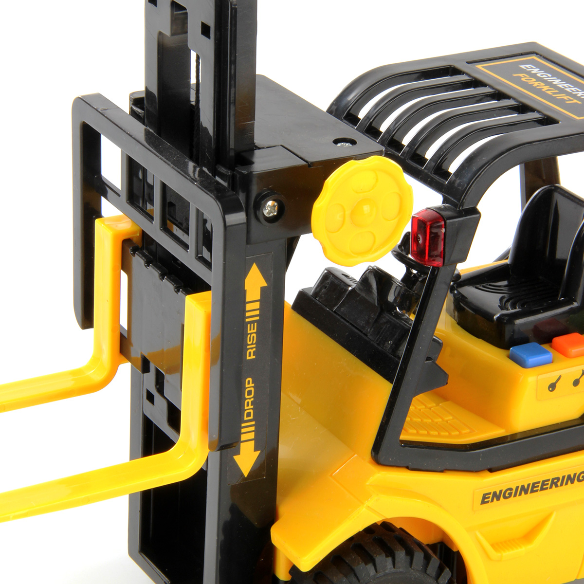 - на корпусе погрузчика располагаются 3 кнопки. При поочередном нажатии на них погрузчик будет издавать звуки заводящегося двигателя, гудка и заднего хода, большая кнопка на корпусе станет подсвечиваться;