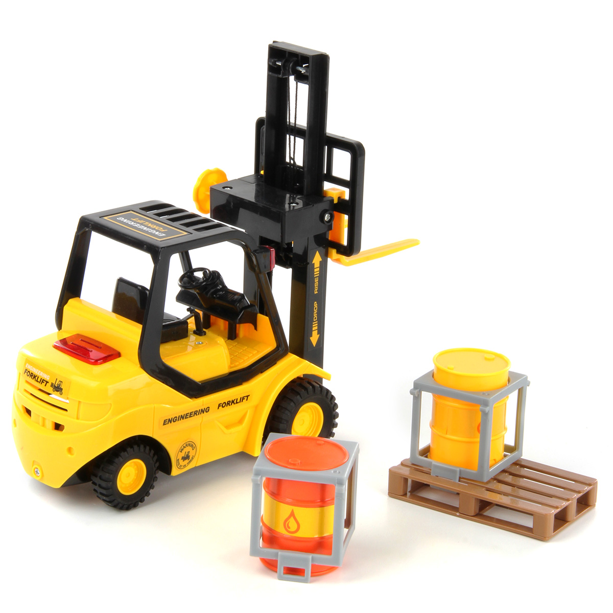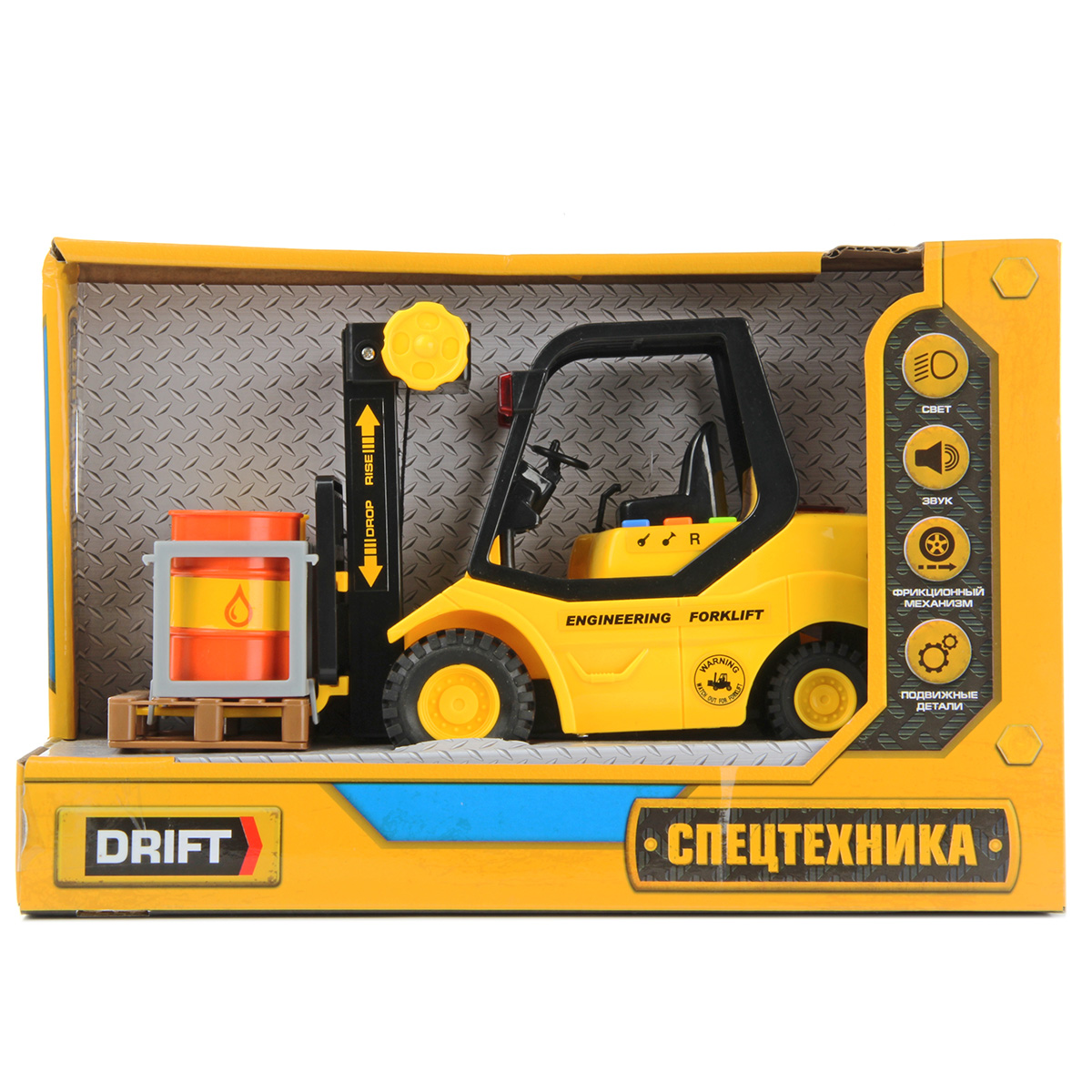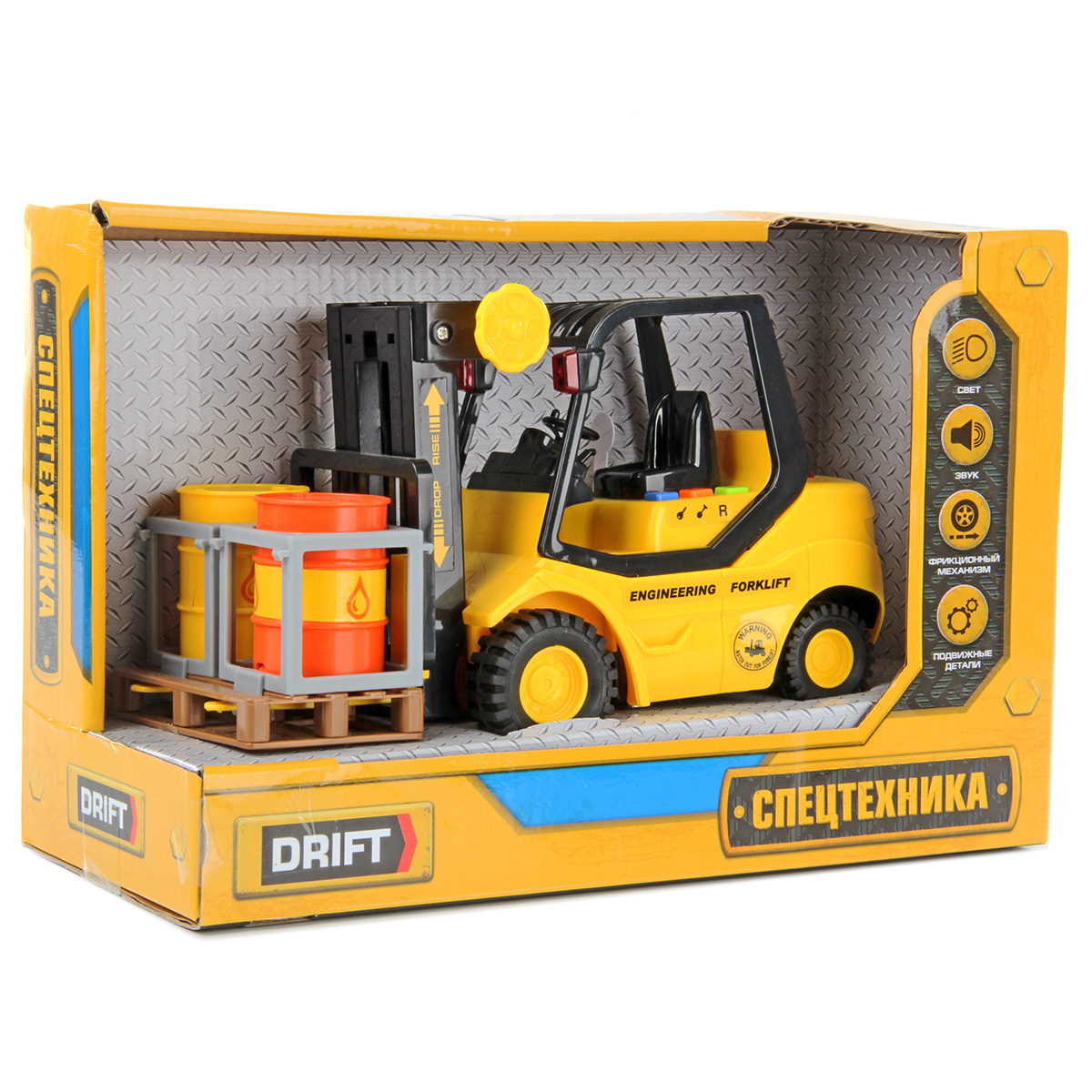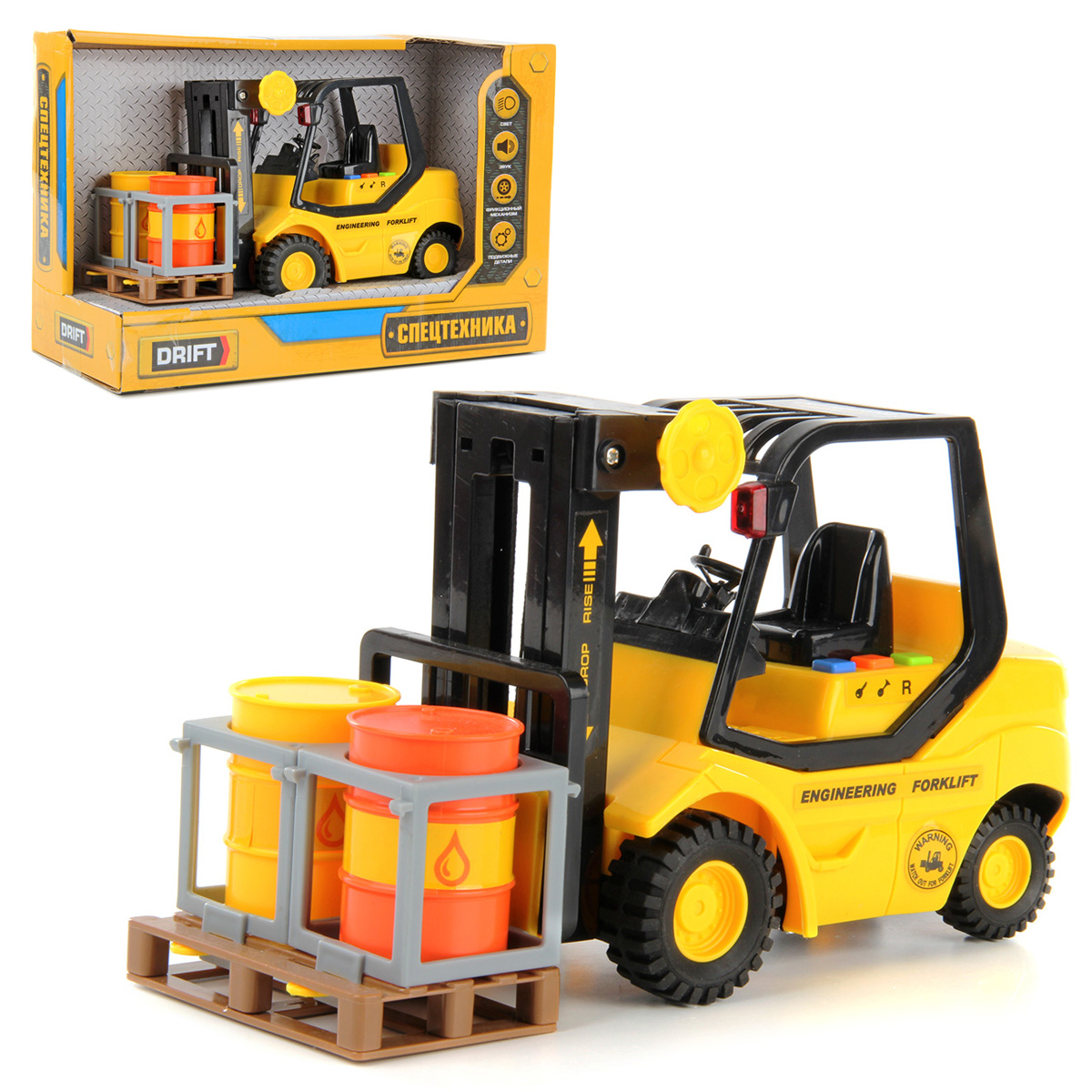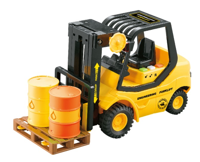 Высокая детализация проработки, реалистичный дизайн и яркая расцветка сделают эту игрушку любимицей ребенка. С ней юный поклонник спецтехники обязательно придумает огромное количество веселых забав, ведь у игрушки много подвижных элементов и функций. В комплект входят вилочный погрузчик с поддоном и бочки.