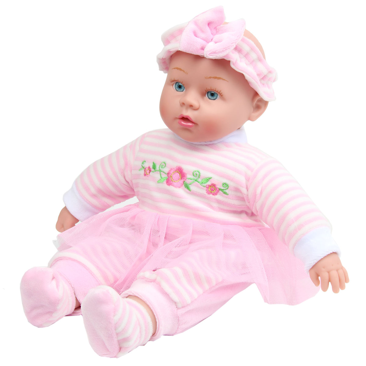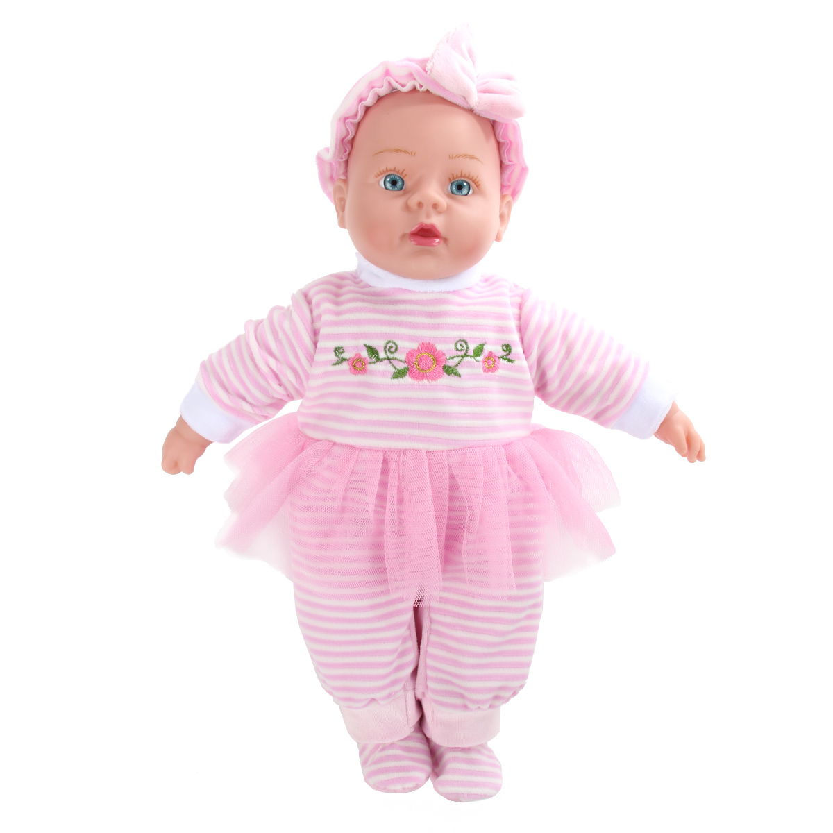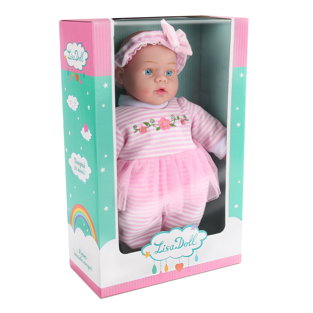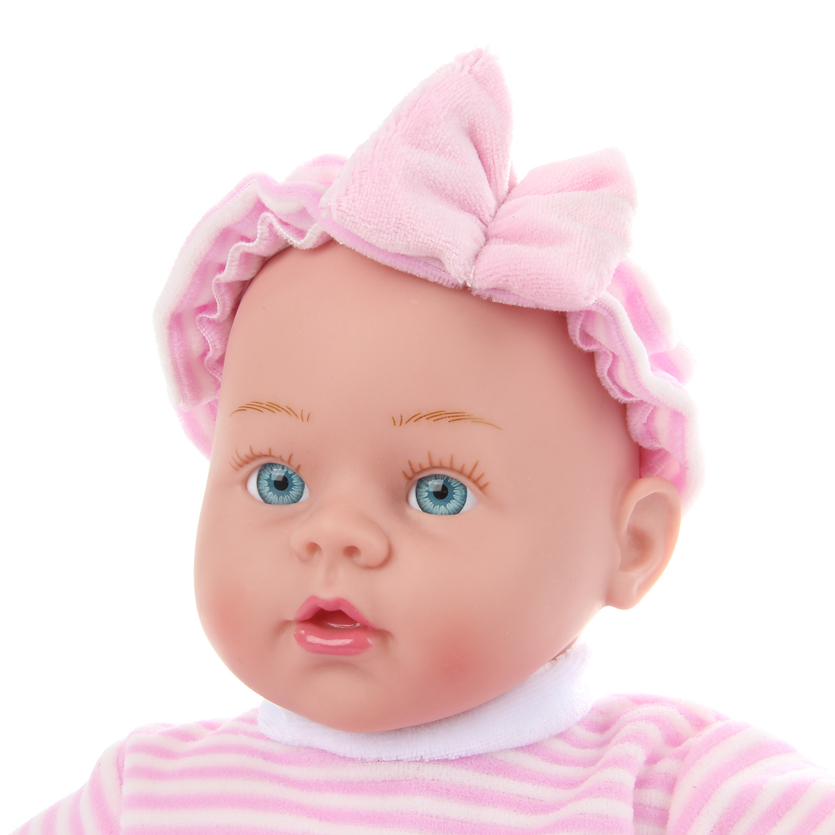 Совсем, как настоящий, очень милый и очаровательный пупс порадует любую девочку! С ним так здорово играть: он знает много фраз, умеет рассказывать веселые стихи, поет колыбельную, стоит нажать на одну из ручек! Пупсик одет в стильный и мягкий комбинезончик и носочки. На голове игрушки красивая повязка с очаровательным бантиком. Тело пупсика мягконабивное, кисти ручек и стопы ножек сделаны из винила. Бровки, реснички нарисованы, глазки не закрываются, ручки, ножки, голова мягкие. Забота о такой кукле научит ребенка ответственности, улучшит коммуникативные и социальные навыки, позволит придумать множество сюжетно-ролевых игр, развивая фантазию! Этот пупсик - великолепный подарок для девочки, с которым она проведет немало веселых и занимательных часов игры! Игрушка работает от 3 батареек АА, в комплект не входят. Изготовлена из винила, аксессуары и наполнитель тела сделаны из текстильных материалов. Размеры пупса: 20*9,5*40 см. Размеры коробки: 24*12*40 см.
