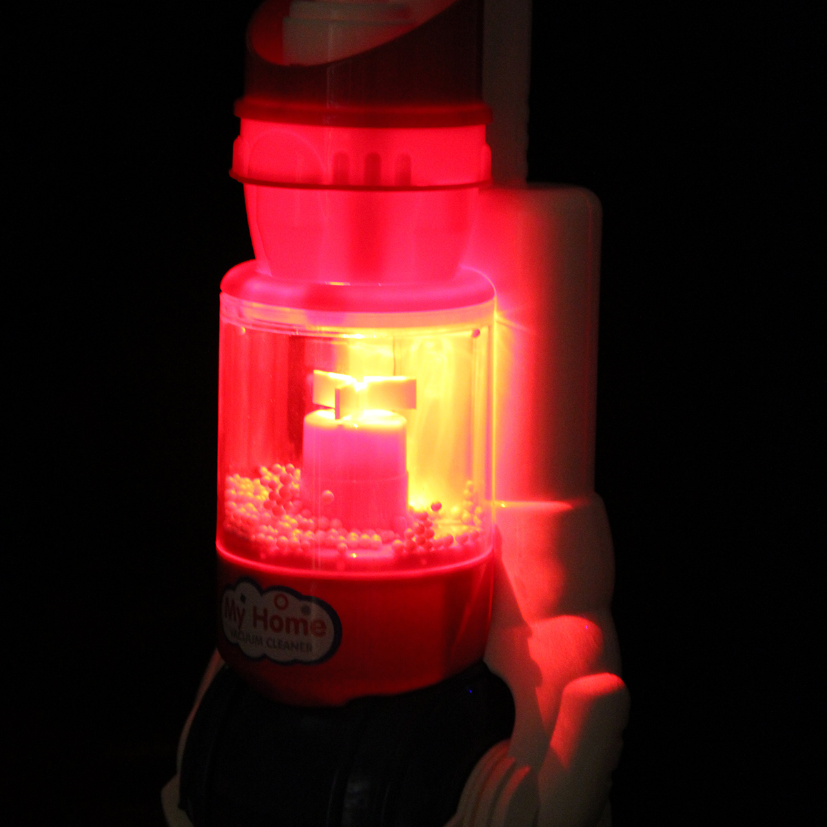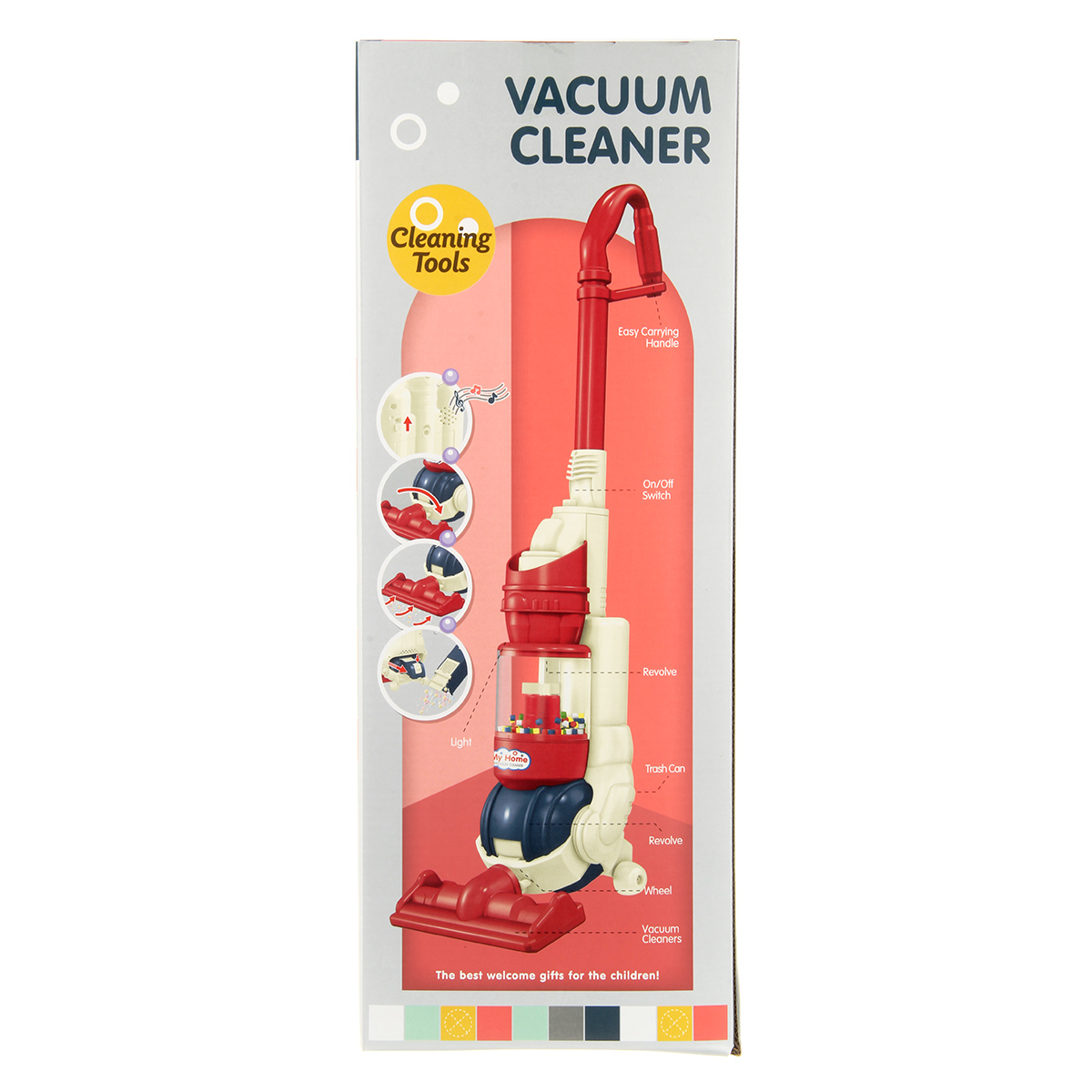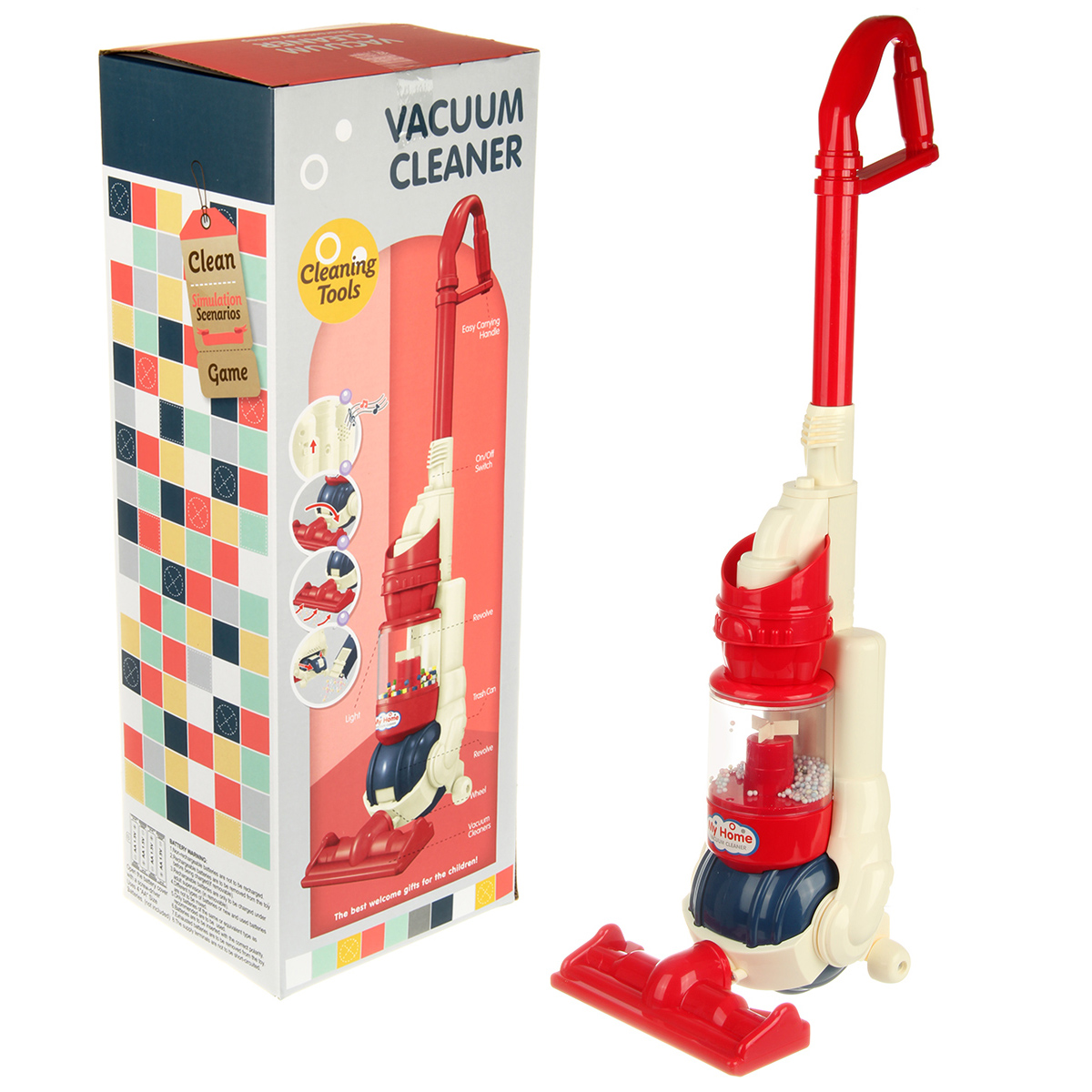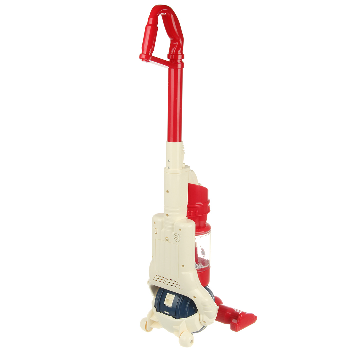 Компактный пылесос на батарейках, умеющий собирать мусор, станет хорошим дополнением коллекции бытовой техники. Игрушечный пылесос с удобной для хвата ручкой и эффектной подсветкой, проигрывает мелодии, благодаря наличию колесиков можно катать за собой.