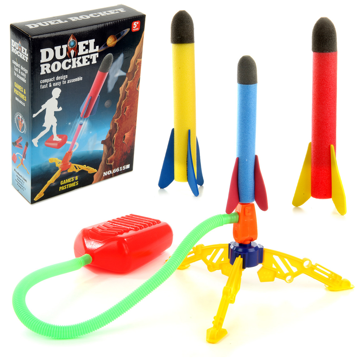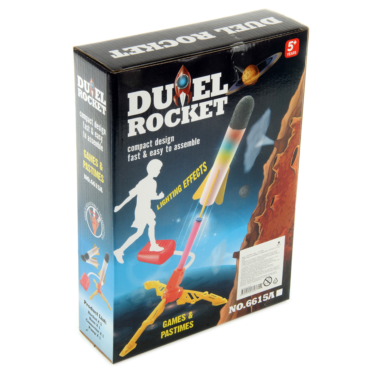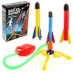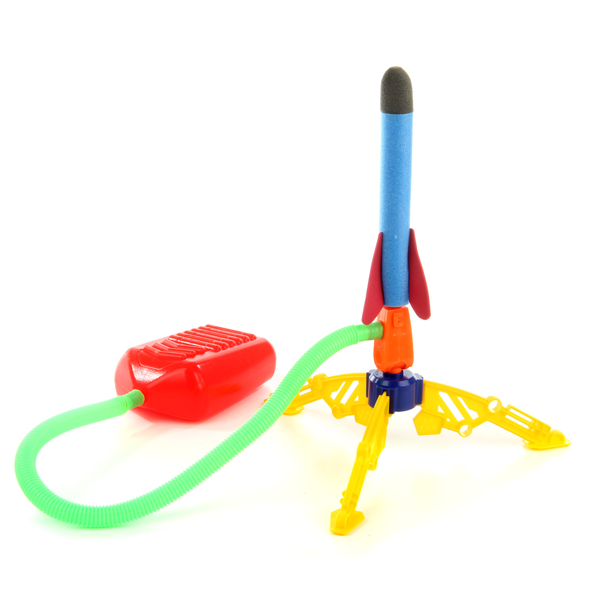 Пусковая установка с ракетой легко собирается и разбирается. При нажатии на педаль происходит выстрел, угол запуска летательного аппарата регулируется.