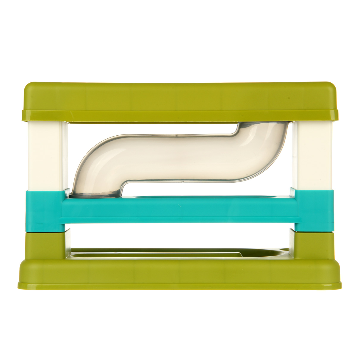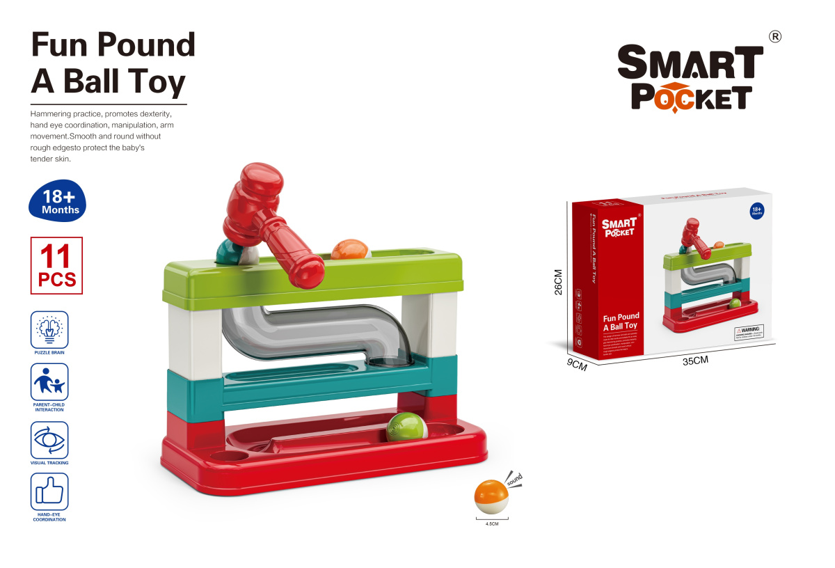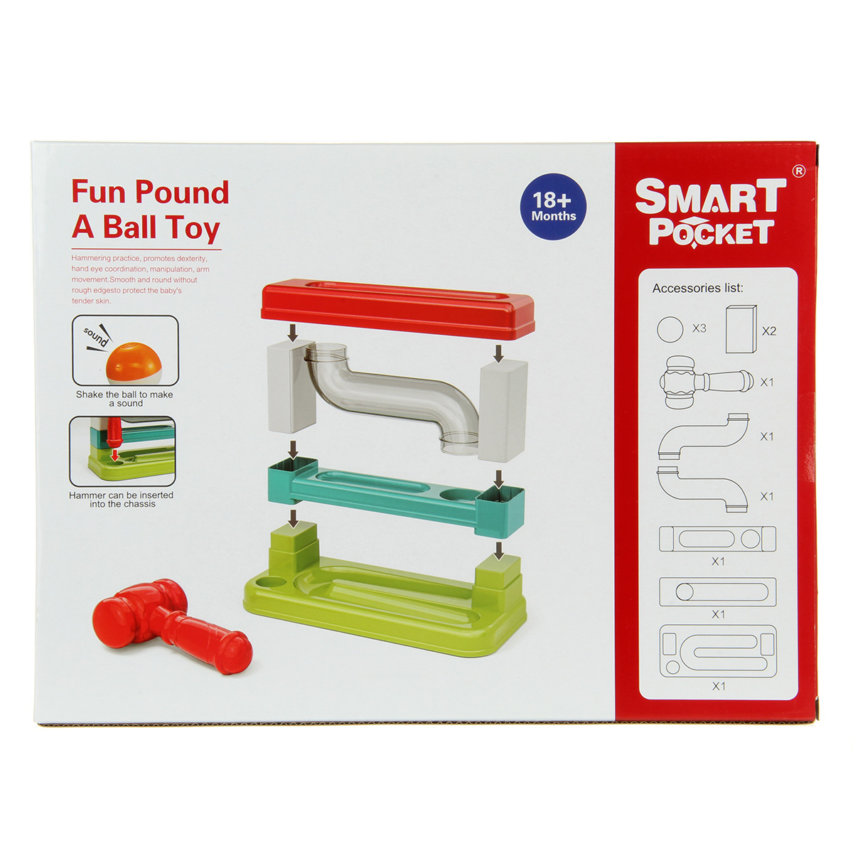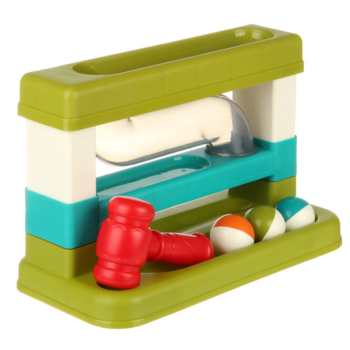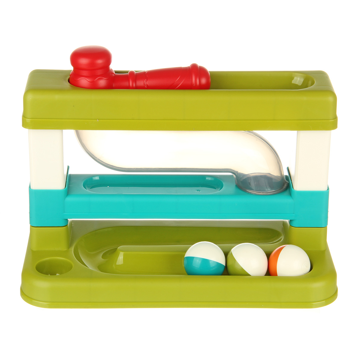 В комплекте 7 деталей для сборки горки, 3 шарика, молоточек.