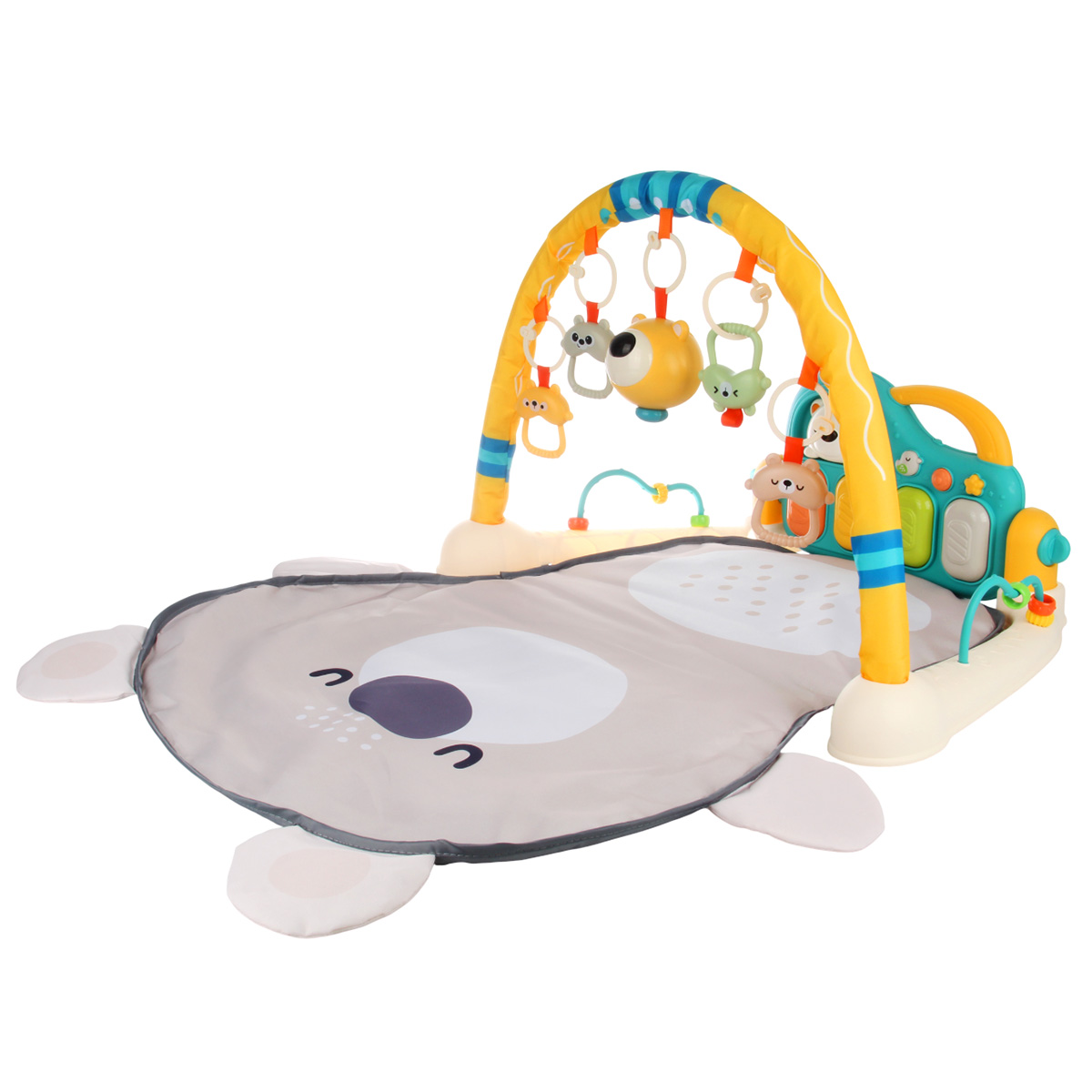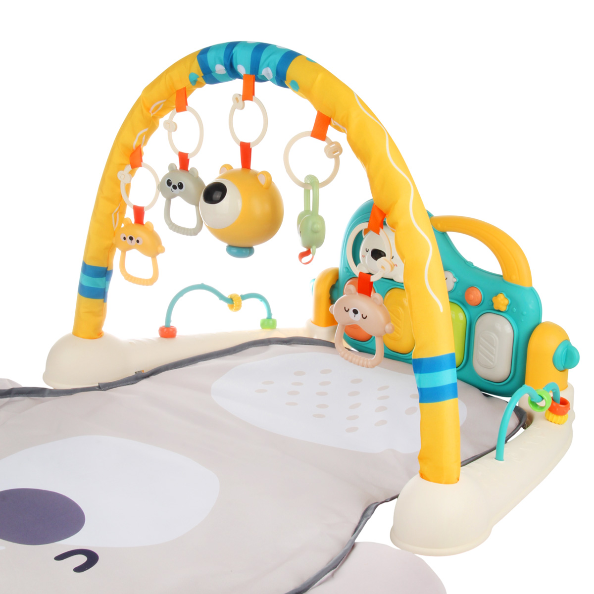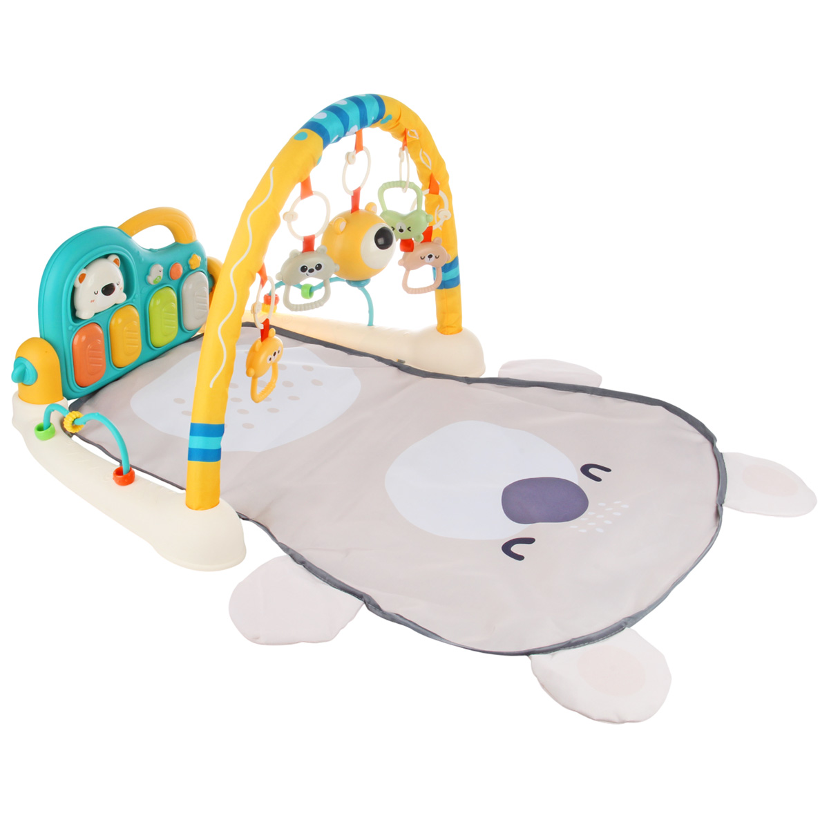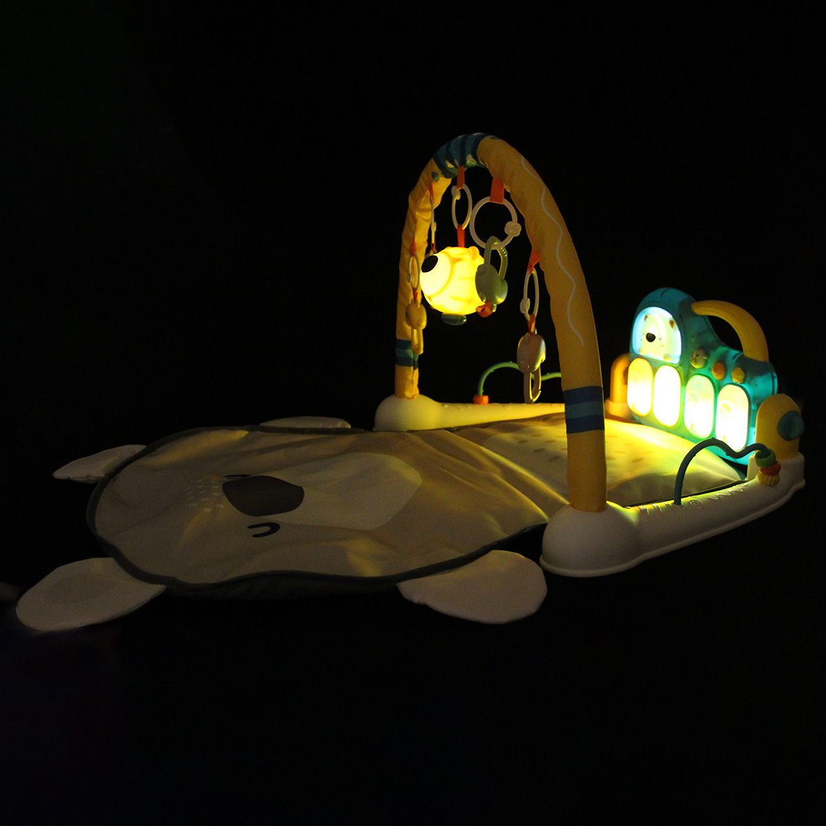 3 в 1, коврик, пианино и коврик с дугой с игрушками. Роскошный развивающий музыкальный коврик для новорожденного со съемными игрушками погремушками, оформленными в милом дизайне. Светильник в виде головы медвежонка, проигрывает колыбельные. Пианино с 3 режимами работы, издает звуки нот, проигрывает более 5 мелодий, достройка мелодий, регулировка уровня громкости. Детский коврик для ползанья имеет мягкую подкладку, легко стирать. Отличное качество исполнения, удобство хранения в разобранном виде. Такой коврик для ползанья отлично подойдет для развития тактильных и слуховых навыков ребёнка, станет замечательным подарком на Новый год и День рождения.