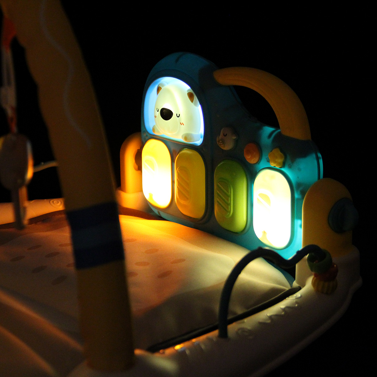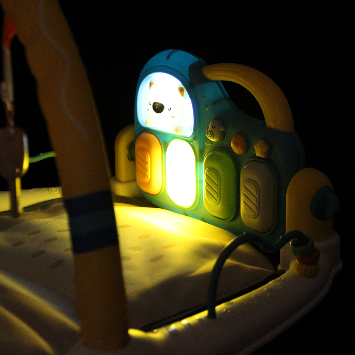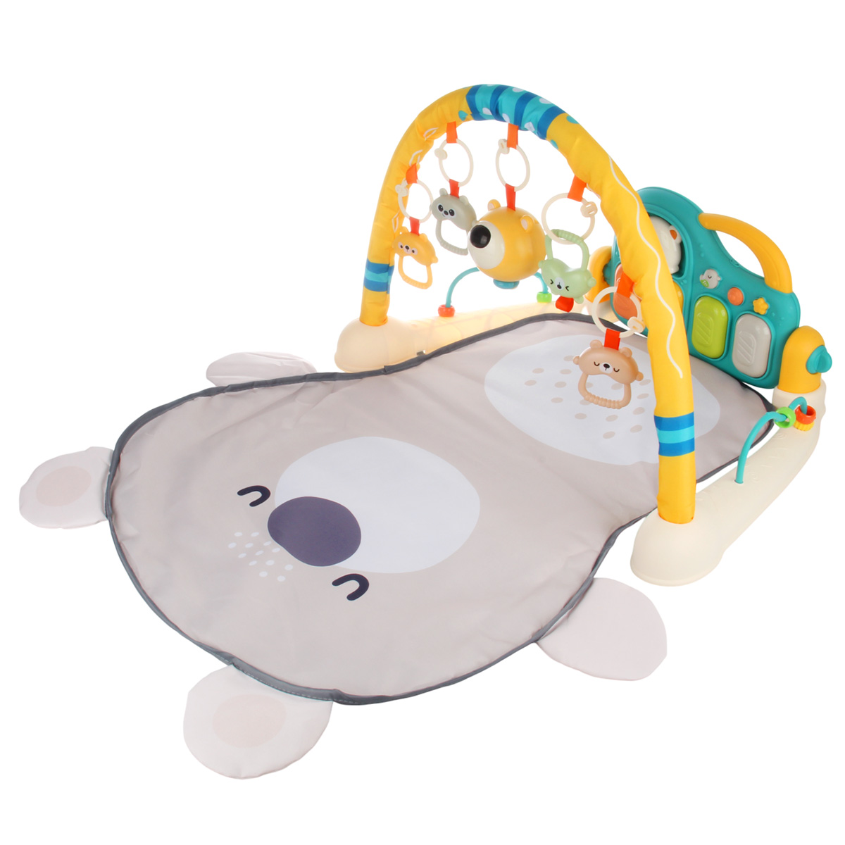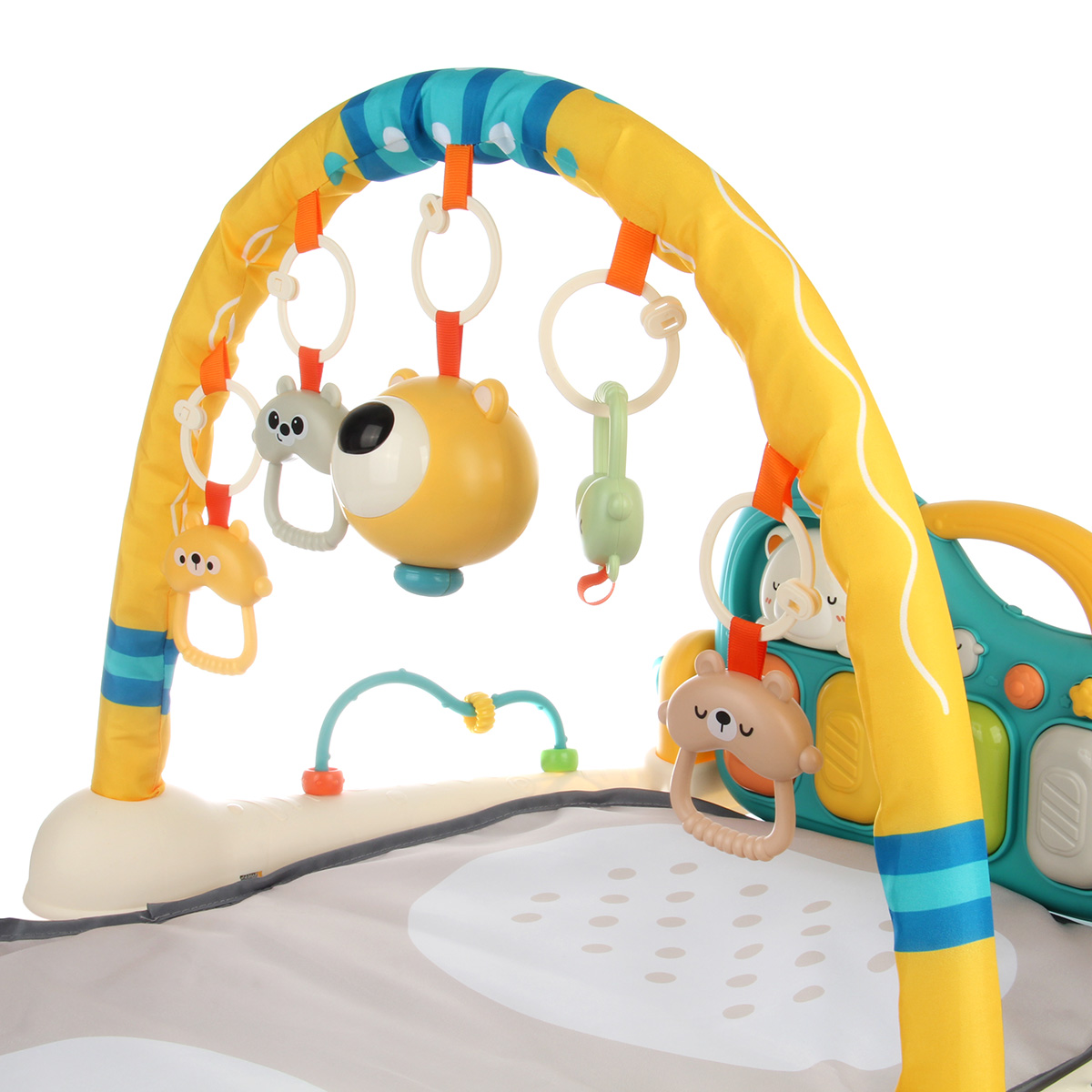 3 в 1, коврик, пианино и коврик с дугой с игрушками. Роскошный развивающий музыкальный коврик для новорожденного со съемными игрушками погремушками, оформленными в милом дизайне. Светильник в виде головы медвежонка, проигрывает колыбельные. Пианино с 3 режимами работы, издает звуки нот, проигрывает более 5 мелодий, достройка мелодий, регулировка уровня громкости. Детский коврик для ползанья имеет мягкую подкладку, легко стирать. Отличное качество исполнения, удобство хранения в разобранном виде. Такой коврик для ползанья отлично подойдет для развития тактильных и слуховых навыков ребёнка, станет замечательным подарком на Новый год и День рождения.